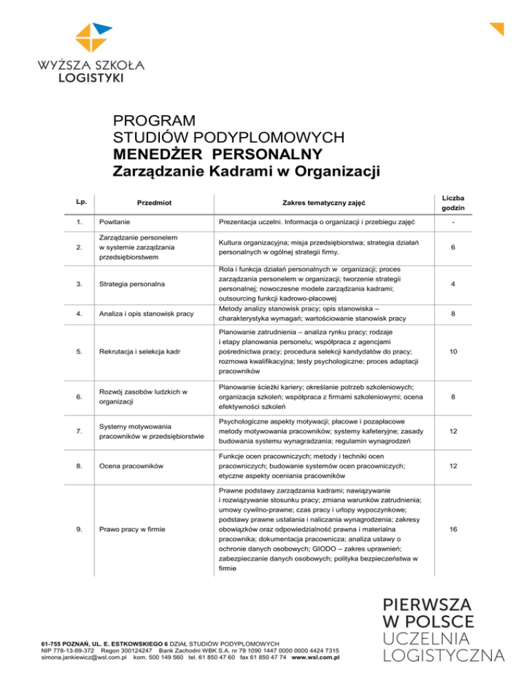 PROGRAM STUDIÓW PODYPLOMOWYCH MENEDŻER PERSONALNY Zarządzanie Kadrami w Organizacji Lp. Przedmiot Zakres tematyczny zajęć Liczba godzin 1. Powitanie Prezentacja uczelni. Informacja o organizacji i przebiegu zajęć - 2. Zarządzanie personelem w systemie zarządzania przedsiębiorstwem Kultura organizacyjna; misja przedsiębiorstwa; strategia działań personalnych w ogólnej strategii firmy. 6 3. Strategia personalna Rola i funkcja działań personalnych w organizacji; proces zarządzania personelem w organizacji; tworzenie strategii personalnej; nowoczesne modele zarządzania kadrami; outsourcing funkcji kadrowo-płacowej 4 4. Analiza i opis stanowisk pracy Metody analizy stanowisk pracy; opis stanowiska – charakterystyka wymagań; wartościowanie stanowisk pracy 8 5. Rekrutacja i selekcja kadr Planowanie zatrudnienia – analiza rynku pracy; rodzaje i etapy planowania personelu; współpraca z agencjami pośrednictwa pracy; procedura selekcji kandydatów do pracy; rozmowa kwalifikacyjna; testy psychologiczne; proces adaptacji pracowników 10 6. Rozwój zasobów ludzkich w organizacji Planowanie ścieżki kariery; określanie potrzeb szkoleniowych; organizacja szkoleń; współpraca z firmami szkoleniowymi; ocena efektywności szkoleń 8 7. Systemy motywowania pracowników w przedsiębiorstwie Psychologiczne aspekty motywacji; płacowe i pozapłacowe metody motywowania pracowników; systemy kafeteryjne; zasady budowania systemu wynagradzania; regulamin wynagrodzeń 12 8. Ocena pracowników Funkcje ocen pracowniczych; metody i techniki ocen pracowniczych; budowanie systemów ocen pracowniczych; etyczne aspekty oceniania pracowników 12 Prawo pracy w firmie Prawne podstawy zarządzania kadrami; nawiązywanie i rozwiązywanie stosunku pracy; zmiana warunków zatrudnienia; umowy cywilno-prawne; czas pracy i urlopy wypoczynkowe; podstawy prawne ustalania i naliczania wynagrodzenia; zakresy obowiązków oraz odpowiedzialność prawna i materialna pracownika; dokumentacja pracownicza; analiza ustawy o ochronie danych osobowych; GIODO – zakres uprawnień; zabezpieczanie danych osobowych; polityka bezpieczeństwa w firmie 16 9. 61-755 POZNAŃ, UL. E. ESTKOWSKIEGO 6 DZIAŁ STUDIÓW PODYPLOMOWYCH NIP 778-13-89-372 Regon 300124247 Bank Zachodni WBK S.A. nr 79 1090 1447 0000 0000 4424 7315 [email protected] kom. 500 149 560 tel. 61 850 47 60 fax 61 850 47 74 www.wsl.com.pl 10. Zobowiązania działu kadr wobec US, ZUS, PERON, GUS Podatek dochodowy od osób fizycznych; zeznania podatkowe; ulgi podatkowe; składki na ubezpieczenie społeczne; zasady sporządzania dokumentów zgłoszeniowych i rozliczeniowych do ZUS; zasady rozliczania wynagrodzeń i zasiłków; obowiązki zakładu pracy wobec PERON i GUS 11. BHP w zakładzie pracy Regulacje prawne z zakresu BHP; ergonomia w środowisku pracy; podstawowe zasady bezpiecznej pracy; współpraca działu personalnego z Państwową Inspekcją Pracy 8 12. Zagrożenia psychospołeczne we współczesnym przedsiębiorstwie Stres i jego konsekwencje dla zdrowia pracowników; wypalenie zawodowe; depresja; przemoc, mobbing i dyskryminacja; zjawiska patologiczne w środowisku pracy – alkohol, narkotyki, nikotyna; warsztat antystresowy 10 Pierwsza pomoc w zakładzie pracy Ocena miejsca zdarzenia; wstępna ocena poszkodowanego; pozycja bezpieczna; resuscytacja krążeniowo –oddechowa; pomoc przy urazach, krwotokach, zadławieniach; psychologiczne aspekty udzielania pierwszej pomocy; ćwiczenia – automatyczna defibrylacja zewnętrzna 16 14. Warsztat rozwoju umiejętności interpersonalnych Skuteczna komunikacja w zespole; asertywność w kierowaniu zespołem; techniki autoprezentacji i wystąpienia publiczne; konflikty w zespole pracowników; zarządzanie sobą w czasie, wpływ społeczny i jego etyczne aspekty; negocjacje i mediacje w zarządzaniu zasobami ludzkimi 44 15. Przywództwo w organizacji Zachowania kierownicze i ich konsekwencje; istota przywództwa; style przywództwa; budowanie zespołów 6 16. Sobotnie spotkanie z gościem Niespodzianka 8 17. Warsztat dyplomowy Grupowe rozwiązywanie problemów personalnych 16 13. RAZEM 61-755 POZNAŃ, UL. E. ESTKOWSKIEGO 6 DZIAŁ STUDIÓW PODYPLOMOWYCH NIP 778-13-89-372 Regon 300124247 Bank Zachodni WBK S.A. nr 79 1090 1447 0000 0000 4424 7315 [email protected] kom. 500 149 560 tel. 61 850 47 60 fax 61 850 47 74 www.wsl.com.pl 12 196