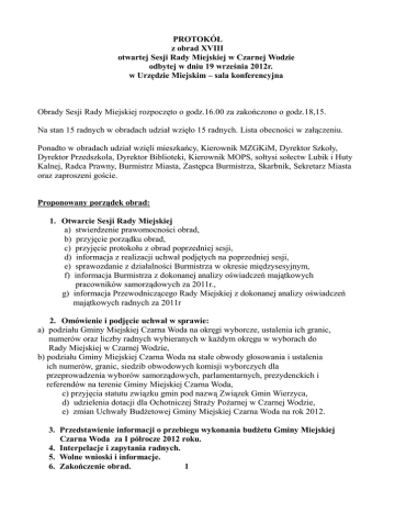 PROTOKÓŁ z obrad XVIII otwartej Sesji Rady Miejskiej w Czarnej Wodzie odbytej w dniu 19 września 2012r. w Urzędzie Miejskim – sala konferencyjna Obrady Sesji Rady Miejskiej rozpoczęto o godz.16.00 za zakończono o godz.18,15. Na stan 15 radnych w obradach udział wzięło 15 radnych. Lista obecności w załączeniu. Ponadto w obradach udział wzięli mieszkańcy, Kierownik MZGKiM, Dyrektor Szkoły, Dyrektor Przedszkola, Dyrektor Biblioteki, Kierownik MOPS, sołtysi sołectw Lubik i Huty Kalnej, Radca Prawny, Burmistrz Miasta, Zastępca Burmistrza, Skarbnik, Sekretarz Miasta oraz zaproszeni goście. Proponowany porządek obrad: 1. Otwarcie Sesji Rady Miejskiej a) stwierdzenie prawomocności obrad, b) przyjęcie porządku obrad, c) przyjęcie protokołu z obrad poprzedniej sesji, d) informacja z realizacji uchwał podjętych na poprzedniej sesji, e) sprawozdanie z działalności Burmistrza w okresie międzysesyjnym, f) informacja Burmistrza z dokonanej analizy oświadczeń majątkowych pracowników samorządowych za 2011r., g) informacja Przewodniczącego Rady Miejskiej z dokonanej analizy oświadczeń majątkowych radnych za 2011r 2. Omówienie i podjęcie uchwał w sprawie: a) podziału Gminy Miejskiej Czarna Woda na okręgi wyborcze, ustalenia ich granic, numerów oraz liczby radnych wybieranych w każdym okręgu w wyborach do Rady Miejskiej w Czarnej Wodzie, b) podziału Gminy Miejskiej Czarna Woda na stałe obwody głosowania i ustalenia ich numerów, granic, siedzib obwodowych komisji wyborczych dla przeprowadzenia wyborów samorządowych, parlamentarnych, prezydenckich i referendów na terenie Gminy Miejskiej Czarna Woda, c) przyjęcia statutu związku gmin pod nazwą Związek Gmin Wierzyca, d) udzielenia dotacji dla Ochotniczej Straży Pożarnej w Czarnej Wodzie, e) zmian Uchwały Budżetowej Gminy Miejskiej Czarna Woda na rok 2012. 3. Przedstawienie informacji o przebiegu wykonania budżetu Gminy Miejskiej Czarna Woda za I półrocze 2012 roku. 4. Interpelacje i zapytania radnych. 5. Wolne wnioski i informacje. 6. Zakończenie obrad. 1 PUNKT 1 Otwarcia obrad XVIII – otwartej Sesji Rady Miejskiej dokonał przewodniczący Rady Miejskiej – Sebastian Schmidt a) Powitał radnych, gości, mieszkańców Czarnej Wody i pozostałe osoby biorące udział w Sesji. Stwierdził prawomocność obrad, na stan 15 radnych obecnych było 15 radnych. Lista obecności stanowi załącznik do protokołu. b) Przewodniczący Rady Miejskiej odczytał proponowany porządek obrad Sesji. Nie wniesiono uwag do porządku obrad i przyjęto jednogłośnie. c) Przewodniczący poinformował, że protokół z obrad poprzedniej sesji został sprawdzony. Radni w wyniku głosowania przyjęli protokół jednogłośnie. d) Przewodniczący przedstawił informację z realizacji uchwał podjętych na ostatniej sesji. Informacja z realizacji uchwał stanowi załącznik do protokołu. e) Burmistrz Miasta przedstawił sprawozdanie z działalności w okresie międzysesyjnym. Sprawozdanie jest załącznikiem do protokołu. Po przedstawieniu sprawozdania Radny Sylweriusz Szatkowski powiedział, że w sprawozdaniu czyta się, że dyrektorem szkoły został pan Józef Milewski a nie został przedstawiony przez Pana Burmistrza. W tym momencie Przewodniczący powiedział, że dyrektor szkoły zostanie przedstawiony i zabierze głos po części formalnej dzisiejszego porządku obrad. Sylweriusz Szatkowski kontynuował, odnosząc się jeszcze do sprawozdania Burmistrza, na jakiej podstawie, mimo że Burmistrz ma takie uprawnienia, że może bez przetargu, czy konkursu nadać funkcję dyrektora. Jednocześnie, Radny Szatkowski podkreślił, że nic nie ma przeciwko obecnemu dyrektorowi. Ale mimo wszystko, zdecydowanie dla Gminy byłoby lepiej gdyby ten konkurs się odbył. Dalej w sprawozdaniu jest napisane, że 21. 05. br. pan Burmistrz podpisał umowę z Agencją „Art-Raf- Music” II Mistrzostwa Grillowanie na Kociewiu, i Radny Szatkowski jest zaskoczony wynagrodzeniem -12.300,00, dodał jeszcze, że sposób prowadzenia pani konferansjerki był żenujący a czasem poniżej krytyki, -mówiąc, że były to także uwagi innych osób. Następna sprawa, to przed blokiem nr 8 przy ul. Mickiewicza (Zory) miała być ułożona kostka brukowa a jej nie ma, jest to nie zgodne z planem. Burmistrz udzielił odpowiedzi na uwagi radnego Sylweriusza Szatkowskiego : - w sprawie wyboru dyrektora szkoły, Burmistrz stwierdził, że ma takie uprawnienia i może podejmować decyzje odnośnie takiego wyboru, więc powierzył to stanowisko Panu Józefowi Milewskiemu, - wysokość wypłaty dla Agencji Artystycznej - był przetarg i wygrała firma, która złożyła najlepszą ofertę. - natomiast co do konferansjerki – to radny Szatkowski sam używał słów dosyć obcesowych i nieładnych prowadząc zorganizowaną przez siebie imprezę piłkarską (40 lat Piłki Nożnej w Czarnej Wodzie). - jeżeli chodzi o ZORY, blok nr 8 to sprawa ta zostanie sprawdzona, chociaż inspektor nadzoru sprawował pieczę nad zgodnością tych robót. f) Burmistrz przedstawił informację z przeprowadzonej kontroli oświadczeń majątkowych pracowników samorządowych za 2011r. (Informacja jest załącznikiem do protokołu). g) Przewodniczący Rady przedstawił informację z dokonanej analizy oświadczeń majątkowych radnych za 2011r. Informacja stanowi załącznik do protokołu. Przewodniczący Rady poprosił pana Józefa Milewskiego, który pełni funkcję dyrektora szkoły o zaprezentowanie siebie. Dyrektor szkoły przedstawił się zebranym, powiedział także o trudnej sytuacji w szkolnictwie oraz co chciałby dokonać w swojej kadencji. PUNKT 2 Omówienie i podjęcie uchwał w sprawie: a) Przewodniczący przedstawił projekt uchwały w sprawie podziału Gminy Miejskiej Czarna Woda na okręgi wyborcze, ustalenia ich granic, numerów oraz liczby radnych wybieranych w każdym okręgu w wyborach do Rady Miejskiej w Czarnej Wodzie. Sekretarz poinformował, 