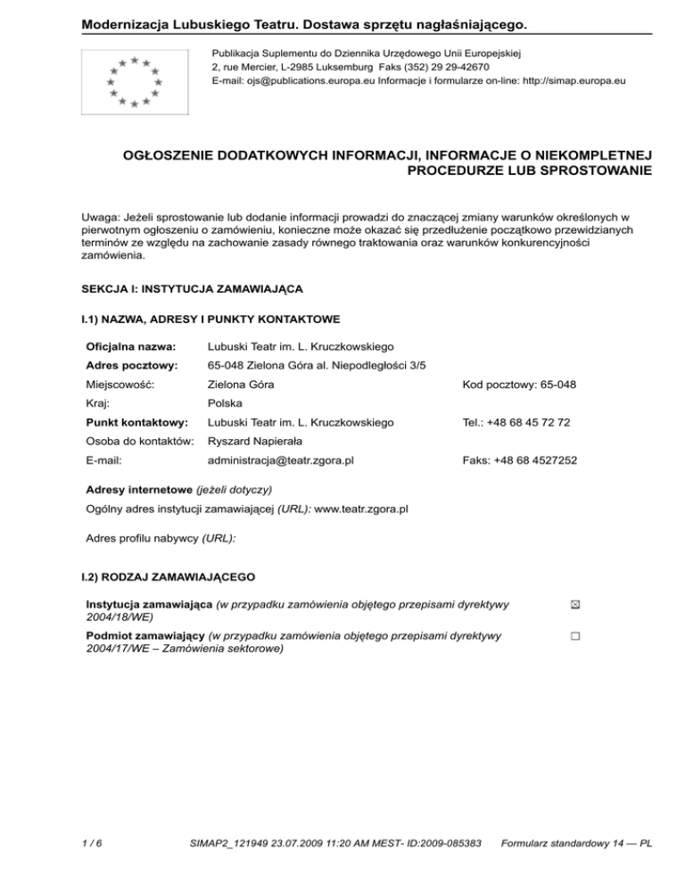 Modernizacja Lubuskiego Teatru. Dostawa sprzętu nagłaśniającego. Publikacja Suplementu do Dziennika Urzędowego Unii Europejskiej 2, rue Mercier, L-2985 Luksemburg Faks (352) 29 29-42670 E-mail: [email protected] Informacje i formularze on-line: http://simap.europa.eu OGŁOSZENIE DODATKOWYCH INFORMACJI, INFORMACJE O NIEKOMPLETNEJ PROCEDURZE LUB SPROSTOWANIE Uwaga: Jeżeli sprostowanie lub dodanie informacji prowadzi do znaczącej zmiany warunków określonych w pierwotnym ogłoszeniu o zamówieniu, konieczne może okazać się przedłużenie początkowo przewidzianych terminów ze względu na zachowanie zasady równego traktowania oraz warunków konkurencyjności zamówienia. SEKCJA I: INSTYTUCJA ZAMAWIAJĄCA I.1) NAZWA, ADRESY I PUNKTY KONTAKTOWE Oficjalna nazwa: Lubuski Teatr im. L. Kruczkowskiego Adres pocztowy: 65-048 Zielona Góra al. Niepodległości 3/5 Miejscowość: Zielona Góra Kraj: Polska Punkt kontaktowy: Lubuski Teatr im. L. Kruczkowskiego Osoba do kontaktów: Ryszard Napierała E-mail: [email protected] Kod pocztowy: 65-048 Tel.: +48 68 45 72 72 Faks: +48 68 4527252 Adresy internetowe (jeżeli dotyczy) Ogólny adres instytucji zamawiającej (URL): www.teatr.zgora.pl Adres profilu nabywcy (URL): ________________________________________ I.2) RODZAJ ZAMAWIAJĄCEGO Instytucja zamawiająca (w przypadku zamówienia objętego przepisami dyrektywy 2004/18/WE) Podmiot zamawiający (w przypadku zamówienia objętego przepisami dyrektywy 2004/17/WE – Zamówienia sektorowe) 1/6 SIMAP2_121949 23.07.2009 11:20 AM MEST- ID:2009-085383 Formularz standardowy 14 — PL Modernizacja Lubuskiego Teatru. Dostawa sprzętu nagłaśniającego. SEKCJA II: PRZEDMIOT ZAMÓWIENIA II.1) OPIS II.1.1) Nazwa nadana zamówieniu przez instytucję zamawiającą (podano w pierwotnym ogłoszeniu) Modernizacja Lubuskiego Teatru. Dostawa sprzętu nagłaśniającego. II.1.2) Krôtki opis (podano w pierwotnym ogłoszeniu) Przedmiotem zamówienia jest dostawa sprzętu oświetleniowego dla scen Lubuskiego Teatru w Zielonej Górze, dostawa i montaż mostów oświetleniowych oraz ułożenie okablowania między tyrystornią a sceną i mostami. Szczegółowy zakres zawarty jest w SIWZ wraz z załącznikami. II.1.3) Wspólny Słownik Zamówień (CPV) (podano w pierwotnym ogłoszeniu) Słownik główny Słownik uzupełniający (jeżeli dotyczy) Główny przedmiot 31500000 ______________________________ Dodatkowe przedmioty 45317000 ______________________________ 44212320 ______________________________ 2/6 SIMAP2_121949 23.07.2009 11:20 AM MEST- ID:2009-085383 Formularz standardowy 14 — PL Modernizacja Lubuskiego Teatru. Dostawa sprzętu nagłaśniającego. SEKCJA IV: PROCEDURA IV.1) RODZAJ PROCEDURY IV.1.1) Rodzaj procedury (podano w pierwotnym ogłoszeniu) Otwarta Ograniczona Ograniczona przyspieszona Negocjacyjna Negocjacyjna przyspieszona Dialog konkurencyjny IV.2) INFORMACJE ADMINISTRACYJNE IV.2.1) Numer referencyjny nadany sprawie przez instytucję zamawiającą /podmiot zamawiający (podano w pierwotnym ogłoszeniu, o ile dotyczy) 05/ZA/2009 IV.2.2) Dane referencyjne ogłoszenia w przypadku ogłoszeń przesłanych drogą elektroniczną (jeżeli są znane): Pierwotne ogłoszenie przesłane przez: SIMAP OJS eSender Login: SIMAP2_121949 Dane referencyjne ogłoszenia: 2009-085161 (rok i numer dokumentu) IV.2.3) Ogłoszenie, którego dotyczy niniejsza publikacja (jeżeli dotyczy) _________________ z dnia __________ IV.2.4) Data wysłania niniejszego ogłoszenia: 22/07/2009 3/6 SIMAP2_121949 23.07.2009 11:20 AM MEST- ID:2009-085383 Formularz standardowy 14 — PL Modernizacja Lubuskiego Teatru. Dostawa sprzętu nagłaśniającego. SEKCJA VI: INFORMACJE UZUPEŁNIAJĄCE VI.1) OGŁOSZENIE DOTYCZY (o ile ma zastosowanie; zaznaczyć tyle punktów, ile jest to konieczne) Procedury niepełnej Sprostowania Informacji dodatkowych VI.2) INFORMACJE NA TEMAT NIEPEŁNEJ PROCEDURY UDZIELENIA ZAMÓWIENIA (o ile ma zastosowanie; zaznaczyć tyle punktów, ile jest to konieczne) Postępowanie o udzielenie zamówienia została przerwane. Postępowanie o udzielenie zamówienia uznano za nieskuteczne. Zamówienia nie udzielono. Zamówienie może być przedmiotem ponownej publikacji. VI.3) INFORMACJE DO POPRAWIENIA LUB DODANIA (o ile dotyczy; należy określić miejsce, w którym tekst lub daty mają być zmienione lub dodane, proszę zawsze podawać odpowiedni numer sekcji i akapitu pierwotnego ogłoszenia) VI.3.1 Zmiana oryginalnej informacji lub publikacja w witrynie TED niezgodna z oryginalnymi informacjami. Zmiana oryginalnej informacji podanej przez instytucję zamawiającą Publikacja w witrynie TED niezgodna z oryginalną informacją, przekazaną przez instytucję zamawiającą W obu przypadkach VI.3.2 Ogłoszenie lub odpowiednia dokumentacja przetargowa W ogłoszeniu pierwotnym W odpowiedniej dokumentacji przetargowej "więcej informacji w odpowiedniej dokumentacji przetargowej" W obu przypadkach "więcej informacji w odpowiedniej dokumentacji przetargowej" VI.3.3) Tekst, który należy poprawić w pierwotnym ogłoszeniu (jeżeli dotyczy) Miejsce, w którym znajduje się zmieniany tekst: ____________________ ____________________ Zamiast: Powinno być: _________________________ _________________________ _________________________ _________________________ VI.3.4) Daty, które należy poprawić w pierwotnym ogłoszeniu (jeżeli dotyczy) Miejsce, w którym znajdują się zmieniane daty: ____________________ 4/6 Zamiast: (dd/mm/rrrr) __________ Powinno być: (gg:mm) _____ SIMAP2_121949 23.07.2009 11:20 AM MEST- ID:2009-085383 (dd/mm/rrrr) __________ (gg:mm) _____ Formularz standardowy 14 — PL Modernizacja Lubuskiego Teatru. Dostawa sprzętu nagłaśniającego. ____________________ 5/6 (dd/mm/rrrr) (gg:mm) SIMAP2_121949 23.07.2009 11:20 AM MEST- ID:2009-085383 (dd/mm/rrrr) (gg:mm) Formularz standardowy 14 — PL Modernizacja Lubuskiego Teatru. Dostawa sprzętu nagłaśniającego. VI.3.5) Adresy i punkty kontaktowe, które należy