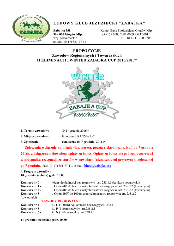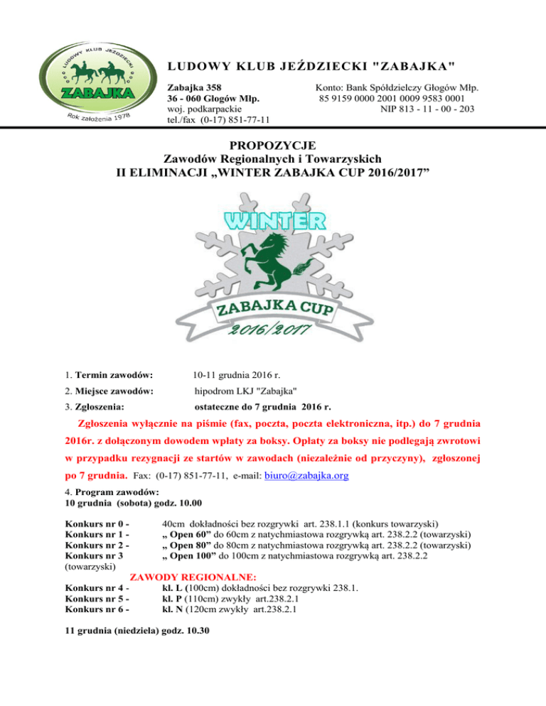LUDOWY KLUB JEŹDZIECKI "ZABAJKA" Zabajka 358 36 - 060 Głogów Młp. woj. podkarpackie tel./fax (0-17) 851-77-11 Konto: Bank Spółdzielczy Głogów Młp. 85 9159 0000 2001 0009 9583 0001 NIP 813 - 11 - 00 - 203 PROPOZYCJE Zawodów Regionalnych i Towarzyskich II ELIMINACJI „WINTER ZABAJKA CUP 2016/2017” 1. Termin zawodów: 10-11 grudnia 2016 r. 2. Miejsce zawodów: hipodrom LKJ "Zabajka" 3. Zgłoszenia: ostateczne do 7 grudnia 2016 r. Zgłoszenia wyłącznie na piśmie (fax, poczta, poczta elektroniczna, itp.) do 7 grudnia 2016r. z dołączonym dowodem wpłaty za boksy. Opłaty za boksy nie podlegają zwrotowi w przypadku rezygnacji ze startów w zawodach (niezależnie od przyczyny), zgłoszonej po 7 grudnia. Fax: (0-17) 851-77-11, e-mail: [email protected] 4. Program zawodów: 10 grudnia (sobota) godz. 10.00 Konkurs nr 0 Konkurs nr 1 Konkurs nr 2 Konkurs nr 3 (towarzyski) Konkurs nr 4 Konkurs nr 5 Konkurs nr 6 - 40cm dokładności bez rozgrywki art. 238.1.1 (konkurs towarzyski) „ Open 60” do 60cm z natychmiastowa rozgrywką art. 238.2.2 (towarzyski) „ Open 80” do 80cm z natychmiastowa rozgrywką art. 238.2.2 (towarzyski) „ Open 100” do 100cm z natychmiastowa rozgrywką art. 238.2.2 ZAWODY REGIONALNE: kl. L (100cm) dokładności bez rozgrywki 238.1. kl. P (110cm) zwykły art.238.2.1 kl. N (120cm zwykły art.238.2.1 11 grudnia (niedziela) godz. 10.30 40cm dokładności bez rozgrywki art. 238.1.1 (konkurs towarzyski) „ Open 60” do 60cm z natychmiastowa rozgrywką art. 238.2.2 (towarzyski) „ Open 80” do 80cm z natychmiastowa rozgrywką art. 238.2.2 (towarzyski) „ Open 100” do 100cm z natychmiastowa rozgrywką art. 238.2.2 Konkurs nr 0 Konkurs nr 7 Konkurs nr 8 Konkurs nr 9 (towarzyski) ZAWODY REGIONALNE: Konkurs nr 10 kl. L (100cm) dokładności bez rozgrywki 238.1.1 Konkurs nr 11 kl. P (110cm) zwykły art.238.2. 1 KONKURSY 1,2,3,7,8,9 zaliczane do I eliminacji „WINTER ZABAJKA CUP 2016/2017” Pozostałe konkursy to zawody regionalne. Sobota godz. 20.00 OGNISKO DLA WSZYSTKICH ZAWODNIKÓW, TRENERÓW, LUZAKÓW, SZEFÓW EKIP, WŁAŚCICIELI KONI, SĘDZIÓW 6. OPŁATY Opłaty za start - tylko w „WINTER ZABAJKA CUP” opłata od zawodnika 100zł + boks 80zł od konia za całe zawody - „WINTER ZABAJKA CUP” + ZAWODY REGIONALNE opłata od zawodnika 130zł + boks 80zł od konia za całe zawody - ZAWODY REGIONALNE opłata od zawodnika 130zł + boks 80zł od konia za całe zawody - start za 1 dzień zawodów („WINTER ZABAJKA CUP” lub „WINTER ZABAJKA CUP” + ZAWODY REGIONALNE) 110zł od konia (w tym boks) Boksy przygotowane od 9 grudnia 2016 r., godz. 16.00. Wpłaty można przelać na konto Bank Spółdzielczy Głogów Młp. 85 9159 0000 2001 0009 9583 0001 Opłata organizacyjna musi być uregulowana na godzinę przed rozpoczęciem pierwszego konkursu. W przypadku nieuregulowania opłat, do startu nie zostanie dopuszczona cała ekipa. - cisza nocna w stajni od godz. 22.00 – 6.00 - prosimy o przestrzeganie przepisów BHP i p.poż. 7. Zakwaterowanie: Zawodnicy, szefowie ekip, trenerzy, luzacy – noclegi na własny koszt. Można dokonać rezerwacji w LKJ „Zabajka”: -stare domki 2- osobowe: cena 50zł z własnymi śpiworami; -nowe domki 2-osobowe: cena 70zł nowy domek 4-osobowy: cena 140zł -w 6 pokojach gościnnych po 2osobowy – 90zł 3osobowy – 135zł Wyżywienie: We własnym zakresie w Gospodzie Wiśta-wio! na terenie zawodów. zawody odbywać się będą na hali 8. Warunki techniczne: tor konkursowy, wymiary: 25 x 56 [m]– podłoże piaszczyste z flizeliną rozprężania, wymiary: 12 x 25 [m] – podłoże piaszczyste 9. Klasyfikacja ogólna: - flots dla 25% startujących w konkursie, - po każdym konkursie odbędzie się dekoracja zwycięzców. nie przewiduje się zebrania technicznego 10. Zebranie techniczne: Sprawdzanie dokumentów koni i zawodników odbędzie się w biurze zawodów w dniu 10 grudnia 2016 r.(sobota) godz. 8.00. 11. Uczestnictwo: W „WINTER ZABAJKA CUP”: Zgodnie z Regulaminem „WINTER ZABAJKA CUP” 12. Osoby oficjalne: Komisja sędziowska: Przewodniczący WZJ / Styl: Komisarz: III: Gospodarz toru: Lekarz weterynarii: A.Kloc K. Bącal B. Galuba D. Zakrzewska, W.Wiater, A. Galuba dr Jacek Sołtyski, Tel.: 500 049 955 13. Informacje ogólne: Zawody odbywają się wg aktualnych przepisów i regulaminów PZJ Odpowiedzialność: Organizatorzy nie ponoszą odpowiedzialności z tytułu wypadków i zachorowań trenerów, zawodników, luzaków i koni, jak również w przypadku kradzieży, zniszczeń, pożarów i innych wydarzeń wynikłych w czasie transportu i trwania zawodów. Organizacja zawodów: W nadzwyczajnych okolicznościach nieprzewidzianych organizator zastrzega sobie prawo do odwołania zwodów. Ubezpieczenie: przepisami, Przypominamy o obowiązkowym ubezpieczeniu NNW zawodników oraz aktualnych badaniach zawodników. Wstęp do stajni: Poza osobami oficjalnymi, prawo wstępu do stajni mają tylko: szefowie ekip, trenerzy, zawodnicy, luzacy, właściciele koni. 14. Listy startowe: Dokonanie zmian na listach startowych (po ich wywieszeniu) za zgodą Sędziego Głównego – 0 zł. 15. Protesty i skargi (art. 65 i art.66 Przepisów ogólnych PZJ) Każdy protest i skarga, ażeby były ważne, muszą być zgłoszone na piśmie z dołączeniem kaucji w wysokości 200 PLN. KODEKS POSTĘPOWANIA Z KONIEM I. Na wszystkich etapach treningu i przygotowań konia do startu w zawodach, dobro konia musi stać ponad wszelkimi innymi wymaganiami. Dotyczy to stałej opieki, metod treningu, starannego obrządku, kucia i transportu. II. Konie i jeźdźcy muszą być wytrenowani, kompetentni i zdrowi zanim wezmą udział w zawodach. Odnosi się to także do podawania leków środków medycznych, zabiegów chirurgicznych zagrażających dobru konia lub ciąży klaczy, oraz do przypadków nadużywania przemocy. III. Zawody nie mogą zagrażać dobru konia. Wymaga to zwrócenie szczególnej uwagi na teren zawodów, powierzchnię podłoża, pogod