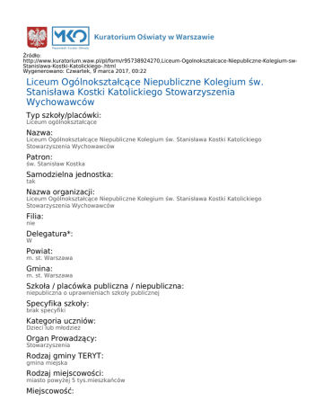 Źródło: http://www.kuratorium.waw.pl/pl/form/r95738924270,Liceum-Ogolnoksztalcace-Niepubliczne-Kolegium-swStanislawa-Kostki-Katolickiego-.html Wygenerowano: Czwartek, 9 marca 2017, 00:22 Liceum Ogólnokształcące Niepubliczne Kolegium św. Stanisława Kostki Katolickiego Stowarzyszenia Wychowawców Typ szkoły/placówki: Liceum ogólnokształcące Nazwa: Liceum Ogólnokształcące Niepubliczne Kolegium św. Stanisława Kostki Katolickiego Stowarzyszenia Wychowawców Patron: św. Stanisław Kostka Samodzielna jednostka: tak Nazwa organizacji: Liceum Ogólnokształcące Niepubliczne Kolegium św. Stanisława Kostki Katolickiego Stowarzyszenia Wychowawców Filia: nie Delegatura*: W Powiat: m. st. Warszawa Gmina: m. st. Warszawa Szkoła / placówka publiczna / niepubliczna: niepubliczna o uprawnieniach szkoły publicznej Specyfika szkoły: brak specyfiki Kategoria uczniów: Dzieci lub młodzież Organ Prowadzący: Stowarzyszenia Rodzaj gminy TERYT: gmina miejska Rodzaj miejscowości: miasto powyżej 5 tys.mieszkańców Miejscowość: WARSZAWA Ulica: Bobrowiecka 9 (bud. A) Kod: 00-728 Telefon: 225592110 E-mail: [email protected] Strona WWW: www.kolegium-ksw.edu.pl ● ● * W – m.st. Warszawa i powiaty okołowarszawskie: grodziski, legionowski, miński, nowodworski, otwocki, piaseczyński, pruszkowski, sochaczewski, warszawski zachodni, wołomiński, żyrardowski DCI - Delegatura w Ciechanowie DOS - Delegatura w Ostrołęce DPŁ – Delegatura w Płocku DRA - Delegatura w Radomiu DSI – Delegatura w Siedlcach ** Pozycje: patron, nr telefonu, adres e-mail, strona www, ulica, nr domu, rodzaj miejscowości, dzielnica są nieobowiązkowe, stąd jeśli szkoła/placówka nie wypełniła tego pola w Systemie Informacji Oświatowej, to nie będą one widoczne w wyszukiwarce.