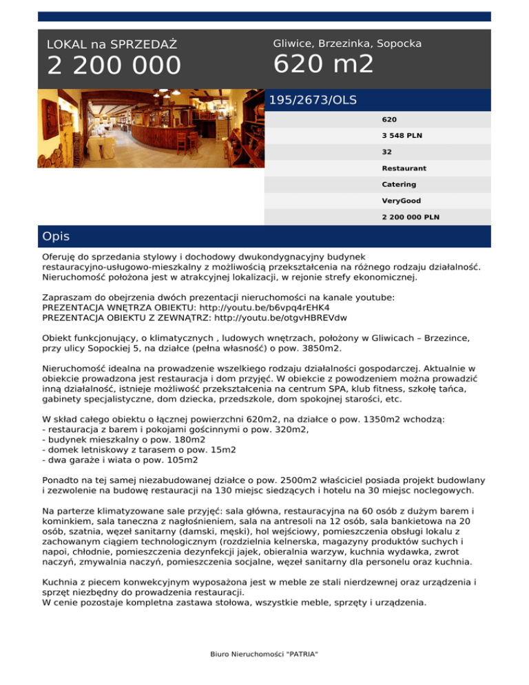 LOKAL na SPRZEDAŻ 2 200 000 Gliwice, Brzezinka, Sopocka 620 m2 195/2673/OLS 620 3 548 PLN 32 Restaurant Catering VeryGood 2 200 000 PLN Opis Oferuję do sprzedania stylowy i dochodowy dwukondygnacyjny budynek restauracyjno-usługowo-mieszkalny z możliwością przekształcenia na różnego rodzaju działalność. Nieruchomość położona jest w atrakcyjnej lokalizacji, w rejonie strefy ekonomicznej. Zapraszam do obejrzenia dwóch prezentacji nieruchomości na kanale youtube: PREZENTACJA WNĘTRZA OBIEKTU: http://youtu.be/b6vpq4rEHK4 PREZENTACJA OBIEKTU Z ZEWNĄTRZ: http://youtu.be/otgvHBREVdw Obiekt funkcjonujący, o klimatycznych , ludowych wnętrzach, położony w Gliwicach – Brzezince, przy ulicy Sopockiej 5, na działce (pełna własność) o pow. 3850m2. Nieruchomość idealna na prowadzenie wszelkiego rodzaju działalności gospodarczej. Aktualnie w obiekcie prowadzona jest restauracja i dom przyjęć. W obiekcie z powodzeniem można prowadzić inną działalność, istnieje możliwość przekształcenia na centrum SPA, klub fitness, szkołę tańca, gabinety specjalistyczne, dom dziecka, przedszkole, dom spokojnej starości, etc. W skład całego obiektu o łącznej powierzchni 620m2, na działce o pow. 1350m2 wchodzą: - restauracja z barem i pokojami gościnnymi o pow. 320m2, - budynek mieszkalny o pow. 180m2 - domek letniskowy z tarasem o pow. 15m2 - dwa garaże i wiata o pow. 105m2 Ponadto na tej samej niezabudowanej działce o pow. 2500m2 właściciel posiada projekt budowlany i zezwolenie na budowę restauracji na 130 miejsc siedzących i hotelu na 30 miejsc noclegowych. Na parterze klimatyzowane sale przyjęć: sala główna, restauracyjna na 60 osób z dużym barem i kominkiem, sala taneczna z nagłośnieniem, sala na antresoli na 12 osób, sala bankietowa na 20 osób, szatnia, węzeł sanitarny (damski, męski), hol wejściowy, pomieszczenia obsługi lokalu z zachowanym ciągiem technologicznym (rozdzielnia kelnerska, magazyny produktów suchych i napoi, chłodnie, pomieszczenia dezynfekcji jajek, obieralnia warzyw, kuchnia wydawka, zwrot naczyń, zmywalnia naczyń, pomieszczenia socjalne, węzeł sanitarny dla personelu oraz kuchnia. Kuchnia z piecem konwekcyjnym wyposażona jest w meble ze stali nierdzewnej oraz urządzenia i sprzęt niezbędny do prowadzenia restauracji. W cenie pozostaje kompletna zastawa stołowa, wszystkie meble, sprzęty i urządzenia. Biuro Nieruchomości "PATRIA" Lokal posiada niepowtarzalny, klimatyczny wystrój wnętrz, w którym dominują motywy ludowe, a sama restauracja słynie z domowej atmosfery i jedzenia. W stylowych wnętrzach organizowane są imprezy okolicznościowe typu wesela, komunie, szkolenia, imprezy firmowe, urodzinowe, konferencje, studniówki, zabawy sylwestrowe, andrzejkowe, jubileusze, catering, etc. Dodatkowo na parterze ogródek piwny z parasolami. Na piętrze dwa wyposażone pokoje gościnne z łazienkami. Z tyłu obiektu domek letniskowy z tarasem. Z obiektem połączony jest przejściem od strony zaplecza kuchennego piętrowy dom mieszkalny o pow. użytkowej 180m2. Na parterze: wiatrołap, sauna, prysznic z wc, hol, kuchnia, duży salon Na piętrze: 3 pokoje, łazienka Media: woda, prąd, siła, kanalizacja. Cały obiekt z budynkiem mieszkalnym ogrzewany piecem węglowym, w restauracji dodatkowo kominek. Teren nieruchomości w całości ogrodzony krzewami bukszpanu i tujami (od frontu ogrodzenie metalowe kute), oświetlony, bardzo ładnie zagospodarowany, miejsce na grilla, plac zabaw dla dzieci, oczko wodne. Zadbany ogród z mnóstwem niezwykłych roślin i drzew owocowych. Na terenie obiektu duży parking na 20 samochodów. Lokal posiada zamówienia na imprezy okolicznościowe do końca 2017 oraz na 2018 i 2019r. Serdecznie polecam i zapraszam do obejrzenia i nabycia nieruchomości – bardzo blisko (6km) od centrum miasta. Nieruchomość w bardzo dobrym stanie technicznym, idealna na prowadzenie wszelkiego rodzaju działalności gospodarczej. Bardzo dobra lokalizacja, blisko DK88 (droga łącząca wszystkie miasta aglomeracji śląskiej), w niedalekiej odległości węzeł Sośnica , który jest bardzo ważnym strategicznym miejscem ruchu transportowego, gdzie krzyżują się A1 z A4. Bliskie położenie nieruchomości w pobliżu strefy przemysłowej (dużo firm transportowych) umożliwia zaopatrywanie w catering pobliskie firmy. Nieruchomość zlokalizowana jest w sąsiedztwie apteki, niedaleko przychodnia, przedszkole, szkoła, gimnazjum, biblioteka, poczta, kościół, sklep spożywczy. Oferujemy dogodne warunki kredytowe przy zakupie nieruchomości i pomagamy w załatwieniu formalności związanych z uzyskaniem kredytu hipotecznego, firmowego i inwestycyjnego. Agent nieruchomości zainteresowany tą ofertą dla swojego klienta proszony jest o kontakt. Chętnie uzgodnimy warunki współpracy z RE/MAX przy sprzedaży. CAŁOŚĆ KOSZTÓW POŚREDNICTWA POKRYWA WŁAŚCICIEL NIERUCHOMOŚCI – KUPUJĄCY NIE PŁACI WYNAGRODZENIA AGENCJI. Dodatkowe 65 zdjęć, filmy i plan nieruchomości na stronach: www.remax-gold.pl lub www.remax-polska.pl/marta_kulawik Nr licencji zawodowej 11919 Agent prowadzący: Marta Kulawik Biuro Nieruchomości "PATRIA" Tel.: +48 665 167 906 e-mail: [email protected] www.remax-gold.pl http://www.remax-polska.pl/marta_kulawik RE/MAX Gold ul. Kopernika 26 40-064 Katowice Tel.: +48 32 776 01 70 e-mail: [email protected] www.remax-gold.pl www.remax-polska.pl/gold Biuro Nieruchomości "PATRIA" tel. 91 4886426, 91 4886427, 507 124 122 email: [email protected] Biuro Nieruchomości "PATRIA" Powered by TCPDF (www.tcpdf.org)