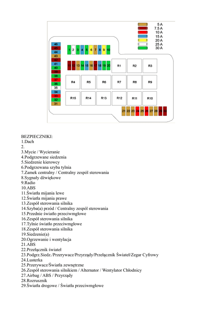 BEZPIECZNIKI: 1.Dach 2. 3.Mycie / Wycieranie 4.Podgrzewane siedzenia 5.Siedzenie kierowcy 6.Podgrzewana szyba tylnia 7.Zamek centralny / Centralny zespól sterowania 8.Sygnały dźwiękowe 9.Radio 10.ABS 11.Światła mijania lewe 12.Światła mijania prawe 13.Zespół sterowania silnika 14.Szyba(a) przód / Centralny zespól sterowania 15.Przednie światło przeciwmgłowe 16.Zespół sterowania silnika 17.Tylnie światło przeciwmgłowe 18.Zespół sterowania silnika 19.Siedzenie(a) 20.Ogrzewanie i wentylacja 21.ABS 22.Przełącznik świateł 23.Podgrz.Siedz./Przerywacz/Przyrządy/Przełącznik Świateł/Zegar Cyfrowy 24.Lusterka 25.Przerywacz/Światła zewnętrzne 26.Zespół sterowania silnikiem / Alternator / Wentylator Chłodnicy 27.Airbag / ABS / Przyrządy 28.Rozrusznik 29.Światła drogowe / Światła przeciwmgłowe 30.Światła drogowe / Światła przeciwmgłowe 31.Silnik rozruchowy / Komputer Pokładowy / Układ Alarmowy / Immobilizer / Przyrządy / Zegar / Moduł sterowania nadwozia 32.Przedział dla pasażerów 33.Moduł sterowania nadwozia / Boczne światła / Światło tablicy rejestracyjnej / Przełącznik świateł / Tylnie lampy / Lampy wewnętrzne 34.Światła awaryjne / Czujnik wypadkowy / Czujnik alarmu 35.Moduł sterowania nadwozia / Centralny zamek 36.Układ mycia wycierania 37.Wyrównanie reflektora / Boczne światła / Światło tablicy rejestracyjnej / Tylnie lampy / Lampy wewnętrzne / Przedział dla pasażerów / Układ wycierania mycia 38.ABS / Ogrzewanie wentylacja 39.Zespół sterowania silnika / Ogrzewanie wentylacja 40.Ogrzewanie i wentylacja 41.Airbag 42.Airbag 43.Moduł sterowania nadwozia / Lampy wewnętrzne / Zamek centralny 44.Radio / Moduł sterowania nadwozia / Urządzenia do mycia przedniej szyby 45.Zegar / Immobilizer 46.Światła STOP / Przyrządy / Komputer pokładowy / Regulator ruchu. .. PRZEKAŹNIKI: 1.Pompa paliwa 2.Glowny przekaznik silnika 3.Grzalka lambdy 4.Klakson 5.Przednie swiatla i przeciwmgielne przednie 6.wolny kierunkowskaz 7.szybki kierunkowskaz (gdy przepalona zarowka?) 8.Awaryjne 9.Nawiew 10Nawiew na tylna szybe 11.Abs system 12.Abs pompa 13.Wentylator ekektryczny chlodnicy szybki 14 ? 15 Wentylator elektryczny chlodnicy wolny.