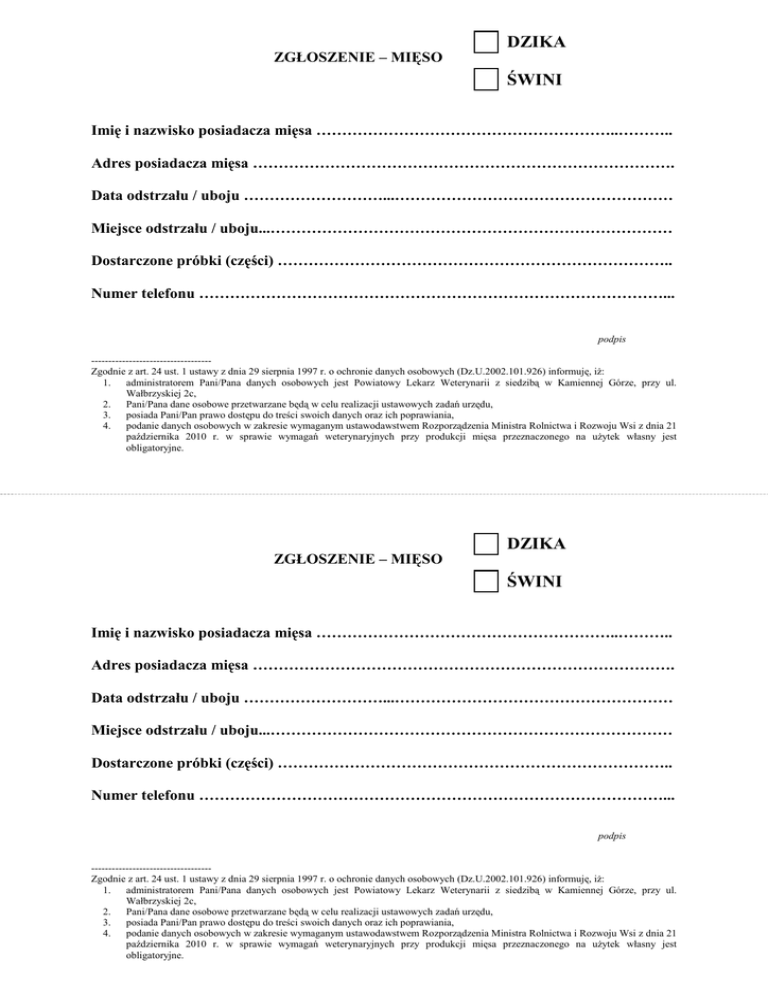 DZIKA ZGŁOSZENIE – MIĘSO ŚWINI Imię i nazwisko posiadacza mięsa …………………………………………………..……….. Adres posiadacza mięsa ………………………………………………………………………. Data odstrzału / uboju ………………………...……………………………………………… Miejsce odstrzału / uboju...…………………………………………………………………… Dostarczone próbki (części) ………………………………………………………………….. Numer telefonu ………………………………………………………………………………... podpis ----------------------------------Zgodnie z art. 24 ust. 1 ustawy z dnia 29 sierpnia 1997 r. o ochronie danych osobowych (Dz.U.2002.101.926) informuję, iŜ: 1. administratorem Pani/Pana danych osobowych jest Powiatowy Lekarz Weterynarii z siedzibą w Kamiennej Górze, przy ul. Wałbrzyskiej 2c, 2. Pani/Pana dane osobowe przetwarzane będą w celu realizacji ustawowych zadań urzędu, 3. posiada Pani/Pan prawo dostępu do treści swoich danych oraz ich poprawiania, 4. podanie danych osobowych w zakresie wymaganym ustawodawstwem Rozporządzenia Ministra Rolnictwa i Rozwoju Wsi z dnia 21 października 2010 r. w sprawie wymagań weterynaryjnych przy produkcji mięsa przeznaczonego na uŜytek własny jest obligatoryjne. DZIKA ZGŁOSZENIE – MIĘSO ŚWINI Imię i nazwisko posiadacza mięsa …………………………………………………..……….. Adres posiadacza mięsa ………………………………………………………………………. Data odstrzału / uboju ………………………...……………………………………………… Miejsce odstrzału / uboju...…………………………………………………………………… Dostarczone próbki (części) ………………………………………………………………….. Numer telefonu ………………………………………………………………………………... podpis ----------------------------------Zgodnie z art. 24 ust. 1 ustawy z dnia 29 sierpnia 1997 r. o ochronie danych osobowych (Dz.U.2002.101.926) informuję, iŜ: 1. administratorem Pani/Pana danych osobowych jest Powiatowy Lekarz Weterynarii z siedzibą w Kamiennej Górze, przy ul. Wałbrzyskiej 2c, 2. Pani/Pana dane osobowe przetwarzane będą w celu realizacji ustawowych zadań urzędu, 3. posiada Pani/Pan prawo dostępu do treści swoich danych oraz ich poprawiania, 4. podanie danych osobowych w zakresie wymaganym ustawodawstwem Rozporządzenia Ministra Rolnictwa i Rozwoju Wsi z dnia 21 października 2010 r. w sprawie wymagań weterynaryjnych przy produkcji mięsa przeznaczonego na uŜytek własny jest obligatoryjne.