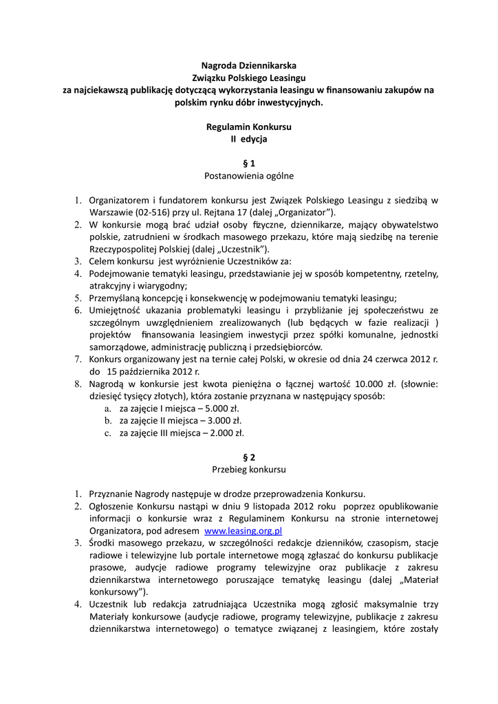 Nagroda Dziennikarska Związku Polskiego Leasingu za najciekawszą publikację dotyczącą wykorzystania leasingu w fnansowaniu zakupów na polskim rynku dóbr inwestycyjnych. Regulamin Konkursu II edycja §1 Postanowienia ogólne 1. Organizatorem i fundatorem konkursu jest Związek Polskiego Leasingu z siedzibą w Warszawie (02-516) przy ul. Rejtana 17 (dalej „Organizator”). 2. W konkursie mogą brać udział osoby fzyczne, dziennikarze, mający obywatelstwo polskie, zatrudnieni w środkach masowego przekazu, które mają siedzibę na terenie Rzeczypospolitej Polskiej (dalej „Uczestnik”). 3. Celem konkursu jest wyróżnienie Uczestników za: 4. Podejmowanie tematyki leasingu, przedstawianie jej w sposób kompetentny, rzetelny, atrakcyjny i wiarygodny; 5. Przemyślaną koncepcję i konsekwencję w podejmowaniu tematyki leasingu; 6. Umiejętność ukazania problematyki leasingu i przybliżanie jej społeczeństwu ze szczególnym uwzględnieniem zrealizowanych (lub będących w fazie realizacji ) projektów fnansowania leasingiem inwestycji przez spółki komunalne, jednostki samorządowe, administrację publiczną i przedsiębiorców. 7. Konkurs organizowany jest na ternie całej Polski, w okresie od dnia 24 czerwca 2012 r. do 15 października 2012 r. 8. Nagrodą w konkursie jest kwota pieniężna o łącznej wartość 10.000 zł. (słownie: dziesięć tysięcy złotych), która zostanie przyznana w następujący sposób: a. za zajęcie I miejsca – 5.000 zł. b. za zajęcie II miejsca – 3.000 zł. c. za zajęcie III miejsca – 2.000 zł. §2 Przebieg konkursu 1. Przyznanie Nagrody następuje w drodze przeprowadzenia Konkursu. 2. Ogłoszenie Konkursu nastąpi w dniu 9 listopada 2012 roku poprzez opublikowanie informacji o konkursie wraz z Regulaminem Konkursu na stronie internetowej Organizatora, pod adresem www.leasing.org.pl 3. Środki masowego przekazu, w szczególności redakcje dzienników, czasopism, stacje radiowe i telewizyjne lub portale internetowe mogą zgłaszać do konkursu publikacje prasowe, audycje radiowe programy telewizyjne oraz publikacje z zakresu dziennikarstwa internetowego poruszające tematykę leasingu (dalej „Materiał konkursowy”). 4. Uczestnik lub redakcja zatrudniająca Uczestnika mogą zgłosić maksymalnie trzy Materiały konkursowe (audycje radiowe, programy telewizyjne, publikacje z zakresu dziennikarstwa internetowego) o tematyce związanej z leasingiem, które zostały 5. 6. 7. 8. opublikowane lub wyemitowane w okresie od dnia 1 października 2011r. do dnia 30 września 2012 r., w środkach masowego przekazu mających siedzibę na terenie Rzeczypospolitej Polskiej. Do konkursu mogą być zgłaszane wyłącznie Materiały Konkursowe w języku polskim. Zgłoszenie do konkursu powinno zawierać jedną kopię Materiału Konkursowego w postaci: a. w przypadku tekstów prasowych - wydruku komputerowy w formacie A4 oraz jego wersję elektroniczną w formacie PDF; b. w przypadku audycji radiowych - nagrania plików w formacie MP3 na płycie CD-R lub CD-RW (inne formaty i płyty nie będą przyjmowane); c. w przypadku programu telewizyjnego – nagrania na płycie DVD-R w formacie .avi, .wmv lub .mpeg; d. w przypadku publikacji internetowych – wydruk komputerowy publikacji w formacie A4, oraz wypełniony wydruk komputerowy formularza zgłoszeniowego – formularz stanowi załącznik do niniejszego Regulaminu Konkursu. 7. Materiały Konkursowe wraz z formularzem zgłoszeniowym należy przesłać listem poleconym na adres Organizatora oraz pocztą elektroniczną na adres email: [email protected] do dnia 15 października 2012r., do godziny 00:00:00. W tytule wiadomości należy podać imię i nazwisko Uczestnika, a w nazwie pliku tytuł artykułu materiału Konkursowego. dacie przyjęcia zgłoszenia decyduje data stempla pocztowego zgłoszenia, o którym mowa w zdaniu poprzednim. §3 Wybór laureatów Konkursu 1. Laureatów konkursu wyłania Kapituła w składzie następującym: a. Przewodniczący Komitetu Wykonawczego Organizatora– Andrzej Krzemiński, b. Dyrektor Organizatora ds. Public Relatons. – Maja Lidke, c. Dyrektor Generalny Organizatora – Andrzej Sugajski. 2. Każdy z członków Kapituły przyzna poszczególnym Uczestnikom punkty o wartości od 1 do 9 (im wyższa liczba, tym Uczestnik jest lepiej oceniany). Trzech Uczestników o największej ilości przyznanych punktów zostanie laureatami konkursu zajmując miejsca od I do III, odpowiednio do ilości zdobytych punktów, gdzie I miejsce odpowiada liczbie najwięcej zdobytych punktów. W przypadku gdy z pośród trzech Uczestników, którzykolwiek zdobędą taką samą ilość punktów decyduje głos Przewodniczącego Kapituły. 3. Ogłoszenie wyników Konkursu oraz ceremonia wręczenia Nagród odbędzie się w ciągu trzech miesięcy od zakończenia konkursu, jednak nie później niż do dnia 15 stycznia 2013 r. Wyniki zostaną opublikowane na stronie Organizatora www.leasing.org.pl . Laureaci Konkursu zostaną dodatkowo poinformowani o wygranej za pośrednictwem poczty elektronicznej, z której dokonano zgłoszenia. 4. Od kwot wypłacanych laureatom z tytułu przyznanej Nagrody Organizator potrąci zryczałtowany podatek dochodowy, na podstawie art. 30 ust. 1 pkt 2 ustawy o podatku dochodowym od osób fzycznych. 5. Prawo do otrzymania Nagrody nie może być przeniesione na osoby trzecie. 6. Organizatorzy zastrzegają sobie prawo zmiany Nagrody na inną o podobnym charakterze i wartości. 7. W przypadku rezygnacji z Nagrody nagroda ta przechodzi na kolejnego Uczestnika. §4 Postanowienia końcowe 1. Uczestnicy Konkursu wyrażają zgodę na przetwarzanie podanych przez nich dobrowolnie danych osobowych Organizatorowi w celach przeprowadzenia Konkursu. 2. Administratorem danych osobowych jest Organizator. Osobie udostępniającej swoje dane osobowe przysługuje prawo wglądu do tych danych oraz prawo ich poprawienia. 3. Regulamin Konkursu dostępny jest u Organizatora Konkursu, z sie