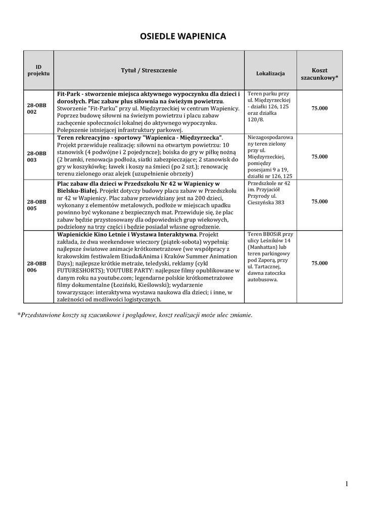 OSIEDLE WAPIENICA ID projektu 28-OBB 002 28-OBB 003 28-OBB 005 28-OBB 006 Tytuł / Streszczenie Fit-Park - stworzenie miejsca aktywnego wypoczynku dla dzieci i dorosłych. Plac zabaw plus siłownia na świeżym powietrzu. Stworzenie "Fit-Parku" przy ul. Międzyrzeckiej w centrum Wapienicy. Poprzez budowę siłowni na świeżym powietrzu i placu zabaw zachęcenie społeczności lokalnej do aktywnego wypoczynku. Polepszenie istniejącej infrastruktury parkowej. Teren rekreacyjno - sportowy "Wapienica - Międzyrzecka". Projekt przewiduje realizację: siłowni na otwartym powietrzu: 10 stanowisk (4 podwójne i 2 pojedyncze); boiska do gry w piłkę nożną (2 bramki, renowacja podłoża, siatki zabezpieczające; 2 stanowisk do gry w koszykówkę; ławek i koszy na śmieci (po 2 szt.); renowację terenu zielonego oraz alejek (uzupełnienie obrzeży) Plac zabaw dla dzieci w Przedszkolu Nr 42 w Wapienicy w Bielsku-Białej. Projekt dotyczy budowy placu zabaw w Przedszkolu nr 42 w Wapienicy. Plac zabaw przewidziany jest na 200 dzieci, wykonany z elementów metalowych, podłoże w miejscach upadku powinno być wykonane z bezpiecznych mat. Przewiduje się, że plac zabaw będzie przystosowany dla odpowiednich grup wiekowych, podzielony na trzy części i będzie posiadał własne ogrodzenie. Wapienickie Kino Letnie i Wystawa Interaktywna. Projekt zakłada, że dwa weekendowe wieczory (piątek-sobota) wypełnią: najlepsze światowe animacje krótkometrażowe (we współpracy z krakowskim festiwalem Etiuda&Anima i Kraków Summer Animation Days); najlepsze krótkie metraże, teledyski, reklamy (cykl FUTURESHORTS); YOUTUBE PARTY: najlepsze filmy opublikowane w danym roku na youtube.com; legendarne polskie krótkometrażowe filmy dokumentalne (Łoziński, Kieślowski); wydarzenie towarzyszące: interaktywna wystawa naukowa dla dzieci; i inne, w zależności od możliwości logistycznych. Lokalizacja Koszt szacunkowy* Teren parku przy ul. Międzyrzeckiej - działki 126, 125 oraz działka 120/8. 75.000 Niezagospodarowa ny teren zielony przy ul. Międzyrzeckiej, pomiędzy posesjami 9 a 19, działki nr 126, 125 Przedszkole nr 42 im. Przyjaciół Przyrody ul. Cieszyńska 383 Teren BBOSiR przy ulicy Leśników 14 (Manhattan) lub teren parkingowy pod Zaporą, przy ul. Tartacznej, dawna zatoczka autobusowa. 75.000 75.000 75.000 *Przedstawione koszty są szacunkowe i poglądowe, koszt realizacji może ulec zmianie. 1