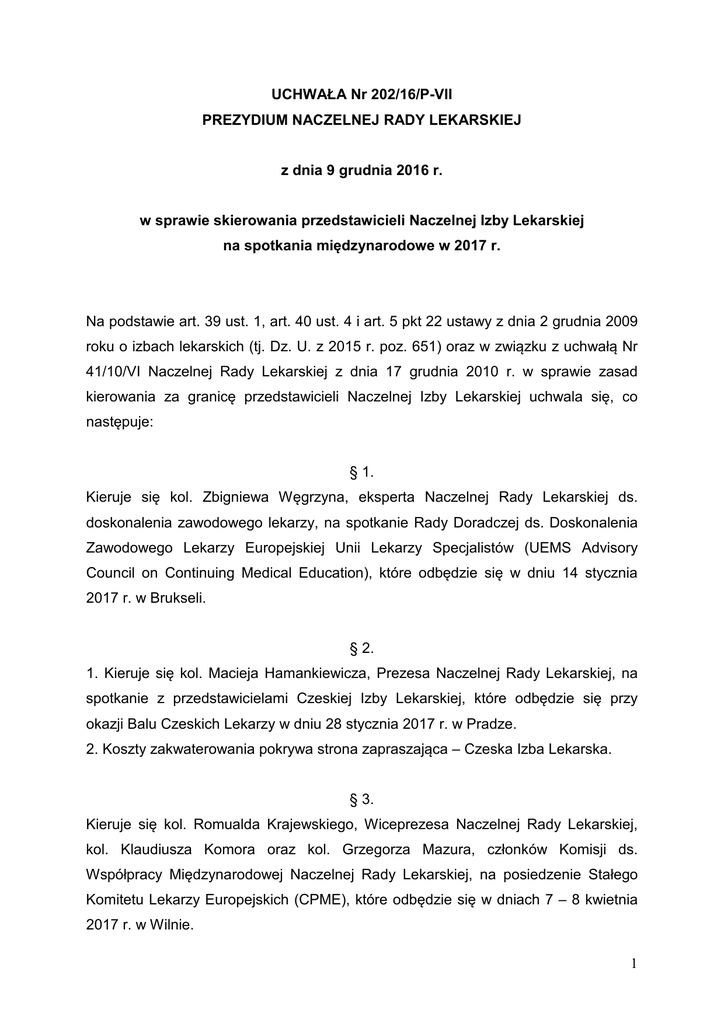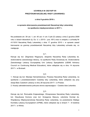 UCHWAŁA Nr 202/16/P-VII PREZYDIUM NACZELNEJ RADY LEKARSKIEJ z dnia 9 grudnia 2016 r. w sprawie skierowania przedstawicieli Naczelnej Izby Lekarskiej na spotkania międzynarodowe w 2017 r. Na podstawie art. 39 ust. 1, art. 40 ust. 4 i art. 5 pkt 22 ustawy z dnia 2 grudnia 2009 roku o izbach lekarskich (tj. Dz. U. z 2015 r. poz. 651) oraz w związku z uchwałą Nr 41/10/VI Naczelnej Rady Lekarskiej z dnia 17 grudnia 2010 r. w sprawie zasad kierowania za granicę przedstawicieli Naczelnej Izby Lekarskiej uchwala się, co następuje: § 1. Kieruje się kol. Zbigniewa Węgrzyna, eksperta Naczelnej Rady Lekarskiej ds. doskonalenia zawodowego lekarzy, na spotkanie Rady Doradczej ds. Doskonalenia Zawodowego Lekarzy Europejskiej Unii Lekarzy Specjalistów (UEMS Advisory Council on Continuing Medical Education), które odbędzie się w dniu 14 stycznia 2017 r. w Brukseli. § 2. 1. Kieruje się kol. Macieja Hamankiewicza, Prezesa Naczelnej Rady Lekarskiej, na spotkanie z przedstawicielami Czeskiej Izby Lekarskiej, które odbędzie się przy okazji Balu Czeskich Lekarzy w dniu 28 stycznia 2017 r. w Pradze. 2. Koszty zakwaterowania pokrywa strona zapraszająca – Czeska Izba Lekarska. § 3. Kieruje się kol. Romualda Krajewskiego, Wiceprezesa Naczelnej Rady Lekarskiej, kol. Klaudiusza Komora oraz kol. Grzegorza Mazura, członków Komisji ds. Współpracy Międzynarodowej Naczelnej Rady Lekarskiej, na posiedzenie Stałego Komitetu Lekarzy Europejskich (CPME), które odbędzie się w dniach 7 – 8 kwietnia 2017 r. w Wilnie. 1 § 4. 1. Kieruje się kol. Macieja Hamankiewicza, Prezesa Naczelnej Rady Lekarskiej, oraz kol. Grzegorza Mazura, członka Komisji ds. Współpracy Międzynarodowej Naczelnej Rady Lekarskiej, na Sesję Rady Światowego Stowarzyszenia Lekarskiego (WMA), która odbędzie się w dniach 20 – 22 kwietnia 2017 r. w Livingstone w Zambii. 2. Przeznacza się kwotę w wysokości do 1 200 EUR (słownie: do czterystu euro) na dokonanie opłaty rejestracyjnej związanej z udziałem przedstawiciela Naczelnej Izby Lekarskiej w Sesji Rady WMA, o której mowa w ust. 1. § 5. Kieruje się kol. Annę Śpiałek i kol. Halinę Borgiel-Marek, członków Komisji ds. Współpracy Międzynarodowej Naczelnej Rady Lekarskiej, na Sesję Plenarną Europejskiej Regionalnej Organizacji FDI (ERO-FDI) oraz na spotkania Grup Roboczych ERO-FDI, które odbędą się w dniach 21 – 22 kwietnia 2017 r. w Genewie. § 6. Kieruje się kol. Halinę Borgiel-Marek, kol. Grażynę Sławetę, członków Komisji ds. Współpracy Międzynarodowej Naczelnej Rady Lekarskiej, oraz kol. Zbigniewa Węgrzyna, eksperta Naczelnej Rady Lekarskiej ds. doskonalenia zawodowego lekarzy, na posiedzenie Rady Europejskiej Unii Lekarzy Specjalistów (UEMS), które odbędzie się w dniach 27 – 29 kwietnia 2017 r. § 7. 1. Kieruje się kol. Macieja Hamankiewicza, Prezesa Naczelnej Rady Lekarskiej, na 120. Zjazd Lekarzy Niemieckich (120. Deutscher Ärztetag), który odbędzie się w dniach 23 – 26 maja 2017 r. we Freiburgu. 2. Koszty zakwaterowania pokrywa strona zapraszająca – Niemiecka Federalna Izba Lekarska. § 8. 1. Kieruje się kol. Annę Lellę, Przewodniczącą Komisji ds. Współpracy Międzynarodowej Naczelnej Rady Lekarskiej, kol. Annę Śpiałek i kol. Halinę Borgiel2 Marek, członków Komisji ds. Współpracy Międzynarodowej Naczelnej Rady Lekarskiej, oraz mec. Marka Szewczyńskiego, pracownika biura Naczelnej Izby Lekarskiej, na posiedzenie ogólne Rady Europejskich Lekarzy Dentystów (CED), które odbędzie się w dniach 26 – 27 maja 2017 r. na Malcie. 2. Przeznacza się kwotę w wysokości 400 EUR (słownie: trzysta euro) na dokonanie opłaty (participation fee) za udział przedstawicieli Naczelnej Izby Lekarskiej w posiedzeniu, o którym mowa w ust. 1. § 9. Kieruje się kol. Wojciecha Domkę, członka Naczelnej Rady Lekarskiej, Prezesa Okręgowej Rady Lekarskiej w Rzeszowie, na Zjazd Szwedzkiego Stowarzyszenia Lekarskiego, który odbędzie się w dniach 29 – 31 maja 2017 r. w Sztokholmie. § 10. 1. Kieruje się kol. Grażynę Sławetę oraz kol. Marka Stankiewicza, członków Komisji ds. Współpracy Międzynarodowej Naczelnej Rady Lekarskiej, na Europejskie Forum Stowarzyszeń Medycznych i Światowej Organizacji Zdrowia (EFMA/WHO), które odbędzie się w dniach 29 czerwca – 1 lipca 2017 roku w Izraelu. 2. Przeznacza się kwotę w wysokości do 2 000 EUR (słownie: do dwóch tysięcy euro) na dokonanie opłaty rejestracyjnej związanej z udziałem przedstawicieli Naczelnej Izby Lekarskiej w Forum, o którym mowa w ust. 1. § 11. 1. Kieruje się kol. Annę Lellę, Przewodniczącą Komisji ds. Współpracy Międzynarodowej Naczelnej Rady Lekarskiej, oraz mec. Marka Szewczyńskiego, pracownika biura Naczelnej Izby Lekarskiej, na międzynarodową Konferencję nt. odpowiedzialności zawodowej lekarzy dentystów i roli organizacji zawodowych (“Professional civil liability and insurance. The role of Dental Associations”) organizowaną przez Krajowe Stowarzyszenie Włoskich Lekarzy dentystów (Associazione Nazionale Dentisti Italiani, ANDI), które odbędzie się w dniach 7 – 8 lipca 2017 r. w Weronie. 2. Koszty dwóch noclegów jednego przedstawiciela NIL pokrywają organizatorzy. § 12. 3 1. Kieruje się kol. Annę Lellę, Przewodniczącą Komisji ds. Współpracy Międzynarodowej Naczelnej Rady Lekarskiej, kol. Halinę Borgiel-Marek i kol. Annę Śpiałek, członków Komisji ds. Współpracy Międzynarodowej Naczelnej Rady Lekarskiej, na Światowy Parlament Stomatologiczny Światowej Organizacji Dentystycznej (FDI World Dental Parliament), obejmujący Sesje Zgromadzenia Ogólnego i Sesje Otwarte FDI, spotkania Stałych Komitetów FDI, spotkanie Krajowych Oficerów Łącznikowych FDI, Sesję Plenarną Europejskiej Regionalnej Organizacji FDI (ERO-FDI) oraz posiedzenia Grup Roboczych ERO-FDI, który odbędzie się w dniach 28 sierpnia – 1 września 2017 r. w Madrycie. 2. Kieruje się mec. Marka Szewczyńskie