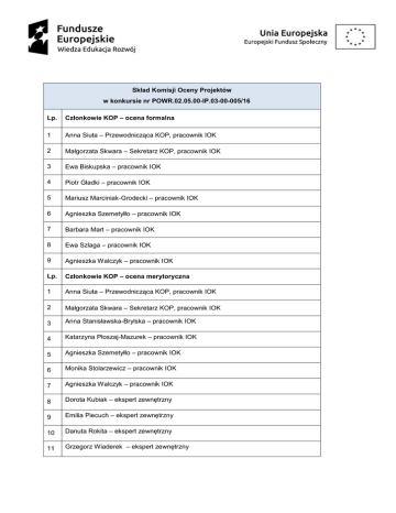 Skład Komisji Oceny Projektów w konkursie nr POWR.02.05.00-IP.03-00-005/16 Lp. Członkowie KOP – ocena formalna 1 Anna Siuta – Przewodnicząca KOP, pracownik IOK 2 Małgorzata Skwara – Sekretarz KOP, pracownik IOK 3 Ewa Biskupska – pracownik IOK 4 Piotr Gładki – pracownik IOK 5 Mariusz Marciniak-Grodecki – pracownik IOK 6 Agnieszka Szemetyłło – pracownik IOK 7 Barbara Mart – pracownik IOK 8 Ewa Szlaga – pracownik IOK 9 Agnieszka Walczyk – pracownik IOK Lp. Członkowie KOP – ocena merytoryczna 1 Anna Siuta – Przewodnicząca KOP, pracownik IOK 2 Małgorzata Skwara – Sekretarz KOP, pracownik IOK 3 Anna Stanisławska-Brylska – pracownik IOK 4 Katarzyna Płoszaj-Mazurek – pracownik IOK 5 Agnieszka Szemetyłło – pracownik IOK 6 Monika Stolarzewicz – pracownik IOK 7 Agnieszka Walczyk – pracownik IOK 8 Dorota Kubiak – ekspert zewnętrzny 9 Emilia Piecuch – ekspert zewnętrzny 10 Danuta Rokita – ekspert zewnętrzny 11 Grzegorz Wiaderek – ekspert zewnętrzny