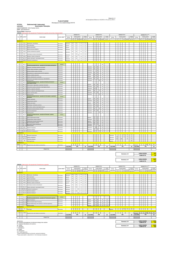Załącznik nr 2 do Zarządzenia Rektora nr 18/2013 z 14 czerwca 2013 r. PLAN STUDIÓW Obowiązuje od roku akademickiego 2015/16 WYDZIAŁ: Elektrotechniki i Automatyki Automatyka i Robotyka KIERUNEK: poziom kształcenia: studia drugiego stopnia profil : ogólnoakademicki forma studiów: stacjonarne UWAGA: Siatka godzin dla specjalności Przetwarzanie sygnałów jest poniżej ninejszej tabelki SEMESTR I nazwa zajęć Lp. O/F symbol* grupa zajęć** forma zaliczenia SEMESTR II SEMESTR III liczba liczba liczba godzin forma punktów punktów l p/s razem ECTS zaliczenia w ć l p/s razem ECTS liczba godzin w ć forma zaliczenia liczba godzin w ć l p/s SEMESTR IV liczba forma punktów razem ECTS zaliczenia w staż liczba godzin ć l p/s razem liczba punktów ECTS SEMESTR I 1 O MK_2 Modelowanie i identyfikacja kierunkowe zaliczenie 30 15 45 5 2 O MK_3 Teoria sterowania kierunkowe egzamin 45 15 60 5 3 O MK_4 Metody optymalizacji kierunkowe egzamin 30 15 45 5 4 O MK_5 Metody sztucznej inteligencji kierunkowe zaliczenie 30 15 45 2 5 O MK_6 Cyfrowe przetwarzanie sygnałów kierunkowe zaliczenie 30 15 45 3 6 O MK_7 Automatyka procesów przemysłowych 30 15 60 4 kierunkowe zaliczenie kierunkowe egzamin 7 O MK_8 Robotyka i systemy mechatroniki 8 O MK_10 Systemy sterowania i wspomagania decyzji 9 O HUMAN_I Przedmiot humanistyczny I 15 15 15 30 2 15 30 2 30 2 kierunkowe zaliczenie 15 kierunkowe zaliczenie 15 15 SEMESTR II MODUŁ 10 F MK_11 11 F MK_11.1 Integracja i wizualizacja systemów automatyki kierunkowe zaliczenie 15 30 45 3 12 F MK_11.2 Cyfrowe układy wbudowane i programowalne kierunkowe zaliczenie 15 15 30 2 13 F MK_11.3 Cyfrowe protokoły wymiany informacji kierunkowe zaliczenie 15 15 2 14 F MK_11.4 Wprowadzenie do zaawansowanej techniki napędowej kierunkowe zaliczenie 15 15 30 2 15 F MK_11.5 Struktury układów sterowania kierunkowe egzamin 30 15 45 4 16 F MK_11.6 kierunkowe egzamin 30 15 45 3 17 F MK_11.7 Wytwarzanie wspomagane komputerowo CAD/CAM/CNC kierunkowe zaliczenie 15 15 30 2 18 F MK_11.8 Projekt grupowy kierunkowe zaliczenie 60 4 MK_12 Przedmioty specjalnościowe - specjalność Automatyka przemysłowa Systemy zabezpieczeń w przemyśle Przedmioty specjalnościowe - specjalność Systemy sterowania i wspomagania decyzji 300 60 MODUŁ 19 F 20 F MK_12.1 Monitorowanie i diagnostyka w systemach sterowania kierunkowe egzamin 30 30 60 4 21 F MK_12.2 kierunkowe zaliczenie 15 30 45 4 22 F MK_12.3 Struktury i algorytmy sterowania kierunkowe zaliczenie 30 15 45 4 23 F MK_12.4 kierunkowe egzamin 30 45 3 24 F MK_12.5 Systemy inżynierii wiedzy kierunkowe zaliczenie 15 45 3 25 F MK_12.6 Projekt grupowy kierunkowe zaliczenie 60 4 26 F 27 F MK_13.1 Systemy operacyjne kierunkowe egzamin 15 15 30 2 28 F MK_13.2 kierunkowe zaliczenie 15 15 30 3 29 F MK_13.3 Systemy baz danych kierunkowe egzamin 30 15 45 4 30 F MK_13.4 Wizualizacja i multimedia w technice kierunkowe zaliczenie 15 15 30 2 31 F MK_13.5 Bazy wiedzy i systemy wspomagania decyzji kierunkowe zaliczenie 15 15 30 2 32 F MK_13.6 Zarządzanie bezpieczeństwem informacji kierunkowe zaliczenie 15 30 2 33 F MK_13.7 Inżynieria zabezpieczeń kierunkowe zaliczenie 15 45 3 34 F MK_13.8 Projekt grupowy kierunkowe zaliczenie 60 4 35 F 36 F MK_14.1 Języki programowania robotów kierunkowe egzamin 30 30 60 4 37 F MK_14.2 Programowanie robotów mobilnych kierunkowe zaliczenie 15 30 45 4 38 F kierunkowe egzamin 15 30 45 4 39 F MK_14.3 Projektowanie obwodów elektronicznych MK_14.4 Sieci komputerowe w robotyce kierunkowe zaliczenie 30 15 45 3 40 F zaliczenie zaliczenie 15 45 3 F kierunkowe kierunkowe 30 41 MK_14.5 Nowoczesne systemy bazodanowe MK_14.6 Projekt grupowy 60 4 42 O MK_1 English for Engineers kierunkowe zaliczenie 30 3 43 F MK_15 Przedmiot obieralny kierunkowe zaliczenie 15 30 2 44 O zaliczenie 15 30 3 MK_13 MK_14 Komputerowe systemy sterowania i wspomagania decyzji Struktury i algorytmy wspomagania decyzji Przedmioty specjalnościowe - specjalność Informatyka w systemach sterowania Programowanie sieciowe Przedmioty specjalnościowe - specjalność Robotyka i systemy mechatroniki HUMAN_II Przedmiot humanistyczny II 15 30 60 MODUŁ 15 30 60 MODUŁ kierunkowe 60 30 15 15 SEMESTR III 45 O 46 O 47 F MK_16 SD 48 O PD Seminarium dyplomowe kierunkowe zaliczenie kierunkowe zaliczenie 15 kierunkowe zaliczenie 45 Praca dyplomowa kierunkowe egzamin Długoterminowy staż badawczo-przemysłowy kierunkowe EKONOM Systemy zarządzania Przedmioty obieralne 30 30 15 30 45 90 2 2 6 20 SEMESTR IV #ADR! STAŻ F 750 zaliczenie ŁĄCZNIE 390 30 ŁĄCZNIE 390 30 ŁĄCZNIE 150 30 ŁĄCZNIE 750 750 30 30 PRAKTYKI SUMA GODZIN Semestry I..III 930 SUMA ECTS Semestry I..IV 90 SUMA GODZIN 1680 SUMA ECTS 120 UWAGA: Siatka godzin dla specjalności Przetwarzanie sygnałów SEMESTR I nazwa zajęć Lp. O/F symbol* grupa zajęć** forma zaliczenia SEMESTR II w ć SEMESTR IV staż SEMESTR III liczba liczba liczba godzin forma punktów punktów l p/s razem ECTS zaliczenia w ć l p/s razem ECTS liczba godzin forma zaliczenia liczba godzin w ć l p/s liczba forma punktów razem ECTS zaliczenia w liczba godzin ć l p/s razem liczba punktów ECTS SEMESTR I 1 O MK_2 Modelowanie i identyfikacja kierunkowe zaliczenie 2 O MK_3 Teoria sterowania kierunkowe egzamin 3 O MK_4 Metody optymalizacji kierunkowe egzamin 4 O MK_5 Metody sztucznej inteligencji kierunkowe zaliczenie 5 O MK_8 Robotyka i systemy mechatroniki 6 O MK_9 Automatyka procesów przemysłowych 7 O MK_10 Systemy sterowania i wspomagania decyzji 8 O 9 F MK_18 Przedmiot obieralny I 10 F MK_19 Przedmiot obieralny II kierunkowe HUMAN_1 Przedmiot humanistyczny I egzamin kierunkowe zaliczenie kierunkowe zaliczenie kierunkowe zaliczenie kierunkowe zaliczenie kierunkowe zaliczenie 30 15 45 5 45 15 60 5 30 15 45 5 30 15 45 2 15 15 30 2 15 15 30 2 15 15 30 2 30 2 45 3 30 2 15 30 15 15 15 15 SEMESTR II MK_20 MODUŁ 11 F 12 F MK_20.1 Signal Processing II kierunkowe egzamin 13 F MK_20.2 Advanced Applied Signal Processing kierunkowe egzamin 