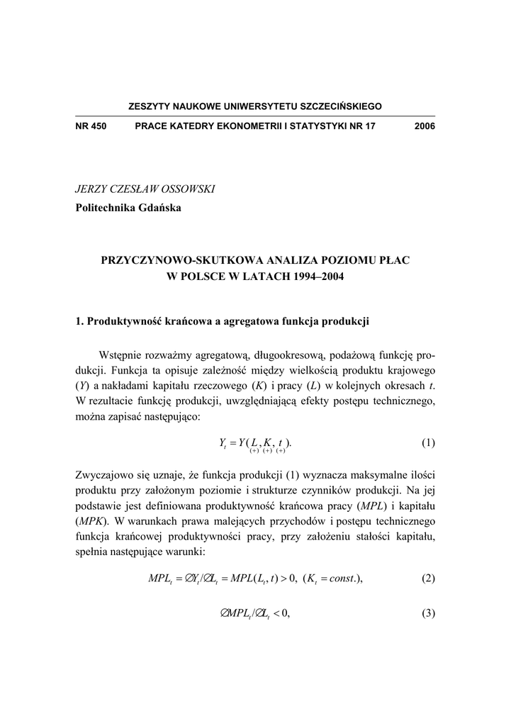 ZESZYTY NAUKOWE UNIWERSYTETU SZCZECIŃSKIEGO NR 450 PRACE KATEDRY EKONOMETRII I STATYSTYKI NR 17 2006 JERZY CZESŁAW OSSOWSKI Politechnika Gdańska PRZYCZYNOWO-SKUTKOWA ANALIZA POZIOMU PŁAC W POLSCE W LATACH 1994–2004 1. Produktywność krańcowa a agregatowa funkcja produkcji Wstępnie rozwaŜmy agregatową, długookresową, podaŜową funkcję produkcji. Funkcja ta opisuje zaleŜność między wielkością produktu krajowego (Y) a nakładami kapitału rzeczowego (K) i pracy (L) w kolejnych okresach t. W rezultacie funkcję produkcji, uwzględniającą efekty postępu technicznego, moŜna zapisać następująco: Yt = Y ( L , K , t ). (+) (+) ( +) (1) Zwyczajowo się uznaje, Ŝe funkcja produkcji (1) wyznacza maksymalne ilości produktu przy załoŜonym poziomie i strukturze czynników produkcji. Na jej podstawie jest definiowana produktywność krańcowa pracy (MPL) i kapitału (MPK). W warunkach prawa malejących przychodów i postępu technicznego funkcja krańcowej produktywności pracy, przy załoŜeniu stałości kapitału, spełnia następujące warunki: MPLt = ∆Yt /∆Lt = MPL( Lt , t ) > 0, ( K t = const.), (2) ∆MPLt /∆Lt < 0, (3) 440 Czesław Ossowski ∆MPLt = MPLt − MPLt −1 > 0. (4) Zakładając stałość nakładów pracy, właściwości funkcji produktywności krańcowej kapitału moŜna zdefiniować następująco: MPK t = ∆Yt /∆K t = MPK ( K t , t ) > 0, ( Lt = const.), (5) ∆MPK t /∆K t < 0, 6) ∆MPK t = MPK t − MPK t −1 > 0. (7) Stany kapitału rzeczowego na koniec kolejnych okresów są funkcją strumienia nakładów inwestycyjnych brutto (I) w danym okresie oraz wielkości amortyzacji (D – deprecjacji) kapitału rzeczowego, co moŜna zapisać: K t = K t −1 + I t − Dt . (8) Na podstawie (8) definiowany jest strumień inwestycji netto (∆K) w okresie t: ∆K t = K t − K t −1 = I t − Dt . (9) K t = const. → ∆K t = 0 → I t = Dt . (10) ZauwaŜmy, Ŝe: Na tej podstawie moŜna stwierdzić, Ŝe przyjęcie załoŜenia o stałości kapitału rzeczowego oznacza, iŜ wielkość deprecjacji majątku (D) w okresie t jest równowaŜona przez wielkość inwestycji brutto (I) w tym samym okresie, czyli w warunkach stałości kapitału następuje odnowienie majątku produkcyjnego. Na podobnej zasadzie moŜna rozwaŜyć zagadnienie dotyczące odnawiania się zasobów pracy. Wyrazem odnowienia się kapitału i pracy jest postęp techniczny, charakteryzujący się wzrostem produkcji w warunkach stałości czynników. Uzasadnia to przyjęcie załoŜenia o dodatnim wpływie zmiennej t na wielkość produktu (Y) w funkcji (1) oraz na produktywność krańcową pracy (MPL) Przyczynowo-skutkowa analiza poziomu płac w Polsce... 441 i produktywność krańcową kapitału (MPK) w funkcjach (2) i (5). Efektem postępu technicznego, wynikającego z odnowienia czynników produkcji, jest więc przesunięcie w górę: – krzywej produktu jednakowego kapitału [Y(L, t), K = const.], – krzywej produktu jednakowej pracy [Y(K, t), L = const.], – krzywej produktu krańcowego pracy [MPL(L, t), K = const.], – krzywej produktu krańcowego kapitału [MPK(K, t), L = const.]. 2. Płace i produktywność pracy a popyt na pracę W warunkach gospodarki rynkowej podmioty gospodarcze osiągną maksymalny zysk ekonomiczny wówczas, gdy zatrudnią czynnik pracy (L) na takim poziomie, przy którym realna płaca (w) zrówna się z produktem krańcowym pracy (MPL): w = MPL( Lt , t ) (K t = const.). (11) Funkcja produktu krańcowego pracy zrównana z płacą realną wyznacza krzywą popytu na pracę. Krzywa popytu na pracę jest obrazem graficznym ilości pracy, jaką pracodawcy chcą i są w stanie zatrudnić przy róŜnych poziomach pracy. Z uwagi na prawo malejących przychodów krzywa popytu na pracę, będąca odwzorowaniem krzywej produktywności krańcowej, jest krzywą opadającą (rysunek 1). Z analizy rysunku 1 wynika, Ŝe wzrostowi płacy z poziomu w1 do poziomów w2 i w3 będzie towarzyszyć wzrost ekonomicznie uzasadnionego zapotrzebowania na pracę z poziomu L1 odpowiednio do poziomów L2 i L3. Oznacza to, Ŝe ceteris paribus, wzrost poziomu płac prowadzi do spadku zapotrzebowania na pracę. 442 Czesław Ossowski MPL W A3 W3 A2 W2 A1 W1 DL: MPL(N,K0,t=0) L3 L2 L1 L Rys. 1. Krzywa popytu na pracę (DL) Źródło: opracowanie własne. Z produktywnością krańcową pracy (MPL) ściśle jest związana produktywność (wydajność) przeciętnej pracy (APL=Y/L). Związek ten moŜna wyprowadzić wykorzystując elastyczność produkcji ze względu na pracę (EY(L)): EY ( L ) = ∆Y Y : = MPL(L, t ) : APL(L, t ), ( K = const.). ∆L L (12) Z prostego przekształcenia (12) wynika, Ŝe produktywność krańcowa jest funkcją produktywności przeciętnej: MPL = EY (L) ⋅ APL(L, t ). (13) Przyczynowo-skutkowa analiza poziomu płac w Polsce... MPL APL Gdzie: MPLA = wA APLA – wA = zysk jednostkowy A2 APLA Pole zysku całkowitego MPLA 443 A1 Zysk jednostkowy APL(N,K0,t=0) MPL(N,K0,t=0) LA L Rys. 2. Wzajemne połoŜenie krzywych produktywności krańcowej (MPL) i produktywności przeciętnej (APL) Źródło: opracowanie własne. Z uwagi na prawo malejących przychodów zachodzi następująca prawidłowość: 0 < EY (L) < 1 → MPL( L, t ) < APL( L, t ). (14) Wykorzystując (13), funkcję płacy (11), moŜna przedstawić jako funkcję produktywności (wydajności) przeciętnej: w = EY (L) ⋅ APL(L, t) = f (APL). (15) Warto zauwaŜyć, co przedstawiono na rysunku 2, Ŝe róŜnica między produktywnością przeciętną a poziomem płacy wyznacza zysk jednostkowy pracy. W warunkach zrównania płacy z produktywnością krańcową zysk jednostkowy zapewnia jednocześnie maksymalny zysk całkowity, co jest równowaŜne polu zysku na załączonym rysunku. 444 Czesław Ossowski 3. Poziom płac, produktywność pracy i stopa bezrobocia Czynniki podaŜowe wyznaczają jedynie potencjalne moŜliwości produkcji, a tym samym potencjalne moŜliwości wykorzystania czynników produkcj