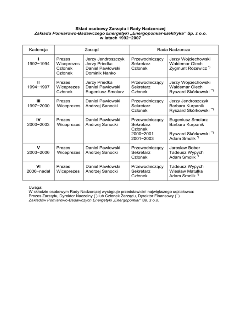 Skład osobowy Zarządu i Rady Nadzorczej Zakładu Pomiarowo-Badawczego Energetyki „Energopomiar-Elektryka” Sp. z o.o. w latach 1992−2007 Kadencja Zarząd Rada Nadzorcza I 1992−1994 Prezes Wiceprezes Członek Członek Jerzy Jendroszczyk Jerzy Priedka Daniel Pawłowski Dominik Nanko Przewodniczący Sekretarz Członek Jerzy Wojciechowski Waldemar Olech Zygmunt Rozewicz *) II 1994−1997 Prezes Wiceprezes Członek Jerzy Priedka Daniel Pawłowski Eugeniusz Smolarz Przewodniczący Sekretarz Członek Jerzy Wojciechowski Waldemar Olech Ryszard Skórkowski **) III 1997−2000 Prezes Wiceprezes Daniel Pawłowski Andrzej Sanocki Przewodniczący Sekretarz Członek Jerzy Jendroszczyk Barbara Kurpanik Ryszard Skórkowski **) IV 2000−2003 Prezes Wiceprezes Daniel Pawłowski Andrzej Sanocki Przewodniczący Sekretarz Członek 2000−2001 2001−2003 Eugeniusz Smolarz Barbara Kurpanik Ryszard Skórkowski **) Adam Smolik *) V 2003−2006 Prezes Wiceprezes Daniel Pawłowski Andrzej Sanocki Przewodniczący Sekretarz Członek Jarosław Bober Tadeusz Wypych Adam Smolik *) VI 2006−nadal Prezes Wiceprezes Daniel Pawłowski Andrzej Sanocki Przewodniczący Sekretarz Członek Tadeusz Wypych Wiesław Matulka Adam Smolik *) Uwaga: W składzie osobowym Rady Nadzorczej występuje przedstawiciel największego udziałowca: Prezes Zarządu, Dyrektor Naczelny (*) lub Członek Zarządu, Dyrektor Finansowy (**) Zakładów Pomiarowo-Badawczych Energetyki „Energopomiar” Sp. z o.o.