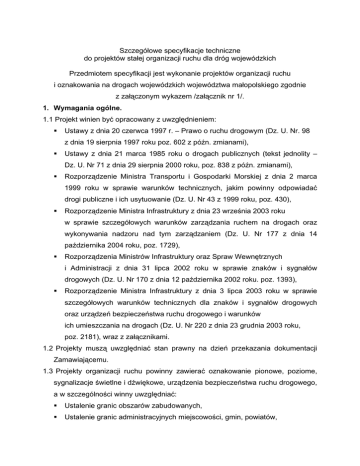Szczegółowe specyfikacje techniczne do projektów stałej organizacji ruchu dla dróg wojewódzkich Przedmiotem specyfikacji jest wykonanie projektów organizacji ruchu i oznakowania na drogach wojewódzkich województwa małopolskiego zgodnie z załączonym wykazem /załącznik nr 1/. 1. Wymagania ogólne. 1.1 Projekt winien być opracowany z uwzględnieniem: Ustawy z dnia 20 czerwca 1997 r. – Prawo o ruchu drogowym (Dz. U. Nr. 98 z dnia 19 sierpnia 1997 roku poz. 602 z późn. zmianami), Ustawy z dnia 21 marca 1985 roku o drogach publicznych (tekst jednolity – Dz. U. Nr 71 z dnia 29 sierpnia 2000 roku, poz. 838 z późn. zmianami), Rozporządzenie Ministra Transportu i Gospodarki Morskiej z dnia 2 marca 1999 roku w sprawie warunków technicznych, jakim powinny odpowiadać drogi publiczne i ich usytuowanie (Dz. U. Nr 43 z 1999 roku, poz. 430), Rozporządzenie Ministra Infrastruktury z dnia 23 września 2003 roku w sprawie szczegółowych warunków zarządzania ruchem na drogach oraz wykonywania nadzoru nad tym zarządzaniem (Dz. U. Nr 177 z dnia 14 października 2004 roku, poz. 1729), Rozporządzenia Ministrów Infrastruktury oraz Spraw Wewnętrznych i Administracji z dnia 31 lipca 2002 roku w sprawie znaków i sygnałów drogowych (Dz. U. Nr 170 z dnia 12 października 2002 roku. poz. 1393), Rozporządzenie Ministra Infrastruktury z dnia 3 lipca 2003 roku w sprawie szczegółowych warunków technicznych dla znaków i sygnałów drogowych oraz urządzeń bezpieczeństwa ruchu drogowego i warunków ich umieszczania na drogach (Dz. U. Nr 220 z dnia 23 grudnia 2003 roku, poz. 2181), wraz z załącznikami. 1.2 Projekty muszą uwzględniać stan prawny na dzień przekazania dokumentacji Zamawiającemu. 1.3 Projekty organizacji ruchu powinny zawierać oznakowanie pionowe, poziome, sygnalizacje świetlne i dźwiękowe, urządzenia bezpieczeństwa ruchu drogowego, a w szczególności winny uwzględniać: Ustalenie granic obszarów zabudowanych, Ustalenie granic administracyjnych miejscowości, gmin, powiatów, Wyznaczenie miejsc lokalizacji przystanków komunikacji zbiorowej, w tym dostosowanie przepisów. lokalizacji Lokalizacja istniejących przystanków przystanków powinna do obowiązujących uwzględniać możliwość wykonania peronów przystankowych, a docelowo zatok autobusowych. Ustalenie zakazów i nakazów ruchu określonych rodzajów pojazdów lub uczestników ruchu. Wyznaczenie przejść dla pieszych i przejazdów dla rowerzystów. Ustalenie oznakowania drogowskazowego. Wyznaczenie miejsc i określania sposobów oraz warunków parkowania pojazdów. Organizację ruchu na skrzyżowaniach. 1.4 W czasie opracowywania projektów ich Wykonawca jest zobowiązany do uwzględnienia zmian w organizacji ruchu, zatwierdzonych przez organ zarządzający ruchem, wskazanych przez Zamawiającego (od chwili udzielenia zamówienia do momentu złożenia opracowanej dokumentacji przez Wykonawcę do zatwierdzenia). 2. Zawartość opracowania. 2.1 Projekt organizacji ruchu powinien zawierać: - plan orientacyjny w skali 1:10 000 do 1:25 000 z zaznaczeniem dróg, których dotyczy; - plan sytuacyjny w skali 1:1000 (skala podstawowa) oraz 1:500 (dla odcinków dróg obejmujących skomplikowane skrzyżowania z rozbudowanym oznakowaniem poziomym i odcinków dróg w granicach miast) z zaznaczeniem inwentaryzacji istniejącego oznakowania oraz projektowanej stałej organizacji ruchu; - program sygnalizacji i obliczenia przepustowości drogi – w przypadku, gdy projekt zawierał będzie sygnalizację świetlną; - opis techniczny zawierający cel i zakres opracowania, charakterystykę drogi i ruchu na drodze, uzasadnienie wprowadzanych zmian w organizacji ruchu, 2.2 Zbiorcze zestawienie znaków pionowych, poziomych, urządzeń bezpieczeństwa ruchu zawartych w sporządzonym projekcie podzielonych na poszczególne kategorie oraz ilość znaków w danej kategorii. Należy dostarczyć projekty zwymiarowanych tablic drogowych typu „E” użytych w projekcie. Dla oznakowania poziomego należy podać rodzaj linii oraz powierzchnię oznakowania poziomego z uwzględnieniem podziału na oznakowanie cienko i grubowarstwowe (lokalizacja początku i końca linii zgodna z obowiązującym układem referencyjnym, długość, symbol materiału). 2.3 Wszystkie konieczne uzgodnienia, opinie i zatwierdzenia wynikające z rozporządzenia o zarządzaniu ruchem oraz inne wskazane przez Zamawiającego. 3. Wymagania szczegółowe. 3.1 Do projektowania należy stosować materiały geodezyjne w postaci kopii map sytuacyjno-wysokościowych lub zasadniczych w skali 1:1000. Dla skomplikowanych skrzyżowań i odcinków przebiegających w granicach administracyjnych miast należy stosować mapy w skali 1:500; w przypadku braku takich map dopuszcza się wykonanie własnych szkiców zawierających zakres szczegółów niezbędny do prawidłowej realizacji zadania z zachowaniem w/w skal. 3.2 Projekty należy sporządzić w postaci: graficznej - wydruki formatu A-3 wszystkich stron opracowania w sztywnych skoroszytowych okładkach (również formatu A-3) umożliwiających wielokrotne wykorzystywanie oraz wyjmowanie pojedynczych stron projektów, na papierze o gramaturze 160 g/m2. Zamawiającemu należy przedłożyć 4 zatwierdzone egzemplarze projektu organizacji ruchu. Przekazane projekty organizacji ruchu maja być uzupełnione o ewentualne zmiany narzucone w piśmie zatwierdzającym przez jednostkę zatwierdzającą projekt. Na każdym arkuszu należy umieścić tabelę z zestawieniem ilości znaków pionowych (szt.) i poziomych (długości oraz m²) Znaki poziome należy podzielić na: 1. Osiowe 2. Krawędziowe 3. Strzałki i inne symbole 4. Przejścia la pieszych. Znaki pionowe należy podzielić na kategorie A,B,C,D,E,F,G,T oraz Inne. cyfrowej - zbiory z rozszerzeniem *.dgn (w wersji V 8) z opisem warstw, przekazać na nośniku danych DVD . Pliki rastrowe tworzące podkład do projektu tworzyć muszą ciąg drogi umieszczony w ukł
