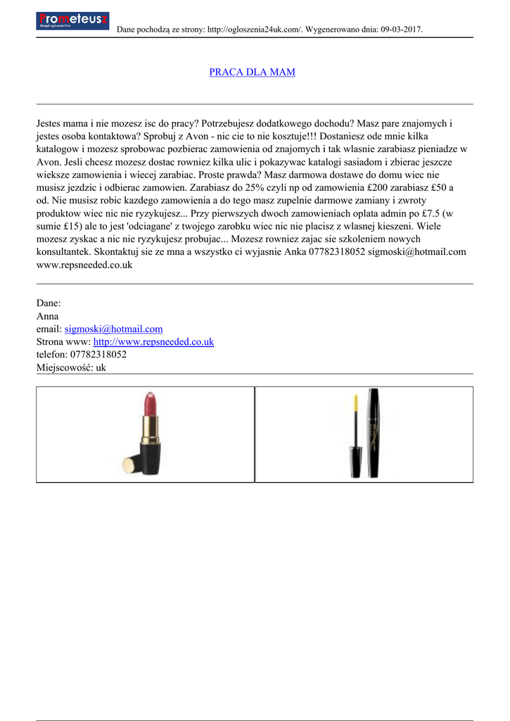 Dane pochodzą ze strony: http://ogloszenia24uk.com/. Wygenerowano dnia: 09-03-2017. PRACA DLA MAM Jestes mama i nie mozesz isc do pracy? Potrzebujesz dodatkowego dochodu? Masz pare znajomych i jestes osoba kontaktowa? Sprobuj z Avon - nic cie to nie kosztuje!!! Dostaniesz ode mnie kilka katalogow i mozesz sprobowac pozbierac zamowienia od znajomych i tak wlasnie zarabiasz pieniadze w Avon. Jesli chcesz mozesz dostac rowniez kilka ulic i pokazywac katalogi sasiadom i zbierac jeszcze wieksze zamowienia i wiecej zarabiac. Proste prawda? Masz darmowa dostawe do domu wiec nie musisz jezdzic i odbierac zamowien. Zarabiasz do 25% czyli np od zamowienia £200 zarabiasz £50 a od. Nie musisz robic kazdego zamowienia a do tego masz zupelnie darmowe zamiany i zwroty produktow wiec nic nie ryzykujesz... Przy pierwszych dwoch zamowieniach oplata admin po £7.5 (w sumie £15) ale to jest 'odciagane' z twojego zarobku wiec nic nie placisz z wlasnej kieszeni. Wiele mozesz zyskac a nic nie ryzykujesz probujac... Mozesz rowniez zajac sie szkoleniem nowych konsultantek. Skontaktuj sie ze mna a wszystko ci wyjasnie Anka 07782318052 [email protected] www.repsneeded.co.uk Dane: Anna email: [email protected] Strona www: http://www.repsneeded.co.uk telefon: 07782318052 Miejscowość: uk