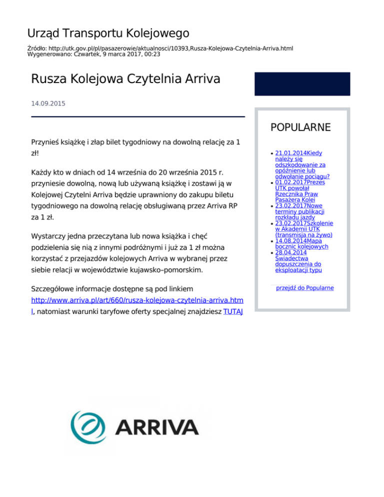 Urząd Transportu Kolejowego Źródło: http://utk.gov.pl/pl/pasazerowie/aktualnosci/10393,Rusza-Kolejowa-Czytelnia-Arriva.html Wygenerowano: Czwartek, 9 marca 2017, 00:23 Rusza Kolejowa Czytelnia Arriva 14.09.2015 POPULARNE Przynieś książkę i złap bilet tygodniowy na dowolną relację za 1 zł! siebie relacji w województwie kujawsko–pomorskim. 21.01.2014Kiedy należy się odszkodowanie za opóźnienie lub odwołanie pociągu? 01.02.2017Prezes UTK powołał Rzecznika Praw Pasażera Kolei 23.02.2017Nowe terminy publikacji rozkładu jazdy 23.02.2017Szkolenie w Akademii UTK (transmisja na żywo) 14.08.2014Mapa bocznic kolejowych 28.04.2014 Świadectwa dopuszczenia do eksploatacji typu Szczegółowe informacje dostępne są pod linkiem przejdź do Popularne ● Każdy kto w dniach od 14 września do 20 września 2015 r. przyniesie dowolną, nową lub używaną książkę i zostawi ją w ● Kolejowej Czytelni Arriva będzie uprawniony do zakupu biletu tygodniowego na dowolną relację obsługiwaną przez Arriva RP ● za 1 zł. ● Wystarczy jedna przeczytana lub nowa książka i chęć ● podzielenia się nią z innymi podróżnymi i już za 1 zł można ● korzystać z przejazdów kolejowych Arriva w wybranej przez http://www.arriva.pl/art/660/rusza-kolejowa-czytelnia-arriva.htm l, natomiast warunki taryfowe oferty specjalnej znajdziesz TUTAJ