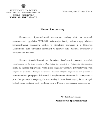 RZECZPOSPOLITA POLSKA MINISTERSTWO SPRAWIEDLIWOŚCI BIURO MINISTRA WYDZIAŁ INFORMACJI Warszawa, dnia 25 maja 2007 r. Komunikat prasowy Ministerstwo Sprawiedliwości dementuje podaną dziś na stronach internetowych tygodnika WPROST informację, jakoby celem wizyty Ministra Sprawiedliwości Zbigniewa Ziobro w Republice Szwajcarii i w Księstwie Lichtenstein było uzyskanie informacji w sprawie kont polskich polityków w szwajcarskich bankach. Minister Sprawiedliwości na dzisiejszej konferencji prasowej wyraźnie poinformował, Ŝe jego wizyta w Republice Szwajcarii i w Księstwie Lichtenstein miała za zadanie poprawienie współpracy organów wymiaru sprawiedliwości tych krajów z polskimi. Wizyta dotyczyła między innymi zagadnień związanych z usprawnieniem przepływu informacji i zwiększeniem efektywności korzystania z procedur prawnych dotyczących ewentualnych kont bankowych, które w tych krajach mogą posiadać osoby podejrzewane w Polsce o popełnienie przestępstw. Wydział Informacji Ministerstwo Sprawiedliwości