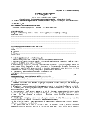 załącznik Nr 1 – Formularz oferty FORMULARZ OFERTY DLA PRZETARGU NIEOGRANICZONEGO „Kompleksowa dostawa gazu ziemnego (sprzedaż i usługa dystrybucji) do obiektu Warszawskiego Centrum Pomocy Rodzinie przy ul. Chlubnej 9A-9D w Warszawie” 1. ZAMAWIAJĄCY: Warszawskie Centrum Pomocy Rodzinie siedziba Zamawiającego: ul. Lipińska 2, 01-833 Warszawa 2. WYKONAWCA: Niniejsza oferta zostaje złożona przez: ( Nazwa(y) Wykonawcy(ów) Adres(y) Wykonawcy(ów) ………………………………………………………………………………………………………………………………………………… ………………………………………………………………………………………………………………………………………………… ………………………………………………………………………………………………………………………………………………… ………………………………………………………………………………………………………………………………………………… ……………………………………………………………………………………………………………………………………………….. 3. OSOBA UPRAWNIONA DO KONTAKTÓW: Imię i nazwisko ………………………………………………………………………………………………………………. Adres ………………………………………………………………………………………………………………………………. Nr telefonu ………………………………………………………………………………………………………………………. Nr faksu……………………………………………………………………………………………………………………………. Adres e-mail ……………………………………………………………………………………………………………………. Ja (my) niżej podpisany(i) oświadczam(y), że: 1) Zapoznałem(liśmy) się z treścią SIWZ dla niniejszego zamówienia. 2) Gwarantuję(my) wykonanie całości niniejszego zamówienia zgodnie z treścią: SIWZ, wyjaśnień do SIWZ oraz jej modyfikacji. 3) Posiadam(y) podpisaną umowę z Operatorem Systemu Dystrybucyjnego (OSD) na świadczenie usług dystrybucji gazu ziemnego / posiadam(y) aktualną koncesję na prowadzenie działalności gospodarczej w zakresie dystrybucji gazu ziemnego wydaną przez Prezesa Urzędu Regulacji Energetyki. (niepotrzebne skreślić) 4) Oferuję(my) wykonanie przedmiotu zamówienia za: cenę łączną netto: …………………………………….. (słownie: ………………………………………………………………………………….................….) zł, stawka podatku od towarów i usług (VAT): ………...... %, cena łączna brutto (z załącznik Nr 1a -Formularz oferty-Zestawienie cenowe): …..............................................................................................................……………… (słownie: ……………………………………………………………………………………..................) zł. 5) Podana całkowita cena brutto obejmuje wszystkie koszty niezbędne do należytego wykonania zamówienia. 6) Oferuję(my) wykonanie przedmiotowego zamówienia w terminie określonym w SIWZ. 7) Uważam(y) się za związanych niniejszą ofertą na czas wskazany w SIWZ, tj. 30 dni od terminu składania ofert. 8) Akceptuję(emy) wzór umowy zawarty w zał. 5 i 6 wraz z załącznikami i w przypadku uznania mojej (naszej) oferty za najkorzystniejszą zobowiązuję(emy) się zawrzeć umowę o treści, jak we wzorze, w miejscu i terminie, jakie zostaną wskazane przez Zamawiającego. 9) Składam(y) niniejszą ofertę we własnym imieniu / jako Wykonawcy wspólnie ubiegający się o udzielenie zamówienia. (niepotrzebne skreślić) 10) Nie uczestniczę(ymy) jako Wykonawca w jakiejkolwiek innej ofercie złożonej w celu udzielenie niniejszego zamówienia. 11) Na podstawie art. 8 ust. 3 ustawy z dnia 29 stycznia 2004 r. Prawo zamówień publicznych (tekst jednolity Dz. U. z 2010 r. nr 113 poz. 759 z późn. zm.), żadne z 1 informacji zawartych w ofercie nie stanowią tajemnicy przedsiębiorstwa w rozumieniu przepisów o zwalczaniu nieuczciwej konkurencji / wskazane poniżej informacje zawarte w ofercie stanowią tajemnicę przedsiębiorstwa w rozumieniu przepisów o zwalczaniu nieuczciwej konkurencji i w związku z niniejszym nie mogą być one udostępniane, w szczególności innym uczestnikom postępowania (niepotrzebne skreślić) l.p. oznaczenie rodzaju (nazwa) informacji strony w ofercie od do ………………………………………………………………………………………………………………………………………………… ………………………………………………………………………………………………………………………………………………… ………………………………………………………………………………………………………………………………………………… ………………………………………………………………………………………………………………………………………………… ……………………………………………………………………………………………………………………………………………….. 12) Nie zamierzam(y) powierzać do podwykonania żadnej części niniejszego zamówienia podwykonawcom /następujące części niniejszego zamówienia zamierzam(y) powierzyć podwykonawcom (niepotrzebne skreślić) : l.p. Wykaz części zamówienia powierzonych podwykonawcy 1 …………………………………………………………………