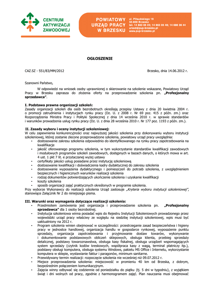 OGŁOSZENIE CAZ.SZ - 551/83/MM/2012 Brzesko, dnia 14.06.2012 r. Szanowni Państwo, W odpowiedzi na wniosek osoby uprawnionej o skierowanie na szkolenie wskazane, Powiatowy Urząd Pracy w Brzesku zaprasza do złożenia oferty na przeprowadzenie szkolenia pn. „Profesjonalny sprzedawca”. I. Podstawa prawna organizacji szkoleń: Zasady organizacji szkoleń dla osób bezrobotnych określają przepisy Ustawy z dnia 20 kwietnia 2004 r. o promocji zatrudnienia i instytucjach rynku pracy (Dz. U. z 2008 r. Nr 69 poz. 415 z późn. zm.) oraz Rozporządzenia Ministra Pracy i Polityki Społecznej z dnia 14 września 2010 r. w sprawie standardów i warunków prowadzenia usług rynku pracy (Dz. U. z dnia 28 września 2010 r. Nr 177 poz. 1193 z późn. zm.). II. Zasady wyboru i oceny instytucji szkoleniowej: W celu zapewnienia konkurencyjności oraz najwyższej jakości szkolenia przy dokonywaniu wyboru instytucji szkoleniowej, której zostanie zlecone przeprowadzone szkolenia, powiatowy urząd pracy uwzględnia: • dostosowanie zakresu szkolenia odpowiednio do identyfikowanego na rynku pracy zapotrzebowania na kwalifikacje • jakość oferowanego programu szkolenia, w tym wykorzystanie standardów kwalifikacji zawodowych i modułowych programów szkoleń zawodowych, dostępnych w bazach danych, o których mowa w art. 4 ust. 1 pkt 7 lit. e przytaczanej wyżej ustawy • certyfikaty jakości usług posiadane przez instytucję szkoleniową • dostosowanie kwalifikacji i doświadczenia kadry dydaktycznej do zakresu szkolenia • dostosowanie wyposażenia dydaktycznego i pomieszczeń do potrzeb szkolenia, z uwzględnieniem bezpiecznych i higienicznych warunków realizacji szkolenia • rodzaj dokumentów potwierdzających ukończenie szkolenia i uzyskanie kwalifikacji • koszty szkolenia • sposób organizacji zajęć praktycznych określonych w programie szkolenia. Przy wyborze Wykonawcy do realizacji szkolenia Urząd zastosuje „Kryteria wyboru instytucji szkoleniowej” , stanowiące Załącznik Nr 2 do niniejszego pisma. III. Warunki oraz wymagania dotyczące realizacji szkolenia: • Przedmiotem zamówienia jest organizacja i przeprowadzenie szkolenia pn. „Profesjonalny sprzedawca” dla 1 osoby bezrobotnej. • Instytucja szkoleniowa winna posiadać wpis do Rejestru Instytucji Szkoleniowych prowadzonego przez wojewódzki urząd pracy właściwy ze względu na siedzibę instytucji szkoleniowej, wpis musi być uaktualniony na 2012 r. • Program szkolenia winien obejmować w szczególności: przestrzeganie zasad bezpieczeństwa i higieny pracy w jednostce handlowej, organizacja handlu w gospodarce rynkowej, wyposażenie punktu sprzedaży, organizacja zapotrzebowania i przyjmowanie dostaw towarów, wykonywanie i dokumentowanie podstawowych obliczeń sklepowych, obsługa klienta, przebieg sprzedaży detalicznej, podstawy towaroznawstwa, obsługa kasy fiskalnej, obsługa urządzeń wspomagających system sprzedaży (czytnik kodów kreskowych, współpraca kasy z wagą, terminal płatniczy itp.), podstawy obsługi komputera, obsługa systemu Windows, pakietu MS Office i Internetu, wykorzystanie komputera w sklepie, wystawianie faktur i paragonów, minimum sanitarne. • Przewidywany termin realizacji: rozpoczęcie szkolenia nie wcześniej niż 09.07.2012 r. • Miejsce przeprowadzenia szkolenia: miejscowość w promieniu 40 km od Brzeska, z dobrym, bezpośrednim połączeniem komunikacyjnym. • Zajęcia winny odbywać się codziennie od poniedziałku do piątku (tj. 5 dni w tygodniu), z wyjątkiem świąt i dni wolnych od pracy, zgodnie z harmonogramem zajęć. Plan nauczania musi obejmować • • • • • przeciętnie nie mniej niż 25 godzin zegarowych w tygodniu, jeżeli przepisy nie stanowią inaczej. Za godzinę zegarową uznaje się 45 minut zajęć edukacyjnych oraz 15 minut przerwy. Zajęcia szkoleniowe nie mogą trwać dłużej niż 8 godzin zegarowych dziennie. Nie dopuszcza się prowadzenia zajęć w formule kształcenia na odległość. Szkolenie zakończy się wydaniem zaświadczenia o ukończeniu kursu i uzyskaniu kwalifikacji zgodnie z Rozporządzeniem MEN z dnia 03.02.2006 r. w sprawie uzyskiwania i uzupełniania przez osoby dorosłe wiedzy ogólnej, umiejętności i kwalifikacji zawodowych w formach pozaszkolnych (Dz. U. z 2006 r., Nr 31, poz. 216) oraz z Rozporządzeniem Ministra Pracy i Polityki Społecznej z dnia 14 września 2010 r. w sprawie standardów i warunków prowadzenia usług rynku pracy (Dz. U. z 2010 r., Nr 177, poz. 1193 z późn. zm.) lub innym odpowiednim dokumentem potwierdzającym ukończenie szkolenia i uzyskanie kwalifikacji. Dokument potwierdzający ukończenie szkolenia musi zawierać: numer z rejestru, imię i nazwisko oraz numer PESEL uczestnika szkolenia, a w przypadku cudzoziemca numer dokumentu stwierdzającego tożsamość, nazwę instytucji szkoleniowej przeprowadzającej szkolenie, formę i nazwę szkolenia, okres trwania szkolenia, miejsce i datę wydania zaświadczenia lub innego dokumentu potwierdzającego ukończenie szkolenia i uzyskanie kwalifikacji, tematy i wymiar godzin zajęć edukacyjnych, podpis osoby upoważnionej przez instytucję szkoleniową przeprowadzającą szkolenie. Wykonawca ma obowiązek ubezpieczyć od następstw nieszczęśliwych wypadków powstałych w związku ze szkoleniem oraz w drodze do miejsca szkolenia i z powrotem : - osobę skierowaną na szkolenie, która nie posiada prawa do stypendium - osobę, która w trakcie szkolenia podejmie zatrudnienie, inną pracę zarobkową lub działalność gospodarczą, od dnia podjęcia zatrudnienia, innej pracy zarobkowej lub działalności gospodarczej do dnia zakończenia szkolenia. Koszty ww. ubezpieczenia zostaną zwrócone Wykonawcy na podstawie polisy potwierdzającej dokonanie opłaty tytułem tego ubezpieczenia - w wysokości nie wyższej niż ubezpieczenie liczone od najniższej sumy ubezpieczenia. Nadzór merytoryczny i pedagogiczny zapewnia Wykonawca. Brak możl