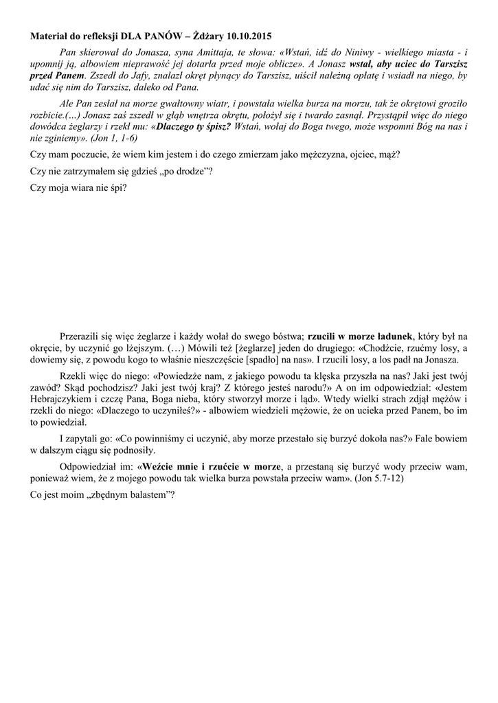 Materiał do refleksji DLA PANÓW – Żdżary 10.10.2015 Pan skierował do Jonasza, syna Amittaja, te słowa: «Wstań, idź do Niniwy - wielkiego miasta - i upomnij ją, albowiem nieprawość jej dotarła przed moje oblicze». A Jonasz wstał, aby uciec do Tarszisz przed Panem. Zszedł do Jafy, znalazł okręt płynący do Tarszisz, uiścił należną opłatę i wsiadł na niego, by udać się nim do Tarszisz, daleko od Pana. Ale Pan zesłał na morze gwałtowny wiatr, i powstała wielka burza na morzu, tak że okrętowi groziło rozbicie.(…) Jonasz zaś zszedł w głąb wnętrza okrętu, położył się i twardo zasnął. Przystąpił więc do niego dowódca żeglarzy i rzekł mu: «Dlaczego ty śpisz? Wstań, wołaj do Boga twego, może wspomni Bóg na nas i nie zginiemy». (Jon 1, 1-6) Czy mam poczucie, że wiem kim jestem i do czego zmierzam jako mężczyzna, ojciec, mąż? Czy nie zatrzymałem się gdzieś „po drodze”? Czy moja wiara nie śpi? Przerazili się więc żeglarze i każdy wołał do swego bóstwa; rzucili w morze ładunek, który był na okręcie, by uczynić go lżejszym. (…) Mówili też [żeglarze] jeden do drugiego: «Chodźcie, rzućmy losy, a dowiemy się, z powodu kogo to właśnie nieszczęście [spadło] na nas». I rzucili losy, a los padł na Jonasza. Rzekli więc do niego: «Powiedzże nam, z jakiego powodu ta klęska przyszła na nas? Jaki jest twój zawód? Skąd pochodzisz? Jaki jest twój kraj? Z którego jesteś narodu?» A on im odpowiedział: «Jestem Hebrajczykiem i czczę Pana, Boga nieba, który stworzył morze i ląd». Wtedy wielki strach zdjął mężów i rzekli do niego: «Dlaczego to uczyniłeś?» - albowiem wiedzieli mężowie, że on ucieka przed Panem, bo im to powiedział. I zapytali go: «Co powinniśmy ci uczynić, aby morze przestało się burzyć dokoła nas?» Fale bowiem w dalszym ciągu się podnosiły. Odpowiedział im: «Weźcie mnie i rzućcie w morze, a przestaną się burzyć wody przeciw wam, ponieważ wiem, że z mojego powodu tak wielka burza powstała przeciw wam». (Jon 5.7-12) Co jest moim „zbędnym balastem”? Co w moim życiu chciałby zmienić? I wzięli Jonasza, i wrzucili go w morze, a ono przestało się srożyć. Pan zesłał wielką rybę, aby połknęła Jonasza. I był Jonasz we wnętrznościach ryby trzy dni i trzy noce. (Jon 1, 15; 2,1) Jakie konkretne decyzje mógłbym podjąć na najbliższe trzy dni? I ulitował się Bóg nad niedolą, którą postanowił na nich sprowadzić, i nie zesłał jej. Nie podobało się to Jonaszowi i oburzył się. (Jon 3, 10; 4,1) Rzekł Pan: «Tobie żal krzewu, którego nie uprawiałeś i nie wyhodowałeś, który w nocy wyrósł i w nocy zginął. A czyż Ja nie powinienem mieć litości nad Niniwą, wielkim miastem, gdzie znajduje się więcej niż sto dwadzieścia tysięcy ludzi, którzy nie odróżniają swej prawej ręki od lewej, a nadto mnóstwo zwierząt?» (Jon 4, 10-11) Czy mam w sobie jakiś żal do Pana Boga w kontekście swojego „bycia mężczyzną”? Do jakiego przebaczenia zaprasza mnie Bóg?