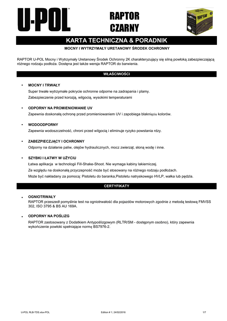 RAPTOR CZARNY KARTA TECHNICZNA & PORADNIK MOCNY I WYTRZYMAŁY URETANOWY ŚRODEK OCHRONNY RAPTOR U-POL Mocny i Wytrzymały Uretanowy Środek Ochronny 2K charakteryzujący się silną powłoką zabezpieczającą różnego rodzaju podłoża. Dostęna jest także wersja RAPTOR do barwienia. WŁAŚCIWOŚCI • MOCNY I TRWAŁY Super trwałe wytrzymałe pokrycie ochronne odporne na zadrapania i plamy. Zabezpieczenie przed korozją, wilgocią, wysokimi temperaturami • ODPORNY NA PROMIENIOWANIE UV Zapewnia doskonałą ochronę przed promieniowaniem UV i zapobiega blaknięciu kolorów. • WODOODPORNY Zapewnia wodoszczelność, chroni przed wilgocią i eliminuje ryzyko powstania rdzy. • ZABEZPIECZJĄCY I OCHRONNY Odporny na działanie paliw, olejów hydraulicznych, mocz zwierząt, słoną wodę i inne. • SZYBKI I ŁATWY W UŻYCIU Łatwa aplikacja w technologii Fill-Shake-Shoot. Nie wymaga kabiny lakierniczej. Ze względu na doskonałą przyczepność może być stosowany na różnego rodzaju podłożach. Może być nakładany za pomocą: Pistoletu do baranka,Pistoletu natryskowego HVLP, wałka lub pędzla. CERTYFIKATY • OGNIOTRWAŁY RAPTOR przeszedł pomyślnie test na ogniotrwałość dla pojazdów motorowych zgodnie z metodą testową FMVSS 302, ISO 3795 & BS AU 169A. • ODPORNY NA POŚLIZG RAPTOR zastosowany z Dodatkiem Antypoślizgowym (RLTR/SM - dostępnym osobno), który zapewnia wykończenie powłoki spełniające normę BS7976-2. U-POL RLB-TDS.xlsx-POL Edition # 1; 24/02/2016 1/7 RAPTOR CZARNY KARTA TECHNICZNA & PORADNIK MOCNY I WYTRZYMAŁY URETANOWY ŚRODEK OCHRONNY PODŁOŻA I PRZYGOTOWANIE Podłoża • Oryginalne pokrycia (lakiery) • Szpachlówka poliestrowa • Laminaty (typu SMC) • Aluminium* • Plastik* • Elektrostatyczne podloza E-coat* • Goły Metal* • Włókno szklane* • Beton* Powierzchnie Drewno* • Laminaty (typu GRP) ocynkowane* Niektóre podłoża wymagają dodatkowego przygotowania powierzchni przed użyciem RAPTORa. Szczegóły znajdują się w sekcji przygotowanie powierzchni. • * Przygotowanie Powierzchni W celu osiągnięcia najlepszych rezultatów z RAPTORem niezbędne jest odpowiednie przygotowanie powierzchni. 1. Usuń wszelkie zanieczyszczenia oraz rdzę. 2. Odtłuść zmywaczem. 3. Przeszlifuj powierzchnię papierem o grubości P120 – P180. 4. Ponownie oczyść powierzchnię. * Na aluminium, goły metal oraz powierzchnie ocynkowane należy przed użyciem RAPTORA zastosować: Zlokalizowane przetarcia podłoża: 2 warstwy podkładu wytrawiającego ACID#8. Duże powierzchnie gołego metalu do reperacji: Pełen system podkładu 2K jest wymagany aby zapewnić optymalną przyczepność i odporność na korozję. * Twarde Plastiki: aby uzyskać optymalną przyczepność, należy zastosować aktywator przyczepności U-POL GRIP#4, U-POL Podład do Plastików S2003. * Drewno: RAPTOR można stosować bezpośrednio na suche, wysezowane drewno. * Beton: aby uzyskać najlepszy rezultat, należy oczyścić powierzchnię i usunąć kurz. Nastepnie uszczelnić podkładem przeznaczonym do betonu przed aplikacją RAPTORa. * Kataforeza na nowych panelach OEM: obrobić powierzchnie gruboziarnistą włókniną ścierną lub papierem ściernym , a następnie oczyścić i odtłuścić. 5. Do trudno dostępnych miejsc , takich jak narożniki wewnętrzne itp należy zastosować odpowiedni aktywator przyczepności aby zapewnić optymalną przyczepność. U-POL RLB-TDS.xlsx-POL Edition # 1; 24/02/2016 2/7 RAPTOR CZARNY KARTA TECHNICZNA & PORADNIK MOCNY I WYTRZYMAŁY URETANOWY ŚRODEK OCHRONNY PROPORCJE MIESZANIA Proporcje Mieszania Proste jak: FILL - SHAKE - SHOOT® NAPEŁNIJ - WSTRZĄŚNIJ - APLIIKUJ RAPTOR : Utwardzacz U-POL SYSTEM 20 Rozcienczalnik Szybki Pistolet do Baranka Pistolet Natryskowy HVLP 3:1 Gotowy do użycia.Rozcieńczalnik nie jest potrzebny. 3:1 Można dodać maksymalnie do 15-20% rozcieńczalnika aby rozcieńczyć produkt. Około 25 % więcej krycia* *Dodanie rozcieńczalnika wpłynie na zawartość VOC produktu. Po prostu FIIL - Napełnij butelkę RAPTORA 250ml utwardzacza, zakręć, SHAKE- Wstrząśnij energicznie zawartość przez conajmniej 2 minuty. SHOOT- Aplikuj. Mieszanie według wagi. Gramy Środek (A) Utwardzacz(B) 1000g 777g 223g 500g 388g 112g Użycie przyspieszacza do utwardzacza nie jest potrzebne. Mieszaj tylko jedną butelke na raz. Oczyść pistolet przed użyciem kolejnej butelki. Nie należy dokręcać nakrętki plastykowej butelki na siłę, ponieważ może to spowodować uszkodzenie nakrętki. 2K UTWARDZACZ IZOCYJANKOWY • Specjalnie zaprojektowany aby zapewnić optymalny rezultat niezależnie od warunków klimatycznych oraz rozmiaru pokrywanej powierzchni. • Utwardzacza RAPTOR nie należy używać samego. Musi być zawsze wymieszany ze śodkiem RAPTOR. Okres Przydatności do Użycia 12 miesięcy w zamkniętym pojemniku. Wieczko musi zostać szczelnie zamknięte po każdym użyciu. Temperatura Przechowywania +5°C (41⁰F) - +25°C (77⁰F) U-POL RLB-TDS.xlsx-POL Edition # 1; 24/02/2016 3/7 RAPTOR CZARNY KARTA TECHNICZNA & PORADNIK MOCNY I WYTRZYMAŁY URETANOWY ŚRODEK OCHRONNY APLIKACJA Standardowa Aplikacja Pistoletem do Baranka 1. Zdejmij nakrętkę z butelki RAPTORa, ze wstrząśnietą wcześniej mieszanką RAPTORa z utwardzaczem. 2. Przykręć Pistolet do Baranka U-POL do butelki RAPTORa. 3. Ustaw ciśnienie powietrza od 2.75 do 4.10 barów (40-60 PSI). 4. Nałóż równomiernie ze stałą prędkością na przygotowane podłoże aby uzyskać pożądaną strukturę. 5. Przy nakładaniu kolejnych warstw, należy pozostawić na czas międzywarstwowy (flash off) 60 minut na odparowanie rozpuszczalników zawartych w produkcie. Wcelu uzyskania pożądanej tekstury U-POL zaleca wykonianie natrysku próbnego RAPTORa. Jak osiągnąć popularne struktury Pistoletem do Baranka U-POL; 1. Standardowa Struktura uzyskana Pistoletem do Baranka: Ø 4 Bary ciśnienia (60 PSI) Ø Odległość od elementu 50cm (1.5 foot) Ø 2 równomierne