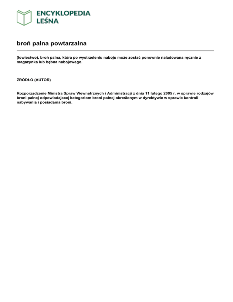 broń palna powtarzalna (łowiectwo), broń palna, która po wystrzeleniu naboju może zostać ponownie naładowana ręcznie z magazynka lub bębna nabojowego. ŹRÓDŁO (AUTOR) Rozporządzenie Ministra Spraw Wewnętrznych i Administracji z dnia 11 lutego 2005 r. w sprawie rodzajów broni palnej odpowiadajacej kategoriom broni palnej określonym w dyrektywie w sprawie kontroli nabywania i posiadania broni.
