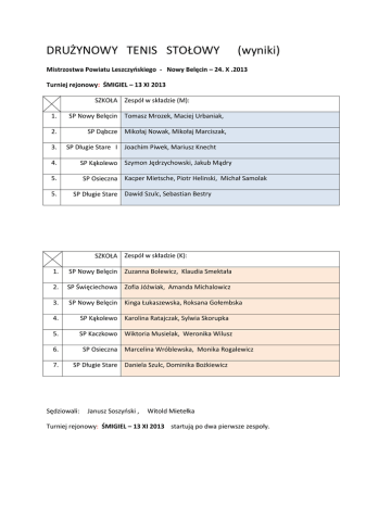 DRUŻYNOWY TENIS STOŁOWY (wyniki) Mistrzostwa Powiatu Leszczyńskiego - Nowy Belęcin – 24. X .2013 Turniej rejonowy: ŚMIGIEL – 13 XI 2013 SZKOŁA Zespół w składzie (M): 1. SP Nowy Belęcin Tomasz Mrozek, Maciej Urbaniak, 2. 3. SP Dąbcze Mikołaj Nowak, Mikołaj Marciszak, SP Długie Stare I Joachim Piwek, Mariusz Knecht 4. SP Kąkolewo Szymon Jędrzychowski, Jakub Mądry 5. 5. SP Osieczna Kacper Mietsche, Piotr Helinski, Michał Samolak SP Długie Stare Dawid Szulc, Sebastian Bestry SZKOŁA Zespół w składzie (K): 1. SP Nowy Belęcin Zuzanna Bolewicz, Klaudia Smektała 2. SP Święciechowa Zofia Jóźwiak, Amanda Michalowicz 3. SP Nowy Belęcin Kinga Łukaszewska, Roksana Gołembska 4. SP Kąkolewo Karolina Ratajczak, Sylwia Skorupka 5. SP Kaczkowo Wiktoria Musielak, Weronika Wilusz 6. 7. SP Osieczna Marcelina Wróblewska, Monika Rogalewicz SP Długie Stare Daniela Szulc, Dominika Bożkiewicz Sędziowali: Janusz Soszyoski , Witold Mietełka Turniej rejonowy: ŚMIGIEL – 13 XI 2013 startują po dwa pierwsze zespoły.