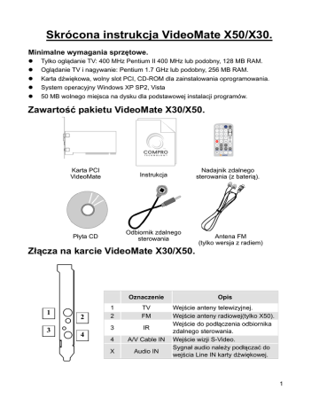 Skrócona instrukcja VideoMate X50/X30. Minimalne wymagania sprzętowe. z z z z z Tylko oglądanie TV: 400 MHz Pentium II 400 MHz lub podobny, 128 MB RAM. Oglądanie TV i nagywanie: Pentium 1.7 GHz lub podobny, 256 MB RAM. Karta dźwiękowa, wolny slot PCI, CD-ROM dla zainstalowania oprogramowania. System operacyjny Windows XP SP2, Vista 50 MB wolnego miejsca na dysku dla podstawowej instalacji programów. Zawartość pakietu VideoMate X30/X50. Karta PCI VideoMate Instrukcja Nadajnik zdalnego sterowania (z baterią). Płyta CD Odbiornik zdalnego sterowania Złącza na karcie VideoMate X30/X50. 1 3 2 4 Antena FM (tylko wersja z radiem) Oznaczenie Opis 1 2 TV FM 3 IR 4 A/V Cable IN X Audio IN Wejście anteny telewizyjnej. Wejście anteny radiowej(tylko X50). Wejście do podłączenia odbiornika zdalnego sterowania. Wejście wizji S-Video. Sygnał audio należy podłączać do wejścia Line IN karty dźwiękowej. 1 Instalacja. 1. Wyłączyć całkowicie komputer z sieci zasilającej i otworzyć obudowę. 2. Umieścić kartę VideoMate w wolnym slocie PCI. Compro rekomenduje slot PCI 4 licząc od karty graficznej (zdecydowanie nie zaleca się nr 1 i 5). 3. Dokręcić kartę śrubką, zmontować obudowę i podłączyć kabel zasilający. 4. Podłączyć antenę TV lub przewód telewizji kablowej do gniazda antenowego TV karty. Podłączyć załączoną antenę FM lub inną radiową do gniazda FM (tylko w wersji X-50). 5. Po uruchomieniu systemu włożyć załączoną płytę CD do czytnika. Jeżeli instalator nie pojawi się automatycznie, należy uruchomić „ręcznie” program “setup.exe” z głównego katalogu CD. Zaleca się wybrać pełną instalację „Complete”. Zostaną zainstalowane następujące programy: sterowniki karty VideoMate TV, ComproDTV do obsługi TV oraz ComproFM – opcja dla karty z radiem. 6. Jeżeli pojawi się komunikat informujący, że instalowane oprogramowanie nie było na testach w firmie Microsoft, należy wybrać opcję „Kontynuuj mimo to”. 7. Naciskać w razie potrzeby „Dalej” (Next), aby zainstalować ComproDTV, ComproFM (tylko wersja X50). Po każdym zainstalowanym programie nacisnąć „Zakończ” (Finish) w celu kontynuacji procesu instalacyjnego. 8. Po zakończeniu instalacji nacisnąć „Zakończ” (Finish). Nastąpi restart komputera. Icon ComproDTV 3 ComproDVD 2 ZOOM Zoom In/Out DVD TV CHAN Start / Stop ComproDVD 2 Start / Stop ComproDTV 2 Zmiana kanału Nie używane VOL Siła głosu Siła głosu Nagrywanie TV / S-Video Zdjęcie z ekranu Zaznaczenie Wstecz Do tyłu Timeshifting Stop Do przodu Napisy (NTSC) Playback Stop Do przodu Wybór języka RECALL SURF MTS Poprzedni kanał Przegląd stacji Mono/Stereo/SAP Nie używane DVD angle Zmiana języka Snapshot Zdjęcie z ekranu Nie używane SLEEP Auto wyłączanie Powtórka A do B REC TV/VIDEO << Play/Pause Stop >> CC 2 ComproDTV 3 Panel kontrolny. Panel kontrolny programu ComproDTV 3 przypomina sterowanie magnetowidu. Należy zwrócić uwagę, że niektóre funkcje są dostępne tylko w określonych sytuacjach zależnych od odbieranego programu TV, czy posiadanego sprzętu. Poniższe rysunki prezentują funkcje przycisków i odpowiadające im skróty klawiaturowe (Hot Key). Kanał w górę (Page Up) Stop Siła głosu z listą (I) (S) (- , +) Klawiatura Nagrywanie (R) Numeryczna Opcje nagrywania (W) Play (P) Kanał w dół Mute – Wyciszenie Pauza (U) (Page down) (M) Blokada Pomoc Dokowanie Minimalizacja Pełny ekran Zamknięcie panela (H) (D) (G) (Z) (CTRL+X) Przesuwanie do tyłu Wskaźnik funkcji Przesuwanie do przodu (Strzałka w lewo) Timeshift (Strzałka w prawo) Poziom dźwięku Klawiatura Numeryczna Brak Opcje Programator Źródło Odtwarzanie z Powrót do funkcji (O) (B) (V) powtórzeniem poprzedniego kanału (N) Przegląd wieku kanałów (F) Zdjęcie z ekranu (Space) Timeshift Dodaj okno Usuń okno Zamiana Zamknięcie okien (T) podglądu (F3) podglądu (F2) okien (F5) podglądu (F6) Napisy (NTSC) Teletext (X) EPG (E) Brak funkcji 3 Rozwiązywanie problemów. Sterowniki. Większość problemów w użytkowaniu kart telewizyjnych wynika z nieprawidłowej instalacji sterowników (sterowniki WDM – Windows Device Model). Jeżeli masz problemy podczas oglądania TV, nagrywania lub korzystania z funkcji timeshifting live TV, proszę sprawdzić stan sterowników WDM w Menadżerze urządzeń systemu Windows.. Jeżeli sterowników tam nie ma lub coś jest z nimi nie w porządku, proszę odinstalować VideoMate TV i zainstalować ponownie. Należy korzystać z systemowej funkcji Dodaj/Usuń programy. Reinstalacja sterowników powinna rozwiązać problem. Jeżeli problem nadal występuje, może to oznaczać konflikt przerwań IRQ. Na przykład karta sieciowa lub dźwiękowa w komputerze korzysta z tego samego przerwania IRQ co tuner TV VideoMate. Użyj Menadżera Urządzeń do zdiagnozowania problemu: wybierz opcje „Widok - > Zasoby według typu" i kliknij na znaczek "+" obok „Żądanie przerwania (IRQ)”. Jeżeli jakieś inne urządzenie współdzieli przerwanie z tunerem TV, wyjmij kartę TV i umieść ją w innym slocie PCI. Następnie odinstaluj i zainstaluj ponownie sterownik do karty. Takie działanie powinno w końcu przynieść oczekiwany rezultat w postaci samodzielnego przerwania IRQ dla karty TV. W trosce o wspólne dobro jakim jest środowisko naturalne i zgodnie z Dyrektywą Unii Europejskiej dotyczącą odpadów produktów elektrycznych i elektronicznych, …„produkty oraz wyposażenie elektryczne i elektroniczne” nie mogą być traktowane jako śmieci komunalne i umieszczane w pojemnikach przeznaczonych na tego typu śmieci. Producenci i dystrybutorzy takich urządzeń są zobowiązani do ich odbierania w momencie, gdy te produkty zostaną wycofane z użycia. Dowiedz się gdzie znajduje się odpowiedni punkt zbiorczy, gdy twoje urządzenie będzie już wycofywane z użycia. P/N: 3GA0310314 4