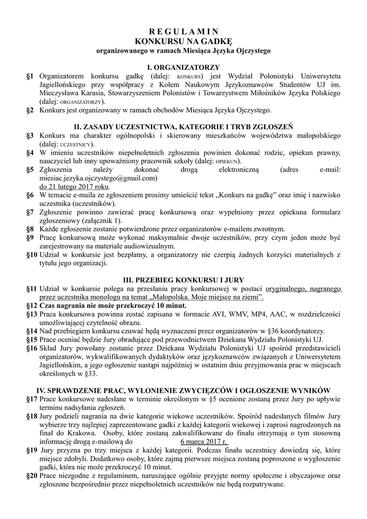 REGULAMIN KONKURSU NA GADKĘ organizowanego w ramach Miesiąca Języka Ojczystego I. ORGANIZATORZY §1 Organizatorem konkursu gadkę (dalej: KONKURS) jest Wydział Polonistyki Uniwersytetu Jagiellońskiego przy współpracy z Kołem Naukowym Językoznawców Studentów UJ im. Mieczysława Karasia, Stowarzyszeniem Polonistów i Towarzystwem Miłośników Języka Polskiego (dalej: ORGANIZATORZY). §2 Konkurs jest organizowany w ramach obchodów Miesiąca Języka Ojczystego. II. ZASADY UCZESTNICTWA, KATEGORIE I TRYB ZGŁOSZEŃ §3 Konkurs ma charakter ogólnopolski i skierowany mieszkańców województwa małopolskiego (dalej: UCZESTNICY). §4 W imieniu uczestników niepełnoletnich zgłoszenia powinien dokonać rodzic, opiekun prawny, nauczyciel lub inny upoważniony pracownik szkoły (dalej: OPIEKUN). §5 Zgłoszenia należy dokonać drogą elektroniczną (adres e-mail: [email protected]) do 21 lutego 2017 roku. §6 W temacie e-maila ze zgłoszeniem prosimy umieścić tekst „Konkurs na gadkę” oraz imię i nazwisko uczestnika (uczestników). §7 Zgłoszenie powinno zawierać pracę konkursową oraz wypełniony przez opiekuna formularz zgłoszeniowy (załącznik 1). §8 Każde zgłoszenie zostanie potwierdzone przez organizatorów e-mailem zwrotnym. §9 Pracę konkursową może wykonać maksymalnie dwoje uczestników, przy czym jeden może być zarejestrowany na materiale audiowizualnym. §10 Udział w konkursie jest bezpłatny, a organizatorzy nie czerpią żadnych korzyści materialnych z tytułu jego organizacji. III. PRZEBIEG KONKURSU I JURY §11 Udział w konkursie polega na przesłaniu pracy konkursowej w postaci oryginalnego, nagranego przez uczestnika monologu na temat „Małopolska. Moje miejsce na ziemi”. §12 Czas nagrania nie może przekroczyć 10 minut. §13 Praca konkursowa powinna zostać zapisana w formacie AVI, WMV, MP4, AAC, w rozdzielczości umożliwiającej czytelność obrazu. §14 Nad przebiegiem konkursu czuwać będą wyznaczeni przez organizatorów w §36 koordynatorzy. §15 Prace oceniać będzie Jury obradujące pod przewodnictwem Dziekana Wydziału Polonistyki UJ. §16 Skład Jury powołany zostanie przez Dziekana Wydziału Polonistyki UJ spośród przedstawicieli organizatorów, wykwalifikowanych dydaktyków oraz językoznawców związanych z Uniwersytetem Jagiellońskim, a jego ogłoszenie nastąpi najpóźniej w ostatnim dniu przyjmowania prac w miejscach określonych w §33. IV. SPRAWDZENIE PRAC, WYŁONIENIE ZWYCIĘZCÓW I OGŁOSZENIE WYNIKÓW §17 Prace konkursowe nadesłane w terminie określonym w §5 ocenione zostaną przez Jury po upływie terminu nadsyłania zgłoszeń. §18 Jury podzieli nagrania na dwie kategorie wiekowe uczestników. Spośród nadesłanych filmów Jury wybierze trzy najlepiej zaprezentowane gadki z każdej kategorii wiekowej i zaprosi nagrodzonych na finał do Krakowa. Osoby, które zostaną zakwalifikowane do finału otrzymają o tym stosowną informację drogą e-mailową do 6 marca 2017 r. §19 Jury przyzna po trzy miejsca z każdej kategorii. Podczas finału uczestnicy dowiedzą się, które miejsce zdobyli. Dodatkowo osoby, które zajmą pierwsze miejsca zostaną poproszone o wygłoszenie gadki, która nie może przekroczyć 10 minut. §20 Prace niezgodne z regulaminem, naruszające ogólnie przyjęte normy społeczne i obyczajowe oraz zgłoszone bezpośrednio przez niepełnoletnich uczestników nie będą rozpatrywane. §21 W przypadku wątpliwości co do oceny prac konkursowych lub rozstrzygnięcia konkursu, decydujący głos posiada przewodniczący Jury. §22 Po ogłoszeniu wyników i wręczeniu nagród organizatorzy zamieszczą w miejscach określonych w §33 ogólny komentarz Jury do nadesłanych prac. §23 Finał odbędzie się 24 marca 2017 r. w Krakowie. O miejscu, w którym się odbędzie zakwalifikowani uczestnicy zostaną poinformowani drogą e-mailową. V. NAGRODY §24 Laureaci konkursu otrzymają nagrody rzeczowe oraz dyplomy, których rozdanie nagród nastąpi 24 marca 2017 roku. §25 O rozdaniu nagród laureaci konkursu zostaną poinformowani najpóźniej 6 marca 2017 roku. §26 Jeżeli zwycięzca nie odbierze nagrody w ww. terminie, możliwe będzie odebranie jej w ciągu kolejnych 14 dni, po wcześniejszym ustaleniu z koordynatorami. §27 Niepełnoletni laureaci konkursu zobowiązani są przybyć na finał wraz z opiekunem bądź upoważnioną przez niego inną pełnoletnią osobą; organizatorzy nie ponoszą odpowiedzialności za uczestników podczas ich udziału w rozdaniu nagród, przejazdu na to wydarzenie i powrotu z niego. §28 Organizatorzy nie pokrywają kosztów przejazdu uczestników i opiekunów na finał, zapewniają jednak zaświadczenia o udziale w wydarzeniu. VI. POSTANOWIENIA KOŃCOWE I KONTAKT Z KOORDYNATORAMI KONKURSU §29 Udział w konkursie jest dobrowolny i oznacza akceptację postanowień niniejszego regulaminu. §30 Złamanie przez uczestnika któregokolwiek z postanowień niniejszego regulaminu może skutkować wykluczeniem z konkursu. §31 Przystąpienie do konkursu i podanie danych osobowych jest równoznaczne z wyrażeniem zgody na ich przetwarzanie przez organizatorów dla potrzeb niezbędnych do przeprowadzenia, rozstrzygnięcia, dokumentacji i rozliczenia konkursu (zgodnie z Ustawą z dnia 29.08.1997 roku o Ochronie Danych Osobowych; tekst jednolity: Dz. U. z 2002r. Nr 101, poz. 926 ze zm.). §32 Przystąpienie do konkursu wiąże się z nieodwołalną zgodą uczestnika na bezpłatne zarejestrowanie w czasie konkursu oraz utrwalenie za pomocą wszelkich technik na nośnikach audiowizualnych jego wizerunku i danych, a także na przeniesienie autorskich praw majątkowych do nagrodzonych prac konkursowych w materiałach służących pośrednio lub bezpośrednio promocji konkursu, bez ograniczeń czasowych i przy pomocy mediów elektronicznych i papierowych. §33 Wszelkie informacje o konkursie organizatorzy będą zamieszczać na stronach internetowych Miesiąca Języka Ojczyste