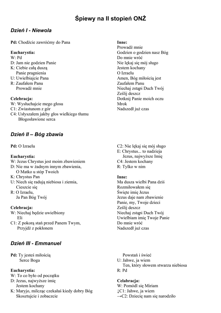 Śpiewy na II stopień ONŻ Dzień I - Niewola Pd: Chodźcie zawróćmy do Pana Eucharystia: W: Pd D: Jam nie godzien Panie K: Ciebie całą duszą Panie pragnienia U: Uwielbiajcie Pana R: Zaufałem Panu Prowadź mnie Celebracja: W: Wysłuchajcie mego głosu C1: Zwiastunom z gór C4: Usłyszałem jakby głos wielkiego tłumu Błogosławione serca Inne: Prowadź mnie Godzien o godzien nasz Bóg Do mnie wróć Nie lękaj się mój sługo Jestem kochany O Izraelu Amen, Bóg miłością jest Zaufałem Panu Niechaj zstąpi Duch Twój Ześlij deszcz Dotknij Panie moich oczu Mrok Nadszedł już czas Dzień II – Bóg zbawia Pd: O Izraelu Eucharystia: W: Jezus Chrystus jest moim zbawieniem D: Nie ma w żadnym innym zbawienia, O Matko u stóp Twoich K: Chrystus Pan U: Niech się radują niebiosa i ziemia, Cieszcie się R: O Izraelu, Ja Pan Bóg Twój Celebracja: W: Niechaj będzie uwielbiony Eli C1: Z pokorą stań przed Panem Twym, Przyjdź z pokłonem C2: Nie lękaj się mój sługo E: Chrystus... to nadzieja Jezus, najwyższe Imię C4: Jestem kochany R: Tylko w nim Inne: Ma dusza wielbi Pana dziś Rozmiłowałem się Święte imię Jezus Jezus daje nam zbawienie Panie, my, Twoje dzieci Ześlij deszcz Niechaj zstąpi Duch Twój Uwielbiam imię Twoje Panie Do mnie wróć Nadszedł już czas Dzień III - Emmanuel Pd: Ty jesteś miłością Serce Boga Eucharystia: W: To co było od początku D: Jezus, najwyższe imię Jestem kochany K: Maryjo, milcząc czekałaś kiedy dobry Bóg Skosztujcie i zobaczcie Powstań i świeć U: Jahwe, ja wiem Ten, który słowem stwarza niebiosa R: Pd Celabracja: W: Pomódl się Miriam ↓C1: Jahwe, ja wiem →C2: Dziecię nam się narodziło E: Nie ma w żadnym innym zbawienia Światłem i zbawieniem mym Ad: Jezus mą miłością jest Uwielbiajmy Chrystusa, bo kocha nas jak nikt Bóg jest miłością Inne: Jezus, najwyższe Imię Jezus mój W lekkim powiewie Ruah O Ty, co mieszkasz sam Dzień IV – Bóg wzywa Pd: Amen, Bóg miłością jest Eucharystia: W: Z pokorą stań przed Panem Twym D: Ty Boże wszystko wiesz Posłuchaj córko K: Lud Twój Panie, Amen, Bóg miłością jest U: Na zawsze śpiewać chcę R: Zaufałem Panu, Ty jesteś miłością Celebracja: W: Oto Pan Bóg przyjdzie Tyś Panie dla nas Św: Duchu Ogniu M: Ześlij o Chryste Proc: Prowadź mnie Matko, która nas znasz Prowadź Panie mnie nad strumień M: Światło na oświecenie pogan R: O Matko z częstochowskiego wizerunku Inne: O Panie jam Twój sługa Ty jesteś Bogiem mym I rzekł Bóg stało się Dzień V – Bóg posyła Pd: Oto ja, poślij mnie Barka Eucharystia: W: Idźcie na cały świat Boże zmiłuj się nad nami D: Otwórzcie serca K: Amen, Bóg miłością jest Nie lękaj się mój sługo Pan jest mocą U: Zaśpiewajcie Panu nową pieśń Błogosław Pana ma duszo Na zawsze śpiewać chcę R: Oto ja, poślij mnie Celebracja: W: Błogosław Pana ma duszo Barka C1: Ty Boże wszystko wiesz C2: O Panie jam Twój sługa Nie lękaj się mój sługo C4: Nie lękaj się mój sługo O Jahwe, Boże ojców moich Niewyczerpane są łaski M: Duchu Święty Boże przyjdź Tchnij moc Bądź mym oddechem Jest w sercu Inne: Z pokorą stań Posyłam was Otom jest Wy jesteście solą ziemi Dzień VI – Bóg walczy Pd: Mój grzech dziś leży u mych stóp Pustynia jest łaską Eucharystia: W: Podnieśmy sztandary D: Jestem kochany K: Bóg nad Swym ludem Śpiewaj sercem U: Uwielbiajcie Pana R: Pd Celebracja; W: Chrystus to nadzieja ↑E: Zaśpiewajcie Panu nową pieśń Niech się radują ↓E: Serce wielkie nam daj M: Godzien jesteś Usłyszałem jakby głos O Pani ufność nasza Inne: Nie samym chlebem Dziś w kościele Pan jest mocą Idziemy w rytm pieśni miłości Wywyższam Cię, Tyś wielki Bóg O Boże mój Witaj najczystsza Królowo serc Nadszedł już czas by obudzić się Cieszcie się, weselcie się Miałem Pana Oto Pan Bóg nasz Jeśli lud mój upokorzy się Jam nie godzien Panie Wielbić mego Pana chcę Jezus zwyciężył Każdy dzień jest zwycięstwem Bądź mym oddechem Dzień VII – Plagi, Nawrócenie Pd: Nie ukochałem mego krzyża Ciągle zaczynam od nowa Eucharystia: W: Chodźcie zawróćmy D: Wysłuchajcie mego głosu K: Amen, Bóg miłością jest Jeśli lud mój upokorzy się Jakże pójdziemy U: Tylko w Nim jest zbawienie me R: Pd Celebracja: W: Bliskie jest królestwo Boże C1: Pustynia jest łaską C2: Nie ma Cię M: Jam nie godzien Panie Ciągle zaczynam od nowa Chrystus cierpiał za nas Inne: Panie mój przychodzę dziś Panie przebacz Ty jesteś Bogiem mym Oczyść serce me Do mnie wróć I rzekł Bóg stało się Mrok Przystąpmy chwalmy Go Niechaj zstąpi Duch Twój Jezus daje nam zbawienie Dzień VIII - Obłok Pd: O Jezu, Boże utajony Jak wlecze się Eucharystia: W: Przystąpię do ołtarza Bożego Wstań, który śpisz D: Chrystus...to nadzieja Chrystus cierpiał za nas K: Zbliżam się w pokorze O Panie otwierasz rękę swoją Panie pragnienia ludzkich serc U: Śpiewaj...sercem całym O Jezu Boże utajony R: W świętych znakach Ja wierzę, że to Jezus Jezusie, Synu Dawida Celebracja: W: Błogosławiony i jedyny Władco ↓C2: Jahwe, ja wiem ↓E: Wierzymy w Ciebie Chryste C4: Wy jesteście Wstań, który śpisz R: W lekkim powiewie Serce Boga Ad: O Jezu Boże utajony O Piękności niestworzona In manus Tuas W ciemności idziemy W naszych ciemnościach Jezu Tyś jest światłością mej duszy Nic nas nie zdoła odłączyć od Ciebie Z Tobą ciemność Inne: Duchu Święty przyjdź, niech wiara zagości Dotknij Panie moich oczu Otwórz me oczy Przystąpmy, chwalmy Go Wierzymy w Ciebie Chryste Dzień IX - Baranek Pd: Boży Baranku Baranku, daj mi zmartwychwstanie Eucharystia: W: Błogosławieni, którzy zostali wezwani D: O Panie jam Twój sługa K: Tyś w wieczerniku Jak Cię zrozumieć U: Godzien jesteś Święty... jest nasz Bóg Błogosławione serca R: Pd W: Ludu kapłański Błogosławieni, którzy zostali wezwani C1: Eli Po homilii: Boży Baranku C4: Godzien j