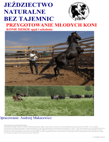 JEŹDZIECTWO NATURALNE BEZ TAJEMNIC PRZYGOTOWANIE MŁODYCH KONI KONIE DZIKIE spęd i szkolenie Opracowanie: Andrzej Makacewicz Copyright and Confidentiality Notice All copyright design rights and other intellectual property rights in the works contained in this presentation are the property of JNBT. The concepts, techniques and ideas portrayed in this presentation are all the confidential and proprietary information of JNBT. They are disclosed to you exclusively for the purpose of evaluating them with a view to contracting with JNBT for a project. You are not permitted to copy or make use of any of the materials or ideas contained in this presentation other than through JNBT or with its express written consent and by continuing with this presentation after reading this notice you accept and agree to be bound by these conditions. © JNBT 2013 „Jeździectwo Naturalne bez Tajemnic ” Przygotowanie Młodych Koni-Konie Dzikie Prowadzenie: Andrzej Makacewicz i gościnnie Joe Turner (Montana) Termin: 9-13 październik 2013 Lokalizacja: ośrodek Ul, Ostrowice, k. Połczyn Zdrój i Drawsko Pomorskie, ZachodnioPomorskie; tel 662095085, www.ul.net.pl Program Przygotowanie Młodych Koni – Konie Dzikie jest częścią specjalizowanego szkolenia w ramach kompleksowego programu „Jeździectwo Naturalne bez Tajemnic”, który oprócz szkoleń specjalizowanych jak Szkolenie Imprintingowe Źrebiąt czy Rozwiązywanie Narowów ma program podstawowy podzielony na 5 poziomów Relations L1, L2, L3 oraz L4 Wolność i L5 Harmonia. Szkolenie to jest unikalne ze względu na możliwość pracy z końmi dzikimi ze stada ponad 360 szt. Szkolenie (przyjazd możliwy wtorek 8.10 wieczór) jest podzielone na 2 części-spęd i zajeżdżanie: 1. 9 i 10.10 śr/czw spęd stada 360 szt przez zgłoszonych jeźdźców pod siodłem (na koniu własnym lub z ośrodka) . Rano odprawa, przydział koni, wyjazd do stada, jego ogarnięcie i całodniowy przepęd ca 20km oraz po południu sortowanie do wieczora. Rano w czwartek cd sortowania i przepęd stada z powrotem. 2. 11-13.10 pt/niedz od godz 9.00 do niedzieli godz 17.00 po 2 h wykłady i 2x2h pracy w 3 roundpenach osób zgłaszających się do szkolenia w roundpenach. Wykłady teoretyczne odbywać się będą w sali klubowej a zajęcia praktyczne, z wyselekcjonowanymi dzikimi końmi lub dowiezionymi młodymi końmi równolegle na 3 roundpenach. Program kursu obejmuje wykłady z teorii jeździectwa naturalnego wraz z projekcjami multimedialnymi oraz praktykę w roundpenie a także obserwacje największego w Europie stada zdziczałych koni. Program oparty jest o najnowsze osiągnięcia dotyczące behawioryzmu oraz treningu naturalnego łącząc nurty kilku największych szkół jeździectwa naturalnego. Daje on gruntowne podstawy teoretyczne i praktyczne zastosowania metod naturalnych w zajeżdżaniu młodych koni budując od razu prawidłowe relacje koń/trener/jeździec do pierwszego siodłania. Obejmuje zagadnienia z zakresu psychologii koni, behawioryzmu, budowania zaufania i przywództwa, nauki czytania koni, systemu komunikacji za pomocą języka Equus, technik pierwszego siodłania i pierwszego wsiadania, oswajania z kantarem i wędzidłem, odczulania, bezpieczeństwa. Prowadzi do zaawansowanej wiedzy pozwalającej zajeżdżać młode konie metodami naturalnymi w ciągu kilku sesji. W szkoleniu można uczestniczyć: 1.Jako uczestnik w spędzie na koniu własnym lub z ośrodka 2 dni 2. Jako uczestnik pod nadzorem wykładowców w roundpenie z dzikim odłowionym koniem lub młodym dowiezionym 3 dni w sesjach 2x2h dziennie 3. Jako słuchacz uczestnicząc jako obserwator w wykładach i pracy na roundpenie oraz pracując w grupie przy selekcji dzikich koni Koszt uczestnictwa: 1. 9-10.10 spęd 600 zł (plus boks dla własnego konia lub wynajem konia z ośrodka) 2 dni 2. 11-13.10- 3 dni szkolenia z pracą w roundpenie z dzikim koniem lub dowiezionym 750 zł 3. słuchacz 360 zł/kurs trzydniowy Studenci z certyfikatami programu JNBT odpowiednio niżej 1) 550 zł 2) 700 zł i b) 320 zł Ośrodek agroturystyczny Ul jest rozłożony na kilku tysiącach hektarów w pięknej, dzikiej, pagórkowatej i pełnej jezior okolicy jeziora Sicino. Jest jednym z niewielu w Polsce ośrodków hodujących dziko tabun ponad 360 koni co daje niezwykłą możliwość obserwacji i nauki szkolenia na dzikich zwierzętach. Ośrodek posiada kilkanaście pokoi gościnnych oraz wyżywienie. Osoba do kontaktu w sprawie rezerwacji pobytu p Marek tel 662095085. Można także zakwaterować się w pobliskim ośrodku Ranczo w dolinie tel 943615333 [email protected] lub w odległości 15 km w przepięknej posiadłości Folwark Karpno tel 516164900 www.karpno.pl , [email protected] wszędzie podając hasło JNBT w celu uzyskania niskich cen. Ilość uczestników spędu bez ograniczeń a uczestników kursu z koniem ograniczona. Wykłady w języku polskim Andrzej Makacewicz, Joe Turner (zwycięzca tegorocznego Myśląc o Koniu https://www.facebook.com/pages/Je%C5%BAdziectwo-Naturalne-bez-Tajemnic/172996769379218 ) z tłumaczeniem oraz JNBT TEAM. Osoby biorące udział z końmi muszą okazać ubezpieczenie NW oraz posiadać kask. Praca osób z końmi jest rejestrowana filmowo i omawiana na zajęciach. Kurs kończy się wydaniem imiennego certyfikatu. Certyfikat ten daje także możliwość skorzystania ze specjalnych obniżonych w cenie ubezpieczeń hippicznych. Uczestnicy otrzymują też materiały w postaci skryptu. Zgłoszenia przyjmowane są pod telefonem 22 3931090 lub [email protected]. JNBT 2012 (fot K. Jarczewski, JNBT)