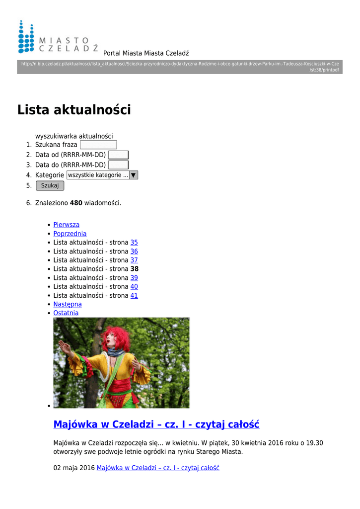 Portal Miasta Miasta Czeladź http://n.bip.czeladz.pl/aktualnosci/lista_aktualnosci/Sciezka-przyrodniczo-dydaktyczna-Rodzime-i-obce-gatunki-drzew-Parku-im.-Tadeusza-Kosciuszki-w-Cze /st:38/printpdf Lista aktualności wyszukiwarka aktualności 1. Szukana fraza 2. Data od (RRRR-MM-DD) 3. Data do (RRRR-MM-DD) 4. Kategorie wszystkie kategorie ... ▼ 5. Szukaj 6. Znaleziono 480 wiadomości. Pierwsza Poprzednia Lista aktualności - strona 35 Lista aktualności - strona 36 Lista aktualności - strona 37 Lista aktualności - strona 38 Lista aktualności - strona 39 Lista aktualności - strona 40 Lista aktualności - strona 41 Następna Ostatnia Majówka w Czeladzi – cz. I - czytaj całość Majówka w Czeladzi rozpoczęła się… w kwietniu. W piątek, 30 kwietnia 2016 roku o 19.30 otworzyły swe podwoje letnie ogródki na rynku Starego Miasta. 02 maja 2016 Majówka w Czeladzi – cz. I - czytaj całość Spektakl teatralny pt. „Przygody drwala Bartłomieja” czytaj całość Miasto Czeladź wraz z Spółdzielczym Domem Kultury „Odeon” serdecznie zapraszają wszystkie dzieciaki na spektakl teatralny pt. „Przygody drwala Bartłomieja” 02 maja 2016 Spektakl teatralny pt. „Przygody drwala Bartłomieja” - czytaj całość Mistrzowie wiedzy o Czeladzi - czytaj całość 27 kwietnia w siedzibie Muzeum Saturn odbył się finał Konkursu Wiedzy o Czeladzi, nad którym honorowy patronat tradycyjnie objął Burmistrz Miasta Czeladź. 29 kwietnia 2016 Mistrzowie wiedzy o Czeladzi - czytaj całość Gminny Program Rewitalizacji Miasta Czeladź na lata 2016-2023 - czytaj całość Burmistrz Miasta Czeladź przystąpił do wykonania Strategicznej Oceny Oddziaływania na Środowisko dla opracowania „Gminnego Programu Rewitalizacji Miasta Czeladź na lata 2016-2023”. 29 kwietnia 2016 Gminny Program Rewitalizacji Miasta Czeladź na lata 2016-2023 - czytaj całość Setne urodziny Stanisławy Lesiak - czytaj całość W czwartek, 28 kwietnia br. czeladzianka Stanisława Lesiak obchodziła swoje setne urodziny. 29 kwietnia 2016 Setne urodziny Stanisławy Lesiak - czytaj całość Burmistrz wyróżnił najzdolniejszych - czytaj całość Podczas wczorajszej sesji Rady Miejskiej w Czeladzi Burmistrz Miasta Czeladź Zbigniew Szaleniec nagrodził tegorocznych laureatów Wojewódzkich Konkursów Przedmiotowych. 29 kwietnia 2016 Burmistrz wyróżnił najzdolniejszych - czytaj całość Strategia Rozwoju Miasta Czeladź - konsultacje społeczne - czytaj całość 29 kwietnia 2016 r. rozpoczynają się konsultacje społeczne projektu Strategii Rozwoju Miasta Czeladź na lata 2016-2023. 29 kwietnia 2016 Strategia Rozwoju Miasta Czeladź - konsultacje społeczne - czytaj całość „Rodzina 500+” - czytaj całość W dniu 27.04.2016 roku ruszyły w Czeladzi pierwsze wypłaty świadczeń wychowawczych w ramach Programu „Rodzina 500+”. 28 kwietnia 2016 „Rodzina 500+” - czytaj całość Zmiana trasy linii nr 911 - czytaj całość Informujemy, że od 01 maja 2016 r. ulega zmianie trasa linii nr 911 na terenie Miasta Czeladź. 28 kwietnia 2016 Zmiana trasy linii nr 911 - czytaj całość Obradowała Rada Gospodarcza - czytaj całość 27 kwietnia 2016 roku odbyło się kolejne spotkanie Rady Gospodarczej przy Burmistrzu Miasta Czeladź. 28 kwietnia 2016 Obradowała Rada Gospodarcza - czytaj całość Pierwsza Poprzednia Lista aktualności - strona 35 Lista aktualności - strona 36 Lista aktualności - strona 37 Lista aktualności - strona 38 Lista aktualności - strona 39 Lista aktualności - strona 40 Lista aktualności - strona 41 Następna Ostatnia
