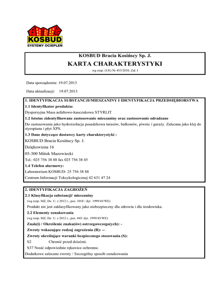 KOSBUD Bracia Kosińscy Sp. J. KARTA CHARAKTERYSTYKI wg rozp. (UE) Nr 453/2010, Zał. I Data sporządzenia: 19.07.2013 Data aktualizacji: 19.07.2013 1. IDENTYFIKACJA SUBSTANCJI/MIESZANINY I IDENTYFIKACJA PRZEDSIĘBIORSTWA 1.1 Identyfikator produktu: Dyspersyjna Masa asfaltowo-kauczukowa STYRLIT 1.2 Istotne zidentyfikowane zastosowanie mieszaniny oraz zastosowanie odradzane Do zastosowania jako hydroizolacja posadzkowa tarasów, balkonów, piwnic i garaży. Zalecana jako klej do styropianu i płyt XPS. 1.3 Dane dotyczące dostawcy karty charakterystyki : KOSBUD Bracia Kosińscy Sp. J. Dziękowizna 16 05-300 Mińsk Mazowiecki Tel.: 025 756 38 88 fax 025 756 38 45 1.4 Telefon alarmowy: Laboratorium KOSBUD: 25 756 38 88 Centrum Informacji Toksykologicznej 42 631 47 24 2. IDENTYFIKACJA ZAGROŻEŃ 2.1 Klasyfikacja substancji/ mieszaniny (wg rozp. MZ, Dz. U. z 2012 r., poz. 1018 / dyr. 1999/45/WE) Produkt nie jest zaklasyfikowany jako niebezpieczny dla zdrowia i dla środowiska. 2.2 Elementy oznakowania (wg rozp. MZ, Dz. U. z 2012 r., poz. 445/ dyr. 1999/45/WE) Znak(i) / Określenie znaku(ów) ostrzegawczego(ych): Zwroty wskazujące rodzaj zagrożenia (R): -Zwroty określające warunki bezpiecznego stosowania (S): S2 Chronić przed dziećmi. S37 Nosić odpowiednie rękawice ochronne. Dodatkowe zalecane zwroty / Szczególny sposób oznakowania Brak Inne zagrożenia, które nie powodują zaklasyfikowania U osób wrażliwych w następstwie bezpośredniego długotrwałego lub częstego kontaktu produkt może wywoływać zmiany skórne. Produkt nie zawiera składników spełniających kryteria dla substancji klasyfikowanych jako PBT lub vPvB zgodnie z załącznikiem XIII do rozporządzenia REACH. 3. SKŁAD/INFORMACJA O SKŁADNIKACH 3.1 Substancja Nie dotyczy. Produkt jest mieszaniną. 3.2 Mieszanina Charakterystyka chemiczna Mieszanina asfaltów, dyspersji kauczuków, wypełniaczy mineralnych, włókien naturalnych, zagęstników, dodatków, wody. Składniki niebezpieczne Nazwa składnika Mieszanina (3:1) 5-Chloro-2metylo-2H-izotiazol-3-onu [WE 247-500-7] i 2-Metylo-2Hizotiazol-3onu [WE 220-239-6] Numery identyfikujące składnik CAS: 55965-84-9 WE: brak Indeksowy: 613167-00-5 Rejestracji: Niedostępny Klasyfikacja 1/ wg rozp. MZ2/ (dyr. 67/548/EWG)/WE 1272/2008 T, R23/24/25 C, R34 --, R43 N, R50-53 Acute Tox. 3, H301 Acute Tox. 3, H311 Zawartość w mieszaninie < 0,001 %(m/m) Acute Tox. 2, H330 Skin Corr. 1B, H314 Skin Sens. 1, H317 Aquatic Acute 1, H400 Aquatic Chronic 1, H410 1,2-Benzoizotiazol-3(2H)-on CAS: 2634-33-5 WE: 220-120-9 Indeksowy: 613088-00-6 Rejestracji: Niedostępny Xn, R22 Xi, R38, R41 --, R43 N, R50 Acute Tox. 4, H302 Skin Irrit. 2, H315 < 0,05 % (m/m) Eye Dam. 1, H318 Skin Sens. 1, H317 Aquatic Acute 1, H400 Imidazo[4,5-d]imidazol2,5(1h,3h)-dion, tetrahydro1,3,4,6-tetrakis(hydroksymetylo) CAS: 5395-50-6 WE: 226-408-0 Rejestracji: Niedostępny --, R43 Skin Sens. 1, H317 < 0,1 % (m/m) CAS: 1332-58-7 WE: 310-194-1 Rejestracji: Zwolniony zgodnie z aneksem V.7 Niezaklasyfikowany STOT RE 2, H373 10-30 % (m/m) -1,2-benzoizotiazol-3(2H)-on Kaolin 1/ Znaczenie symboli, skrótów oraz zwrotów R i H - patrz pkt.16. 2/ Dz. U. z 2012 r. poz. 1018 Składniki, dla których określono wspólnotowe najwyższe dopuszczalne stężenia w środowisku pracy (niewyszczególnione wyżej) Brak. Składniki, dla których określono krajowe najwyższe dopuszczalne stężenia w środowisku pracy, jeśli dostępne – patrz pkt. 8. Substancje PBT lub vPvB Brak. 4. PIERWSZA POMOC 4.1 Opis środków pierwszej pomocy Wskazówki ogólne Skonsultować się z lekarzem, w przypadku silnych objawów lub objawów utrzymujących lub nasilających się po udzieleniu pomocy zgodnie z poniższymi wskazówkami. Pokazać kartę charakterystyki lub etykietę/opakowanie lekarzowi udzielającemu pomocy. Wdychanie Opuścić miejsce narażenia, wyjść na świeże powietrze. Droga narażenia mało prawdopodobna. Nie zachodzi potrzeba udzielania pomocy. Kontakt ze skórą Zdjąć zanieczyszczoną odzież. Zanieczyszczoną skórę umyć wodą z mydłem, a następnie dokładnie spłukać dużą ilością wody. W przypadku wystąpienia niepokojących objawów skonsultować się z lekarzem. UWAGA: Zanieczyszczoną odzież uprać przed ponownym użyciem. Kontakt z oczami: Zanieczyszczone oczy natychmiast płukać ciągłym strumieniem wody, usunąć szkła kontaktowe (jeśli są) i kontynuować płukanie przez ok. 10 minut. Podczas płukania trzymać powieki szeroko rozwarte i poruszać gałką oczną. W przypadku utrzymywania się dolegliwości zapewnić pomoc lekarską. UWAGA: Nie stosować zbyt silnego strumienia wody, aby nie uszkodzić rogówki. Spożycie: Dokładnie wypłukać usta wodą (bez połykania). Zapewnić pomoc lekarską. Zalecane środki ochrony dla udzielających pomocy Brak szczególnych zaleceń. 4.2 Najważniejsze ostre i opóźnione objawy oraz skutki narażenia Wdychanie W normalnych warunkach stosowania negatywne skutki dla zdrowia w wyniku narażenia inhalacyjnego są mało prawdopodobne – produkt nie zawiera szkodliwych składników lotnych. Kontakt z oczami Zanieczyszczenie oka może spowodować dyskomfort, zaczerwienienie, łzawienie, podrażnienie. Kontakt ze skórą U osób wrażliwych w następstwie długotrwałego lub częstego bezpośredniego kontaktu produkt może wywoływać zmiany skórne. Połknięcie Przypadkowe połknięcie może spowodować zaburzenia żołądkowe – bóle brzucha, nudności, wymioty. 4.3 Wskazania dotyczące wszelkiej natychmiastowej pomocy lekarskiej i szczególnego postępowania Informacje dla lekarza – Leczenie objawowe Nasilające się stany chorobowe - Osoby wrażliwe, ze dolegliwościami skórnymi powinny zachować ostrożność przy pracy z tym produktem. 5. POSTĘPOWANIE W PRZYPADKU POŻARU Szczególne zagrożenia związane z substancją lub mieszaniną Produkt niepalny. W środowisku pożaru powstają dymy zawierające tlenki węgla, destrukty asfaltu i kauczuku 