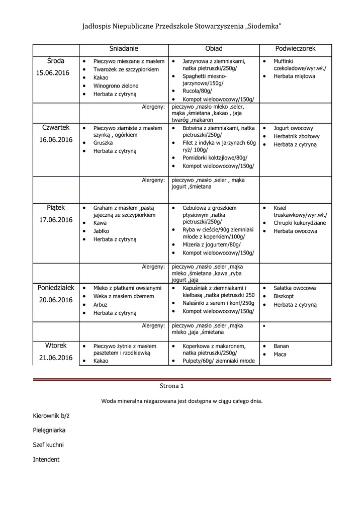 Jadłospis Niepubliczne Przedszkole Stowarzyszenia „Siodemka” Śniadanie Środa 15.06.2016 Obiad Pieczywo mieszane z masłem Twarożek ze szczypiorkiem Kakao Winogrono zielone Herbata z cytryną Alergeny: Czwartek 16.06.2016 Pieczywo ziarniste z masłem szynką , ogórkiem Gruszka Herbata z cytryną Alergeny: Piątek 17.06.2016 20.06.2016 Mleko z płatkami owsianymi Weka z masłem dżemem Arbuz Herbata z cytryną 21.06.2016 Pieczywo żytnie z masłem pasztetem i rzodkiewką Kakao Cebulowa z groszkiem ptysiowym ,natka pietruszki/250g/ Ryba w cieście/90g ziemniaki młode z koperkiem/100g/ Mizeria z jogurtem/80g/ Kompot wieloowocowy/150g/ pieczywo ,masło ,seler ,mąka mleko ,śmietana ,kawa ,ryba jogurt ,jaja Kapuśniak z ziemniakami i kiełbasą ,natka pietruszki 250 Naleśniki z serem i konf/250g Kompot wieloowocowy/150g/ Szef kuchni Intendent Jogurt owocowy Herbatnik zbożowy Herbata z cytryną Kisiel truskawkowy/wyr.wł./ Chrupki kukurydziane Herbata owocowa Sałatka owocowa Biszkopt Herbata z cytryną Koperkowa z makaronem, natka pietruszki/250g/ Pulpety/60g/ ziemniaki młode Woda mineralna niegazowana jest dostępna w ciągu całego dnia. Pielęgniarka Muffinki czekoladowe/wyr.wł./ Herbata miętowa pieczywo ,masło ,seler ,mąka mleko ,jaja ,śmietana Strona 1 Kierownik b/ż pieczywo ,masło ,seler , mąka jogurt ,śmietana Alergeny: Wtorek Jarzynowa z ziemniakami, natka pietruszki/250g/ Spaghetti miesnojarzynowe/150g/ Rucola/80g/ Kompot wieloowocowy/150g/ pieczywo ,masło mleko ,seler, mąka ,śmietana ,kakao , jaja twaróg ,makaron Botwina z ziemniakami, natka pietruszki/250g/ Filet z indyka w jarzynach 60g ryż/ 100g/ Pomidorki koktajlowe/80g/ Kompot wieloowocowy/150g/ Graham z masłem ,pastą jajeczną ze szczypiorkiem Kawa Jabłko Herbata z cytryną Alergeny: Poniedziałek Podwieczorek Banan Maca Jadłospis Niepubliczne Przedszkole Stowarzyszenia „Siodemka” Herbata z cytryną Alergeny: Środa 22.06.2016 Pieczywo mieszane z masłem Pastą twarogowo-rybną Marchewka Herbata z cytryną Alergeny: Czwartek 23.06.2016 Pieczywo ziarniste z masłem kiełbasą szynkową i pomidorem Winogrono czerwone Herbata z cytryną Alergeny: Piątek 24.06.2016 Mleko z grysikiem Pieczywo mieszane z masłem miodem Brzoskwinia Herbata z cytryną Alergeny: Poniedziałek 27.06.2016 Mleko z płatkami kukurydzianymi Graham z masłem i powidłem Herbata z cytryną z koperkiem/100g/ Sałata z ogór.kisz. z ceb i pomidorem/80g/ Kompot wieloowocowy/150g/ Szparagowa z muszelkami, natka pietruszki/250g Pyzy z masłem i cebulą/100g/ Kompot wieloowocowy/150g/ Szef kuchni Intendent Budyń z sorbetem owocowym/wyr.wł./ Wafel ryżowy Herbata owocowa pieczywo ,masło , seler, mąka jaja ,mleko , śmietana, twaróg ryba Rosół z makaronem , natka pietruszki/250g/ Udziec gotowany/90g ziemniaki młode/100g/ Sałata zielona z jogurtem/ 80 Kompot wieloowocowy/150g/ Koktajl truskawkowy/wyr.wł./ Herbatnik Herbata miętowa Bułeczka z kruszonką Soczek owocowy Herbata owocowa Deser gruszkowojabłkowy/wyr.wł./ Rurka waflowa Herbata z cytryną pieczywo ,masło ,seler ,mąka jogurt Pomidorowa z ryżem ,natka pietruszki/250g/ Ryba panierowana/90g/ ziemniaki młode/100g Ćwikła/80g/ Kompot wieloowocowy/150g/ pieczywo , masło ,mleko , seler ,mąka ,ryba ,jajka ,śmietana Ziemniaczana z kiełbasą natka pietruszki/250g/ Racuchy drożdżowe/250g/ Kompot wieloowocowy/150g/ Woda mineralna niegazowana jest dostępna w ciągu całego dnia. Pielęgniarka Herbata miętowa pieczywo ,masło ,mleko ,seler mąka ,śmietana , jaja Strona 2 Kierownik b/ż Jadłospis Niepubliczne Przedszkole Stowarzyszenia „Siodemka” Alergeny: Wtorek 28.06.2016 pieczywo ,masło ,jaja seler , mleko ,mąka ,śmietana Pieczywo żytnie z masłem sałatka rybna z warzywami Kawa Jabłko Herbata z cytryną Alergeny: Kalafiorowa z makaronem natka pietruszki/250g/ Gulasz /100g / kluski śląskie/100g/ Sur. z kap.kiszonej/80g/ Kompot wieloowocowy/150g/ pieczywo ,masło , seler ,śmietana mąka ,ryba ,mleko Strona 3 Woda mineralna niegazowana jest dostępna w ciągu całego dnia. Kierownik b/ż Pielęgniarka Szef kuchni Intendent Andrut z galaretką/wyr.wł Herbata miętowa