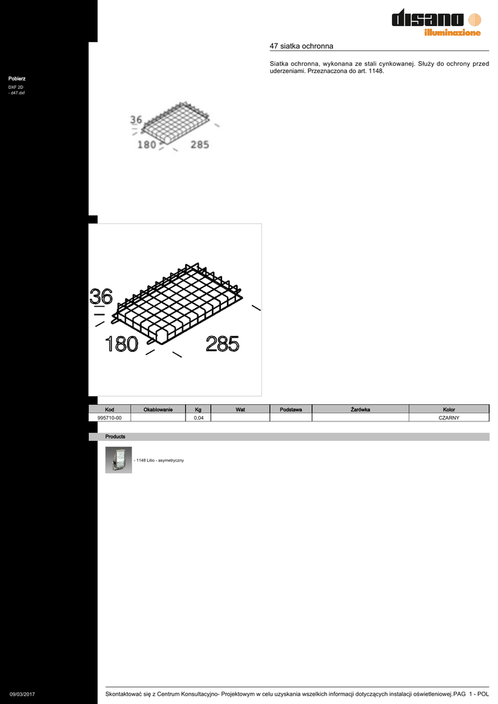 47 siatka ochronna Siatka ochronna, wykonana ze stali cynkowanej. Służy do ochrony przed uderzeniami. Przeznaczona do art. 1148. Pobierz DXF 2D - d47.dxf Kod Okablowanie 995710-00 Kg 0,04 Wat Podstawa Źarówka Kolor CZARNY Products - 1148 Litio - asymetryczny 09/03/2017 Skontaktować się z Centrum Konsultacyjno- Projektowym w celu uzyskania wszelkich informacji dotyczących instalacji oświetleniowej. PAG 1 - POL