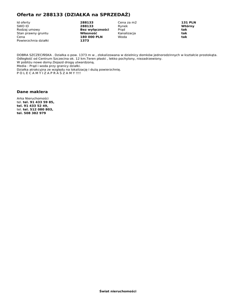 Oferta nr 288133 (DZIAŁKA na SPRZEDAŻ) Id oferty SWO ID Rodzaj umowy Stan prawny gruntu Cena Powierzchnia działki 288133 288133 Bez wyłączności Własność 180 000 PLN 1373 Cena za m2 Rynek Prąd Kanalizacja Woda 131 PLN Wtórny tak tak tak DOBRA SZCZECIŃSKA . Działka o pow. 1373 m w , zlokalizowana w dzielnicy domków jednorodzinnych w kształcie prostokąta. Odległość od Centrum Szczecina ok. 12 km.Teren płaski , lekko pochylony, niezadrzewiony. W pobliżu nowe domy.Dojazd drogą utwardzoną. Media : Prąd i woda przy granicy działki. Działka atrakcyjna ze względu na lokalizację i dużą powierzchnię. P O L E C A M Y I Z A P R A S Z A M Y !!!! Dane maklera Arka Nieruchomości tel. tel. 91 433 59 85, tel. 91 433 52 49, tel. tel. 512 080 803, tel. 508 382 979 Świat nieruchomości Powered by TCPDF (www.tcpdf.org)