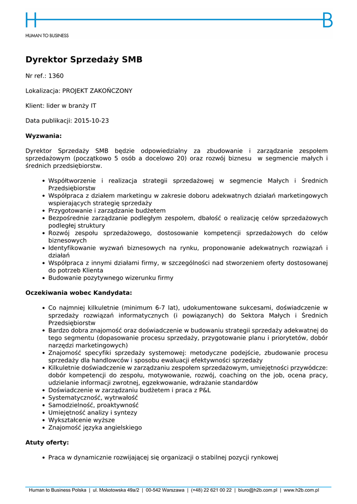 Dyrektor Sprzedaży SMB Nr ref.: 1360 Lokalizacja: PROJEKT ZAKOŃCZONY Klient: lider w branży IT Data publikacji: 2015-10-23 Wyzwania: Dyrektor Sprzedaży SMB będzie odpowiedzialny za zbudowanie i zarządzanie zespołem sprzedażowym (początkowo 5 osób a docelowo 20) oraz rozwój biznesu w segmencie małych i średnich przedsiębiorstw. Współtworzenie i realizacja strategii sprzedażowej w segmencie Małych i Średnich Przedsiębiorstw Współpraca z działem marketingu w zakresie doboru adekwatnych działań marketingowych wspierających strategię sprzedaży Przygotowanie i zarządzanie budżetem Bezpośrednie zarządzanie podległym zespołem, dbałość o realizację celów sprzedażowych podległej struktury Rozwój zespołu sprzedażowego, dostosowanie kompetencji sprzedażowych do celów biznesowych Identyfikowanie wyzwań biznesowych na rynku, proponowanie adekwatnych rozwiązań i działań Współpraca z innymi działami firmy, w szczególności nad stworzeniem oferty dostosowanej do potrzeb Klienta Budowanie pozytywnego wizerunku firmy Oczekiwania wobec Kandydata: Co najmniej kilkuletnie (minimum 6-7 lat), udokumentowane sukcesami, doświadczenie w sprzedaży rozwiązań informatycznych (i powiązanych) do Sektora Małych i Średnich Przedsiębiorstw Bardzo dobra znajomość oraz doświadczenie w budowaniu strategii sprzedaży adekwatnej do tego segmentu (dopasowanie procesu sprzedaży, przygotowanie planu i priorytetów, dobór narzędzi marketingowych) Znajomość specyfiki sprzedaży systemowej: metodyczne podejście, zbudowanie procesu sprzedaży dla handlowców i sposobu ewaluacji efektywności sprzedaży Kilkuletnie doświadczenie w zarządzaniu zespołem sprzedażowym, umiejętności przywódcze: dobór kompetencji do zespołu, motywowanie, rozwój, coaching on the job, ocena pracy, udzielanie informacji zwrotnej, egzekwowanie, wdrażanie standardów Doświadczenie w zarządzaniu budżetem i praca z P&L Systematyczność, wytrwałość Samodzielność, proaktywność Umiejętność analizy i syntezy Wykształcenie wyższe Znajomość języka angielskiego Atuty oferty: Praca w dynamicznie rozwijającej się organizacji o stabilnej pozycji rynkowej Human to Business Polska | ul. Mokotowska 49a/2 | 00-542 Warszawa | (+48) 22 621 00 22 | [email protected] | www.h2b.com.pl Możliwość projektowania rozwiązań sprzedażowych oraz i ich wdrażanie Możliwość rozwoju zawodowego w organizacji posiadającej uznaną markę w segmencie IT Osoby zainteresowane prosimy o przesyłanie aplikacji na adres: [email protected] Prosimy o wysłanie aplikacji CV z „Nr Ref. 1360” i dopisanie następującej klauzuli: "Wyrażam zgodę na przetwarzanie moich danych osobowych zawartych w mojej ofercie pracy dla potrzeb niezbędnych do realizacji procesu rekrutacji zgodnie z ustawą z dnia 29 sierpnia 1997 r. o ochronie danych osobowych (Dz. U. z 2002 r. Nr 101, poz. 926, ze zm.)" Gwarantujemy całkowitą poufność. Jeżeli okaże się, że nie jest to wyzwanie zbieżne z Pana/Pani motywacją i kierunkiem rozwoju, prosimy o przekazanie zaproszenia do projektu osobom, które mogłyby być zainteresowane. Human to Business Polska | ul. Mokotowska 49a/2 | 00-542 Warszawa | (+48) 22 621 00 22 | [email protected] | www.h2b.com.pl Powered by TCPDF (www.tcpdf.org)