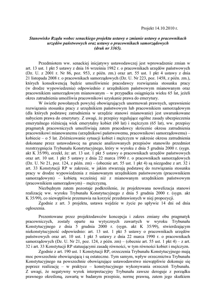 Projekt 14.10.2010 r. Stanowisko Rządu wobec senackiego projektu ustawy o zmianie ustawy o pracownikach urzędów państwowych oraz ustawy o pracownikach samorządowych (druk nr 3365). Przedmiotem ww. senackiej inicjatywy ustawodawczej jest wprowadzenie zmian w art. 13 ust. 1 pkt 5 ustawy z dnia 16 września 1982 r. o pracownikach urzędów państwowych (Dz. U. z 2001 r. Nr 86, poz. 953, z późn. zm.) oraz art. 55 ust. 1 pkt 4 ustawy z dnia 21 listopada 2008 r. o pracownikach samorządowych (Dz. U. Nr 223, poz. 1458, z późn. zm.), których konsekwencją będzie umożliwienie pracodawcy rozwiązania stosunku pracy (w drodze wypowiedzenia) odpowiednio z urzędnikiem państwowym mianowanym oraz pracownikiem samorządowym mianowanym – w przypadku osiągnięcia wieku 65 lat, jeżeli okres zatrudnienia umożliwia pracownikowi uzyskanie prawa do emerytury. W świetle powołanych powyżej obowiązujących unormowań prawnych, uprawnienie rozwiązania stosunku pracy z urzędnikiem państwowym lub pracownikiem samorządowym (dla których podstawę zatrudnienia w urzędzie stanowi mianowanie) jest uwarunkowane nabyciem prawa do emerytury. Z uwagi, że przepisy regulujące ogólne zasady ubezpieczenia emerytalnego różnicują wiek emerytalny kobiet (60 lat) i mężczyzn (65 lat), ww. przepisy pragmatyk pracowniczych umożliwiają zatem pracodawcy skrócenie okresu zatrudnienia pracownikowi mianowanemu (urzędnikowi państwowemu, pracownikowi samorządowemu) – kobiecie – o 5 lat. Zróżnicowanie sytuacji kobiet i mężczyzn w zakresie okresu zatrudnienia dokonane przez ustawodawcę na gruncie analizowanych przepisów stanowiło przedmiot rozstrzygnięcia Trybunału Konstytucyjnego, który w wyroku z dnia 5 grudnia 2000 r. (sygn. akt K 35/99), orzekł, że: art. 13 ust. 1 pkt 5 ustawy o pracownikach urzędów państwowych oraz art. 10 ust. 1 pkt 5 ustawy z dnia 22 marca 1990 r. o pracownikach samorządowych (Dz. U. Nr 21, poz. 124, z późn. zm) – (obecnie art. 55 ust. 1 pkt 4) są niezgodne z art. 32 i art. 33 Konstytucji RP w zakresie, w jakim stwarzają podstawę do rozwiązania stosunku pracy w drodze wypowiedzenia z mianowanym urzędnikiem państwowym (pracownikiem samorządowym) – kobietą wcześniej niż z mianowanym urzędnikiem państwowym (pracownikiem samorządowym) – mężczyzną. Niezbędnym zatem pozostaje podkreślenie, że projektowana nowelizacja stanowi realizację ww. wyroku Trybunału Konstytucyjnego z dnia 5 grudnia 2000 r. (sygn. akt K 35/99), co niewątpliwie przemawia na korzyść przedstawionych w niej propozycji. Zgodnie z art. 3 projektu, ustawa wejdzie w życie po upływie 14 dni od dnia ogłoszenia. Prezentowane przez projektodawców koncepcja i zakres zmiany obu pragmatyk pracowniczych, zostały oparte na wytycznych zawartych w wyroku Trybunału Konstytucyjnego z dnia 5 grudnia 2000 r. (sygn. akt K 35/99), stwierdzającym niekonstytucyjność odpowiednio: art. 13 ust. 1 pkt 5 ustawy o pracownikach urzędów państwowych oraz art. 10 ust. 1 pkt 5 ustawy z dnia 22 marca 1990 r. o pracownikach samorządowych (Dz. U. Nr 21, poz. 124, z późn. zm) – (obecnie art. 55 ust. 1 pkt 4) – z art. 32 i art. 33 Konstytucji RP statuującymi zasadę równości, w tym równości kobiet i mężczyzn. Zgodnie z art. 190 ust. 1 Konstytucji RP, orzeczenia Trybunału Konstytucyjnego mają moc powszechnie obowiązującą i są ostateczne. Tym samym, wpływ orzecznictwa Trybunału Konstytucyjnego na powszechnie obowiązujące ustawodawstwo niewątpliwie dokonuje się poprzez realizację – w praktyce – konstytucyjnego wykonywania orzeczeń Trybunału. Z uwagi, że negatywny wyrok interpretacyjny Trybunału zawsze deroguje z porządku prawnego określoną, zawartą w badanym przepisie, normę prawną, zatem jego skutkiem winna być zmiana normatywna w określonej (wyrażonej wprost w sentencji wyroku) normie prawnej. Mając na względzie powyższe oraz sentencję wyroku Trybunału Konstytucyjnego z dnia 5 grudnia 2000 r. (sygn. akt K 35/99) wraz z uzasadnieniem (opublikowanym w OTK 2000/8/295) należy zauważyć, że przedłożony senacki projekt ustawy o zmianie ustawy o pracownikach urzędów państwowych oraz ustawy o pracownikach samorządowych (druk nr 3365) uwzględnia zasady konstytucyjne, którym zmieniane regulacje winny służyć oraz poprzez usunięcie niezgodności przepisów ustawowych z zasadą równego traktowania bez względu na płeć, wykonuje treść sentencji ww. wyroku Trybunału Konstytucyjnego. Niemniej jednak, analizując przedłożone rozwiązania należy zwrócić uwagę również na inny aspekt zasady równego traktowania, mianowicie: równe traktowanie bez względu na wiek. Jest to istotne, bowiem na gruncie projektowanych rozwiązań zamiast dotychczasowych przesłanek: ,,nabycia prawa do emerytury na podstawie przepisów dotyczących ogółu pracowników” (vide art. 13 ust. 1 pkt 5 ustawy o pracownikach urzędów państwowych) oraz ,,nabycia prawa do emerytury lub renty z tytułu niezdolności do pracy” (vide art. 55 ust. 1 pkt 4 ustawy o pracownikach samorządowych) zostało sformułowane ogólne kryterium ,,osiągnięcia wieku 65 lat, jeżeli okres zatrudnienia umożliwia uzyskanie prawa do emerytury (albo nabycia prawa do renty z tytułu niezdolności do pracy)” umożliwiające rozwiązanie stosunku pracy w drodze wypowiedzenia. W konsekwencji zatem, została zmodyfikowana przesłanka umożliwiająca nierówne traktowanie urzędników ze względu na wiek – co może powodować wątpliwości odnośnie ewentualnej zgodności - zarówno obowiązujących obecnie jak i projektowanych regulacji - z dyrektywą Rady 2000/78/WE z dnia 27 listopada 2000 r. ustanawiającą ogólne warunki ramowe równego traktowania w zakresie zatrudnienia i pracy. Stosownie do postanowień art. 6 ust. 1 tejże, „Państwa Członkowskie mogą uznać, że odmienne traktowanie ze względu na wiek nie stanowi dyskryminacji, jeżeli w ramach prawa krajowego zostan