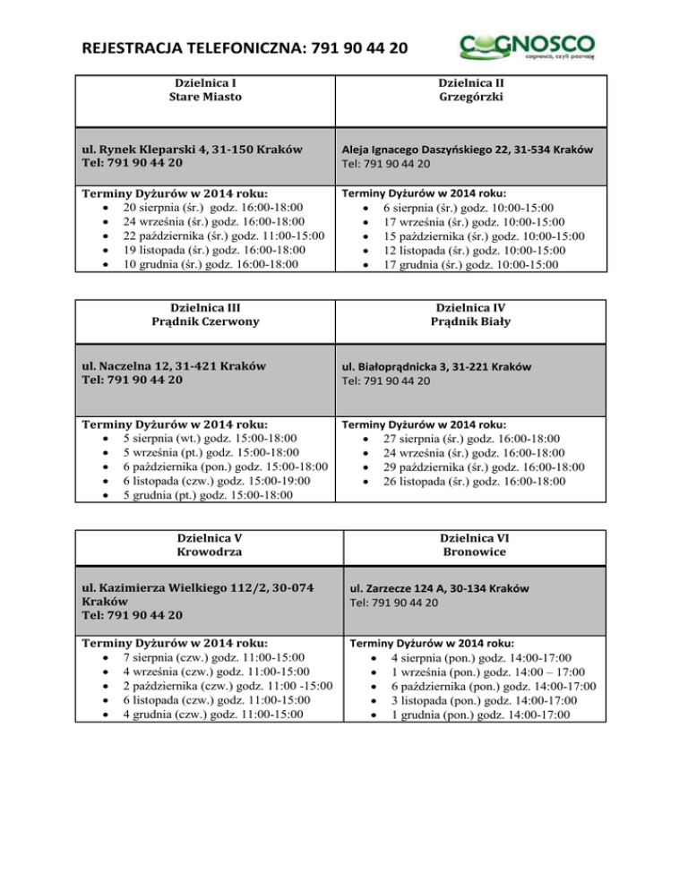 REJESTRACJA TELEFONICZNA: 791 90 44 20 Dzielnica I Stare Miasto Dzielnica II Grzegórzki ul. Rynek Kleparski 4, 31-150 Kraków Tel: 791 90 44 20 Aleja Ignacego Daszyńskiego 22, 31-534 Kraków Tel: 791 90 44 20 Terminy Dyżurów w 2014 roku: 20 sierpnia (śr.) godz. 16:00-18:00 24 września (śr.) godz. 16:00-18:00 22 października (śr.) godz. 11:00-15:00 19 listopada (śr.) godz. 16:00-18:00 10 grudnia (śr.) godz. 16:00-18:00 Terminy Dyżurów w 2014 roku: 6 sierpnia (śr.) godz. 10:00-15:00 17 września (śr.) godz. 10:00-15:00 15 października (śr.) godz. 10:00-15:00 12 listopada (śr.) godz. 10:00-15:00 17 grudnia (śr.) godz. 10:00-15:00 Dzielnica III Prądnik Czerwony Dzielnica IV Prądnik Biały ul. Naczelna 12, 31-421 Kraków Tel: 791 90 44 20 ul. Białoprądnicka 3, 31-221 Kraków Tel: 791 90 44 20 Terminy Dyżurów w 2014 roku: 5 sierpnia (wt.) godz. 15:00-18:00 5 września (pt.) godz. 15:00-18:00 6 października (pon.) godz. 15:00-18:00 6 listopada (czw.) godz. 15:00-19:00 5 grudnia (pt.) godz. 15:00-18:00 Terminy Dyżurów w 2014 roku: 27 sierpnia (śr.) godz. 16:00-18:00 24 września (śr.) godz. 16:00-18:00 29 października (śr.) godz. 16:00-18:00 26 listopada (śr.) godz. 16:00-18:00 Dzielnica V Krowodrza Dzielnica VI Bronowice ul. Kazimierza Wielkiego 112/2, 30-074 Kraków Tel: 791 90 44 20 ul. Zarzecze 124 A, 30-134 Kraków Tel: 791 90 44 20 Terminy Dyżurów w 2014 roku: 7 sierpnia (czw.) godz. 11:00-15:00 4 września (czw.) godz. 11:00-15:00 2 października (czw.) godz. 11:00 -15:00 6 listopada (czw.) godz. 11:00-15:00 4 grudnia (czw.) godz. 11:00-15:00 Terminy Dyżurów w 2014 roku: 4 sierpnia (pon.) godz. 14:00-17:00 1 września (pon.) godz. 14:00 – 17:00 6 października (pon.) godz. 14:00-17:00 3 listopada (pon.) godz. 14:00-17:00 1 grudnia (pon.) godz. 14:00-17:00 REJESTRACJA TELEFONICZNA: 791 90 44 20 Dzielnica VII Zwierzyniec Dzielnica VIII Dębniki ul. Bolesława Prusa 18, 30-117 Kraków Tel: 791 90 44 20 ul. Praska 52, 30-322 Kraków Tel: 791 90 44 20 Terminy Dyżurów w 2014 roku: 13 sierpnia (śr.) 11:00-15:00 10 września (śr.) 11:00-15:00 8 października (śr.) godz. 11:00-15:00 19 listopada (śr.) godz. 11:00-15:00 10 grudnia (śr.) godz. 11:00-15:00 Terminy Dyżurów w 2014 roku: 26 sierpnia (wt.) godz. 15:00-18:00 23 września (wt.) godz. 15:00-18:00 21 października (wt.) godz. 15:00-18:00 25 listopada (wt.) godz. 15:00-18:00 Dzielnica IX Łagiewniki – Borek Fałęcki ul. Żywiecka 13, 30-427 Kraków Tel: 791 90 44 20 Terminy Dyżurów w 2014 roku: 5 września (wt.) 13:00 – 14:00 3 października (pt.) 13:00 – 14:00 7 listopada (pt.) 13:00 – 14:00 Dzielnica XI Podgórze Duchackie Dzielnica XII Bieżanów- Prokocim ul. Marii I Bolesława Wysłouchów 34, 30611 Kraków Tel: 791 90 44 20 ul. Jana Kurczaba 3, 30-868 Kraków Tel: 791 90 44 20 Terminy Dyżurów w 2014 roku: 21 sierpnia (czw.) godz. 12:00-15:30 25 września (czw.) godz. 18:00-20:00 23 października (czw.) godz. 18:00-20:00 20 listopada (czw.) godz. 16:00-18:30 Terminy Dyżurów w 2014 roku: 12 sierpnia (wt.) godz. 16:00-18:30 9 września (wt.) godz. 16:00-18:30 7 października (wt.) godz. 16:00-18:30 4 listopada (wt.) godz. 16:00-18:30 REJESTRACJA TELEFONICZNA: 791 90 44 20 Dzielnica XIV Czyżyny Dzielnica XV Mistrzejowice Osiedle Dywizjonu 303 34, 31-874 Kraków Tel: 791 90 44 20 ul. Miśnieńska 58, 31-612 Kraków Tel: 791 90 44 20 Terminy Dyżurów w 2014 roku: 11 sierpnia (pon.) godz. 17:00-19:00 8 września (pon.) godz. 17:00-19:00 13 października (pon.) godz. 17:00-19:00 3 listopada (pon.) godz. 17:00-19:00 Terminy Dyżurów w 2014 roku: 15 września (pon.) godz. 16:00-19:00 20 października (pon.) godz. 16:00-19:00 17 listopada (pon.) godz. 16:00-19:00 Nowa Huta - MOWIS Miejski Ośrodek Wspierania Inicjatyw Społecznych Podgórze Dom Kultury Podgórze Osiedle Centrum C 10 Tel: 791 90 44 20 ul. Sokolska 13 Tel: 791 90 44 20 Terminy Dyżurów w 2014 roku: 5 listopada (środa) godz. 17:00-19:00 19 listopada (środa) godz. 17:00-19:00 3 grudnia (środa) godz. 17:00-19:00 17 grudnia (środa) godz. 17:00-19:00 Terminy Dyżurów w 2014 roku: 13 listopada (czw.) godz. 17:00-19:00 11 grudnia (czw.) godz. 17:00-19:00