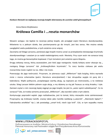 Konkurs literacki na najlepszą recenzję książki skierowany do uczniów szkół gimnazjalnych Anna Maria Wojtkiewicz Królowa Camilla i …reszta monarchów Słowem wstępu: nie będzie to recenzja jednej książki, ale przegląd części literatury skandynawskiej. Mówienie tu o jednym dziele, bez porównywania go do innych, jest bez sensu. Nie można wtedy uwzględnić wielu podobieństw, a tych ostatnio coraz więcej. Zacznijmy od Stiega Larssona, ponieważ jego książki można uznać za protoplastów dzisiejszego kryminału skandynawskiego i uważam je za nadal niedościgniony wzór. Niestety. Przy czym wzór nie oznacza tutaj tego, że można go bezwstydnie kopiować. Z tym tematem jest ostatnio sporo kłopotu. Drugą ciekawą rzeczą, którą zauważyłam, jest ilość jego następców. Każdy kolejny autor okazuje się „ następcą Stiega Larssona” lub „królową/królem kryminału”. To rzecz bardzo ciekawa jak wielu monarchów może rządzić na raz. Albo i nie może. Powracając do jego twórczości. Przyznam, że pierwsza część „Millenium” była książką, która wyrwała mnie z morza schematów (patrz: literatura amerykańska!) i bez skrupułów wyjęła mi parę dni z kalendarza. Wątki polityczne, przeplatające wartką akcję, są napisane po mistrzowsku, a to niełatwa sztuka. Stieg Larsson lekkim piórem szyje akcję, a my idziemy za nią jak Tezeusz za nicią Ariadny. I tyle. Zamiast czytać o nim recenzję lepiej sięgnąć po jego książki, bo jest to „autor opinii subiektywnej”. Co to oznacza? Tyle, że trzeba samemu przeczytać „Millenium”, aby wyrobić sobie o tym zdanie. Kontynuując poprzedni wątek- jego naśladowców, jest to temat, który niezwykle mnie zainteresował. Przyjrzyjmy się królowej Camilli, znanej także jako Camilla Läckberg („Latarnik”, „Niemiecki bękart”,” Fabrykantka aniołków” itp ). Jak powiadają „umarł król, niech żyje król”. Cóż, w tym wypadku mamy jednego faktycznie martwego króla - Stiega i królową biznesmenkę. Nikt chyba nie zaprzeczy faktowi, iż pani Läckberg potrafi zadbać o domowe fundusze. Produkuje książki jak mała manufaktura, ale ich jakość jest jak z second-handu. Lekko znoszona. Da się czytać, ale świeżością nie trąci. Widzimy jeden schemat, który powtarza się w każdej części. Ktoś ginie, rezolutna i wścibska bohaterka rozpoczyna dochodzenie i zaczyna mieć lepsze statystyki niż policja. Kim jest morderca? Osobą z traumatycznym dzieciństwem. Zawsze. I jest to niezmienne tak samo jak niezmiennie woda jest mokra. Czytając jedną jej książkę możemy być pewni, że znamy zakończenia pozostałych. Oczywiście królowa ma także parę zalet, bo zawsze znajdzie się jakieś światełko w tunelu. Tym światełkiem jest mianowicie wątek rodzinny, kontrastujący z tymi wszystkimi krwawymi morderstwami (zastanawiam się czy w tej nieszczęsnej Fjällbace jest jeszcze kogo zabijać) pokazujący domowe pielesze głównej bohaterki produkującej średnio jedno niemowlę na rok. Jest powszechnie znanym faktem, że to się w Szwecji opłaca. Fabuła tej sielanki nie jest specjalnie odkrywcza, ale wciąga. Camilla opisuje tam rzeczy znane nam z autopsji, dlatego wzbudzają one naszą sympatię i wciągają nas w książkę. Można to nazwać taką szwedzką „modą na sukces” podrasowaną krwią i mrocznymi tajemnicami. Po przeczytaniu wszystkich tych kryminałów miałabym pewne obawy co do wczasów w Skandynawii. Jak wiadomo żywym się stamtąd nie powraca. Zaskakujące jest jednak to, że pomimo naszych wyobrażeń i ostatniego spadku tolerancji dla imigrantów w Szwecji (od 2010 roku, kiedy to do parlamentu dostała się partia Szwedzkich Demokratów) kraje skandynawskie są nadal bardzo bezpieczne. Pomimo wcześniejszej krytyki pani Läckberg, muszę przyznać, że jest bardzo przewidująca i umie odczytać nastroje społeczne. W jednej ze swoich książek uprzedziła fakty i opisała zdarzenie bardzo podobne do tego, które rzeczywiście zdarzyło się po wydaniu książki. Z całą pewnością jest wiele kryminałów szwedzkich, norweskich czy duńskich, które da się przeczytać. Szkopuł w tym, co zapamiętamy i jakie dana powieść wywrze na nas wrażenie. Wydaje mi się, że w ostatnim czasie wszystko jest pisane na jedną modłę. Rolnik kupił traktor, na którym jeździ cała wieś. Kto jest poszkodowanym rolnikiem (dodam, że wieś za owe przewozy nie płaci)? Nietrudno się domyślić. Rozumiem, że jest to całkiem niegłupie ze strony ekonomicznej, ale na dłuższą metę traktor szybko się zepsuje. Tylko kiedy to nastąpi?