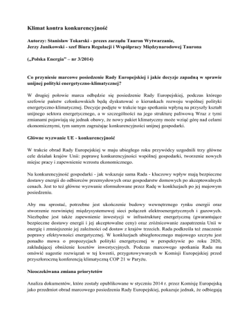 Klimat kontra konkurencyjność Autorzy: Stanisław Tokarski - prezes zarządu Tauron Wytwarzanie, Jerzy Janikowski - szef Biura Regulacji i Współpracy Międzynarodowej Taurona („Polska Energia” – nr 3/2014) Co przyniesie marcowe posiedzenie Rady Europejskiej i jakie decyzje zapadną w sprawie unijnej polityki energetyczno-klimatycznej? W drugiej połowie marca odbędzie się posiedzenie Rady Europejskiej, podczas którego szefowie państw członkowskich będą dyskutować o kierunkach rozwoju wspólnej polityki energetyczno-klimatycznej. Decyzje podjęte w trakcie tego spotkania wpłyną na przyszły kształt unijnego sektora energetycznego, a w szczególności na jego strukturę paliwową Wraz z tymi zmianami pojawiają się jednak obawy, że nowy pakiet klimatyczny może wziąć górę nad celami ekonomicznymi, tym samym zagrażając konkurencyjności unijnej gospodarki. Główne wyzwanie UE - konkurencyjność W trakcie obrad Rady Europejskiej w maju ubiegłego roku przywódcy uzgodnili trzy główne cele działań krajów Unii: poprawę konkurencyjności wspólnej gospodarki, tworzenie nowych miejsc pracy i zapewnienie wzrostu ekonomicznego. Na konkurencyjność gospodarki - jak wskazuje sama Rada - kluczowy wpływ mają bezpieczne dostawy energii do odbiorców przemysłowych oraz gospodarstw domowych po akceptowalnych cenach. Jest to też główne wyzwanie sformułowane przez Radę w konkluzjach po jej majowym posiedzeniu. Aby mu sprostać, potrzebne jest ukończenie budowy wewnętrznego rynku energii oraz stworzenie rozwiniętej międzysystemowej sieci połączeń elektroenergetycznych i gazowych. Niezbędne jest także zapewnienie inwestycji w infrastrukturę energetyczną (gwarantujące bezpieczne dostawy energii i jej akceptowalne ceny) oraz zróżnicowanie zaopatrzenia Unii w energię i zmniejszenie jej zależności od dostaw z krajów trzecich. Rada podkreśla też znaczenie poprawy efektywności energetycznej. W konkluzjach ubiegłorocznego majowego szczytu jest ponadto mowa o propozycjach polityki energetycznej w perspektywie po roku 2020, zakładającej obniżenie kosztów inwestycyjnych. Podczas marcowego spotkania Rada ma omówić sugestie rozwiązań w tej kwestii, przygotowywanych w Komisji Europejskiej przed przyszłoroczną konferencją klimatyczną COP 21 w Paryżu. Nieoczekiwana zmiana priorytetów Analiza dokumentów, które zostały opublikowane w styczniu 2014 r. przez Komisję Europejską jako przedmiot obrad marcowego posiedzenia Rady Europejskiej, pokazuje jednak, że odbiegają one znacząco od wyznaczonych w ubiegłym roku priorytetów. Komisja w propozycjach polityki energetyczno-klimatycznej do 2030 r. koncentruje się wyłącznie na wprowadzeniu antyrynkowych zmian w systemie Europejskiego Systemu Handlu Emisjami ETS oraz przyjęciu nowego celu - 40-proc. redukcji emisji dwutlenku węgla do roku 2030. Zmiany systemu ETS zostały tak sformułowane, że prowadzą do jego bezwzględnej realizacji nawet w przypadku, gdy nie zostanie on jednogłośnie zaakceptowany. Mają temu służyć: • bardziej rygorystyczne niż obowiązujące dotychczas roczne współczynniki redukcji ilości uprawnień przeznaczanych do sprzedaży na aukcjach (2,2 zamiast 1,74 proc.), • wprowadzenie mechanizmu stabilizującego rynek, będącego w istocie antyrynkowym narzędziem ręcznego sterowania przez Komisję poziomem cen uprawnień, • przyjęcie nowego sposobu zarządzania systemem ETS, polegającym na konieczności uzyskania przez kraje członkowskie od Komisji akceptacji szeregu przedkładanych przez nie propozycji działań. Dzięki temu to Komisja, a nie kraje członkowskie, będzie decydować o kierunkach rozwoju sektora energetycznego, wykorzystywanej strukturze paliwowej oraz – w konsekwencji – o cenach energii w krajach UE, co natychmiast przełoży się na konkurencyjność ich gospodarek i większe koszty dla gospodarstw domowych. Warto zauważyć, że Komisja nie odpowiada za zapewnienie bezpieczeństwa zasilania, zachowanie dobrej pozycji konkurencyjnej przemysłu unijnego czy też konsekwencje problemów społecznych związanych z niezwykle kosztownymi działaniami realizowanymi w ramach polityki klimatycznej. Te problemy pozostawia krajom członkowskim. Dokumenty Komisji dowodzą wyjątkowej troski o politykę klimatyczną, jednak świadczą też o lekceważeniu istotnego czynnika – cen energii elektrycznej, które są znacznie wyższe na terenie Unii niż u jej globalnych konkurentów. Niestety, nie skłania to Komisji do poszukiwania odpowiedzi na wyzwania postawione w zeszłym roku przez Radę. Zamiast tego mamy do czynienia z tymi samymi celami redukcji emisji, tyle że prezentowanymi pod inną nazwą oraz ujętymi w krótszej perspektywie. Ścieżką wytyczaną przez Unię nie podążają – wbrew zapowiedziom jej wysokich przedstawicieli – żadne inne liczące się na świecie gospodarki, co przy nakładaniu kolejnych emisyjnych obostrzeń, stawia unijny przemysł z góry na przegranej pozycji. Czy tego oczekiwała od Komisji Rada w swoich konkluzjach z maja ubiegłego roku? Brukselscy urzędnicy tracą z oczu tak fundamentalne kwestie, jak zachowanie konkurencyjności, zapewnienie akceptowalnych cen energii, bezpieczeństwa energetycznego, klimatu sprzyjającego inwestycjom w nową infrastrukturę, gwarantującą pewność pracy systemów energetycznych, a także poprawę efektywności energetycznej. Decyzje w rękach KE? Nadchodzące marcowe posiedzenie Rady Europejskiej będzie miało ogromne znaczenie także z innego powodu. Otóż propozycje Komisji ingerują znacząco w sprawy wyboru struktury paliwowej przez kraje członkowskie, a przecież w myśl art. 192 i art. 194 Traktatu o Funkcjonowaniu Unii Europejskiej są to działania zastrzeżone jedynie dla państw wspólnoty. Jeśli jednak wszystkie kraje jednomyślnie przyjmą te zmiany, to oddadzą one swoją decyzyjność w tym zakresie i kolejna ich zgoda, choćby na dalszą inge