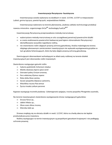 Inwentaryzacja florystyczno- faunistyczna Inwentaryzacja została wykonana na działkach nr ewid. 117/44, 117/47 w miejscowości Lubień, gmina Łęczyca, powiat łęczycki, województwo łódzkie. Inwentaryzacja wykonano na terenie planowanej „budowy zakładu technicznego produkcji nawozu mineralno- organicznego OrCal® technologią FuelCal®” Inwentaryzację florystyczną przeprowadzono metodą marszrutową: • • • wykorzystano metodę marszrutową w celu szczegółowej penetracji powierzchni działki w czasie analizowania powierzchni badawczej pod kątem różnorodności florystycznej i identyfikowano wszystkie napotkane rośliny, nie stwierdzono roślin objętych prawną ochroną gatunkową. Analiza mykologiczna terenu objętego planowanym zamierzeniem inwestycyjnym nie wykazała występowania grzybów w tym grzybów lichenizujących, które by były objęte prawną ochroną gatunkową. Dominującymi zbiorowiskami wchodzącymi w skład szaty roślinnej na terenie działek inwestycyjnych jest zbiorowisko roślin trawiastych. Stwierdzono następujące gatunki roślin: • Cykoria podróżnik Cichorium intybus • Miotła zbożowa Apera spica-venti • Ostrożeń polny Cirsium arvense, • Perz właściwy Elymus repens • Róża dzika Rosa canina, • Szczeć pospolita Dipsacus sylvestris, • Wiechlina roczna Poa annua • Życica trwała Loilium perenne Kępowo występuję trzcinnik piaskowy Calamagrostis epigejos, trzcina pospolita Phragmites australis, Na terenie inwestycyjnym stwierdzono występowanie drzew następujących gatunków: • Grusza Pyrus sp., • Jabłoń Malus sp., • Olsza szara Alnus incana, • Wierzba Salix sp. Drzewa znajdują się na obrzeżu działki nr ewid. 117/47, która na chwilę obecna nie będzie przekształcana prze inwestora. Rośliny występujące na ternie inwestycyjnym są pospolitymi gatunkami krajowymi i nie podlegają ochronie prawnej. Podczas inwentaryzacji stwierdzono występowanie następujących gatunków zwierząt: • Bażant Phasianus colchicus, • Błotniak stawowy Circus aeruginosus, • Bogatka Parus major, • Gawron Corvus frugilegus, • Myszołów Buteo buteo, • Pliszka siwa Motacilla alba, • Rudzik Erithacus rubecula, • Sarna Capreolus capreolus, • Skowronek Alauda arvensis, • Szpak Sturnus vulgaris, • Wróbel Passer domesticus, • Mazurek Passer montanus • Zając Lepus europaeus. Wszystkie wymienione gatunki to gatunki powszechnie występujące i należą do pospolitych w Polsce. Ze względu na charakter inwestycji i na jej ograniczony zasięg negatywne oddziaływanie na faunę nie występuje. Podstawa prawna: • Rozporządzenie Ministra Środowiska z dnia 13 kwietnia 2010 r w sprawie siedlisk przyrodniczych oraz gatunków będących przedmiotem zainteresowania Wspólnoty, a także kryteriów wyboru obszarów kwalifikujących się do uznania lub wyznaczenia jako obszary Natura 2000 (Dz. U. z dnia 10 maja 2010 r.), • Dyrektywa Rady 92/43/EWG z dnia 21 maja 1992 roku w sprawie ochrony siedlisk przyrodniczych oraz dzikiej fauny i flory, Dyrektywa siedliskowa, • Dyrektywa Parlamentu Europejskiego i Rady 2009/147/WE z dnia 30 listopada 2009 r. w sprawie ochrony dzikiego ptactwa , • Rozporządzenie Ministra Środowiska z dnia 5 stycznia 2012 r. w sprawie ochrony gatunkowej roślin (Dz. U. 2012, poz. 81)., • Rozporządzenie Ministra Środowiska z dnia 12 października 2011 r. w sprawie ochrony gatunkowej zwierząt (Dz. U. 2011 Nr 237, poz 1419), • Ustawa z dnia 3 października 2008 r. o udostępnianiu informacji o środowisku i jego ochronie, udziale społeczeństwa w ochronie środowiska oraz o ocenach oddziaływania na środowisko (Dz. U. z 2008 r. Nr 199, poz. 1227 z późn. zm.), • Ustawa z dnia 16 kwietnia 2004 r. o ochronie przyrody (Dz.U. 2004 Nr 92 poz. 880), • Ustawa z dnia 13 kwietnia 2007 r. o zapobieganiu szkodom w środowisku i ich naprawie (Dz.U. z 2007 Nr 75, poz. 493, z późn.zm.).