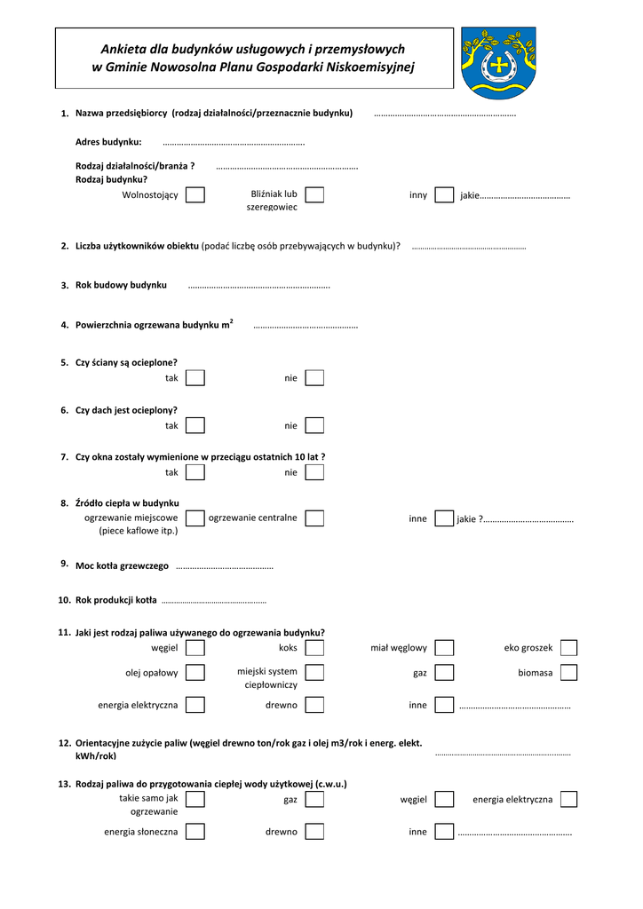 Ankieta dla budynków usługowych i przemysłowych w Gminie Nowosolna Planu Gospodarki Niskoemisyjnej 1. Nazwa przedsiębiorcy (rodzaj działalności/przeznacznie budynku) Adres budynku: ……………………………………………………. ……………………………………………………. Rodzaj działalności/branża ? Rodzaj budynku? ……………………………………………………. Bliźniak lub szeregowiec Wolnostojący inny 2. Liczba użytkowników obiektu (podać liczbę osób przebywających w budynku)? 3. Rok budowy budynku jakie………………………………… …………………………………….………… ……………………………………………………. 4. Powierzchnia ogrzewana budynku m2 ……………………………………… 5. Czy ściany są ocieplone? tak nie 6. Czy dach jest ocieplony? tak nie 7. Czy okna zostały wymienione w przeciągu ostatnich 10 lat ? tak nie 8. Źródło ciepła w budynku ogrzewanie miejscowe (piece kaflowe itp.) ogrzewanie centralne inne jakie ?………………………………… 9. Moc kotła grzewczego …………………………………… 10. Rok produkcji kotła …………………………………..…...… 11. Jaki jest rodzaj paliwa używanego do ogrzewania budynku? węgiel koks miał węglowy eko groszek olej opałowy miejski system ciepłowniczy gaz biomasa energia elektryczna drewno inne 12. Orientacyjne zużycie paliw (węgiel drewno ton/rok gaz i olej m3/rok i energ. elekt. kWh/rok) 13. Rodzaj paliwa do przygotowania ciepłej wody użytkowej (c.w.u.) takie samo jak gaz ogrzewanie energia słoneczna drewno węgiel inne ………………………………………… ………………………………………………....……. energia elektryczna …………………………………………. 14. Żużycie paliw (węgiel drewno ton/rok gaz i olej m3/rok i energ. elekt. kWh/rok) ………………………….…………………… 15. Czy planowana jest termomodernizacja budynku do 2020r.? tak 16. Jeśli tak - to w jakim zakresie? wymiana starego kotła na nowy montaż pompy ciepła nie ocieplenie scian zewnętrznych ocieplenie dachu /stropodachu montaż kolektorów słonecznych inne wymiana okien i drzwi jakie………………………………… 17. Dane dotyczące posiadanych pojazdów podać liczbę posiadanych pojazdów w rozbiciu na: podać roczny przebieg pojazdów w rozbiciu na: rodzaj stosowanego paliwa w pojazdach: osobowe: ………………… osobowe : ….………………….. benzyna ciężarowe: ………………. ciężarowe : …………………….. ropa rolnicze: ………….………. rolnicze: …………………………. gaz/Lpg 18. Dane dotyczące zużycia energii elektrycznej grupa taryfowa: ………………………………………………………. miesięczne zużycie prądu zł/miesiąc: ……………………………………………………. 19. Zakres prac termomodernizacyjnych jakie zostały przeprowadzone przez ostatnie 10 lat wymiana instalacji c.o./ ocieplenie ścian ocieplenie dachu kotła/c.w.u. wymiana okien i drzwi 20. Czy wyrażają Państwo chęć uczestnićtwa w programach/projektach unijnych (umożliwiających dofinansowanie) tak nie Wypełnioną Ankietę należy dostarczyć do Sekretariatu Urzędu Gminy Nowosolna Lub Uzupelnić elektronicznie ankietę która jest dostępna online na stronie internetowej http://……………………………………………………………..