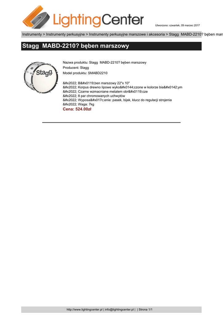 Utworzono: czwartek, 09 marzec 2017 Instrumenty > Instrumenty perkusyjne > Instrumenty perkusyjne marszowe i akcesoria > Stagg MABD-2210? bęben mars Stagg MABD-2210? bęben marszowy Nazwa produktu: Stagg MABD-2210? bęben marszowy Producent: Stagg Model produktu: SMABD2210 • Bęben marszowy 22"x 10" • Korpus drewno lipowe wykończone w kolorze białym • Czarne wzmacniane metalem obręcze • 8 par chromowanych uchwytów • Wyposażenie: pasek, bijak, klucz do regulacji strojenia • Waga: 7kg Cena: 524.00zł http://www.lightingcenter.pl | [email protected] | | Strona 1/1