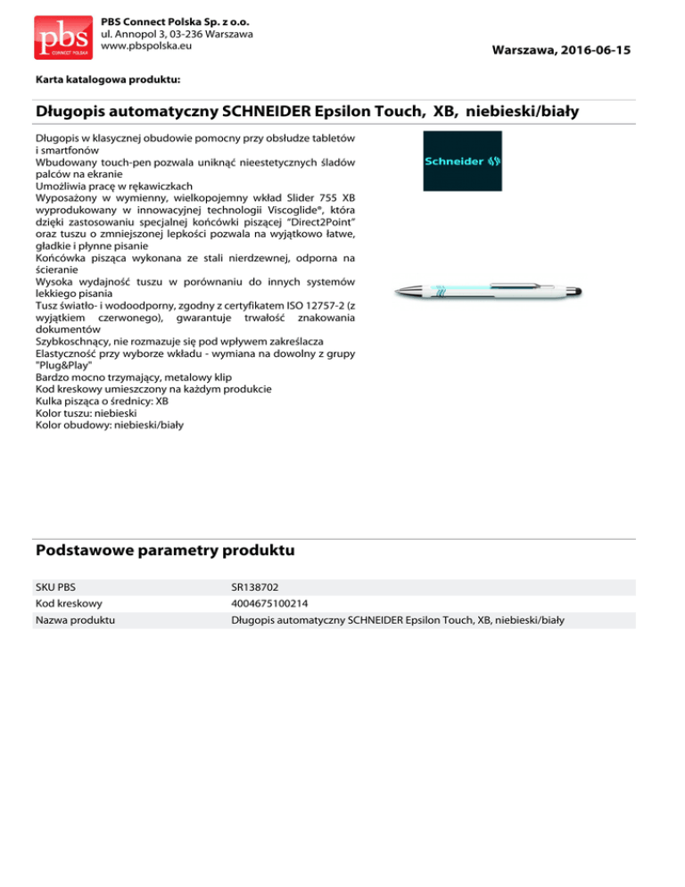 PBS Connect Polska Sp. z o.o. ul. Annopol 3, 03-236 Warszawa www.pbspolska.eu Warszawa, 2016-06-15 Karta katalogowa produktu: Długopis automatyczny SCHNEIDER Epsilon Touch, XB, niebieski/biały Długopis w klasycznej obudowie pomocny przy obsłudze tabletów i smartfonów Wbudowany touch-pen pozwala uniknąć nieestetycznych śladów palców na ekranie Umożliwia pracę w rękawiczkach Wyposażony w wymienny, wielkopojemny wkład Slider 755 XB wyprodukowany w innowacyjnej technologii Viscoglide®, która dzięki zastosowaniu specjalnej końcówki piszącej “Direct2Point” oraz tuszu o zmniejszonej lepkości pozwala na wyjątkowo łatwe, gładkie i płynne pisanie Końcówka pisząca wykonana ze stali nierdzewnej, odporna na ścieranie Wysoka wydajność tuszu w porównaniu do innych systemów lekkiego pisania Tusz światło- i wodoodporny, zgodny z certyfikatem ISO 12757-2 (z wyjątkiem czerwonego), gwarantuje trwałość znakowania dokumentów Szybkoschnący, nie rozmazuje się pod wpływem zakreślacza Elastyczność przy wyborze wkładu - wymiana na dowolny z grupy "Plug&Play" Bardzo mocno trzymający, metalowy klip Kod kreskowy umieszczony na każdym produkcie Kulka pisząca o średnicy: XB Kolor tuszu: niebieski Kolor obudowy: niebieski/biały Podstawowe parametry produktu SKU PBS SR138702 Kod kreskowy 4004675100214 Nazwa produktu Długopis automatyczny SCHNEIDER Epsilon Touch, XB, niebieski/biały PBS Connect Polska Sp. z o.o. ul. Annopol 3, 03-236 Warszawa www.pbspolska.eu Warszawa, 2016-06-15 Karta katalogowa produktu cd. Długopis automatyczny SCHNEIDER Epsilon Touch, XB, niebieski/biały Podstawowe parametry produktu Kategoria Długopisy Marka SCHNEIDER Certyfikaty Nowy produkt w ofercie Standard Hit Standard Kolor Kolor Niebieski/biały Cecha Produkt Długopis automatyczny Typ Gładkie i płynne pisanie W ofercie od 2015-01 Wymiary Grubość linii (mm) XB Wspólny słownik zamówień CPV 30192121-5 Długopisy kulkowe Jednostki logistyczne Opakowanie 1 15 szt Opakowanie 2 5940 szt