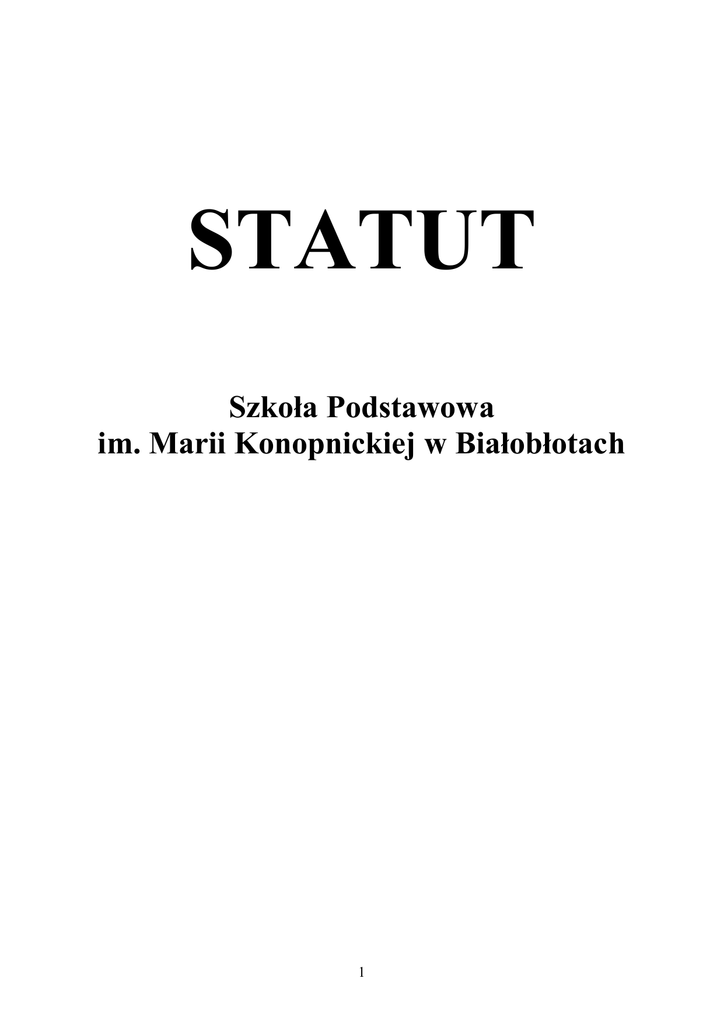 STATUT Szkoła Podstawowa im. Marii Konopnickiej w Białobłotach 1 Rozdział I POSTANOWIENIA OGÓLNE §1 1. Szkoła jest publiczną sześcioklasową szkołą podstawową w rozumieniu art. 7 Ustawy o Systemie Oświaty z dnia 7 września 1991 r. ze zmianami. 2. Szkoła nosi imię Marii Konopnickiej. 3. Siedzibą szkoły jest obiekt położony w miejscowości Białobłoty 20. 4. Organem prowadzącym szkołę jest Gmina Gizałki. 5. Nazwa szkoły jest używana w brzmieniu: Szkoła Podstawowa im. Marii Konopnickiej w Białobłotach . Rozdział II CELE, ZADANIA SZKOŁY - SPOSOBY ICH WYKONYWANIA §2 1. Umożliwienie zdobycia umiejętności i wiedzy niezbędnej do kontynuowania nauki w gimnazjum. 2. Zapewnienie uczniom możliwości pełnego rozwoju emocjonalnego, moralnego, umysłowego i fizycznego zgodnie z ich potrzebami i możliwościami psychofizycznymi w warunkach poszanowania ich godności osobistych. 3. Zapewnienie uczniom opieki pedagogicznej i zdrowotnej oraz pełne bezpieczeństwo w szkole i w czasie zajęć organizowanych przez szkołę. Opiekę pedagogiczną realizuje poprzez współpracę z poradnią psychologiczno-pedagogiczną, pedagogizację rodziców oraz ścisłą współpracę nauczycieli z rodzicami. 4. Szkoła umożliwia uczniom rozwój ich zdolności i zainteresowań poznawczych, artystycznych i sportowych poprzez koła zainteresowań, udział w zajęciach UKS, współpracę z GCK . 5. Szkoła uznaje prawo rodziców do religijnego wychowania dzieci w tym celu organizuje lekcje religii. 6. Realizuje się wychowanie patriotyczne poprzez obchody świąt narodowych i realizację ścieżki patriotycznej. 7. Właściwą postawę moralną i wychowawczą ucznia kształtuje się także poprzez udział i organizację różnego rodzaju uroczystości środowiskowych . 9. Odpowiedzialny za realizację poszczególnych zadań jest dyrektor w porozumieniu z wychowawcami klas. 2 Rozdział III ZADANIA ZESPOŁÓW NAUCZYCIELSKICH §3 1. Realizację zadań opiekuńczo – wychowawczych w klasie dyrektor zleca nauczycielowi – wychowawcy. 2. Przyjmuje się zasadę ciągłości w klasach I-III, IV-VI. Wychowawca pracuje w oparciu o plan pracy wychowawczej. 3. Wszyscy nauczyciele którym powierzono funkcję wychowawcy klasy stanowią zespół wychowawczy. Pracami zespołu wychowawczego kieruje dyrektor szkoły. 4. Zadaniami zespołów wychowawczych są: 1) planowanie pracy wychowawczej na dany rok szkolny z uwzględnieniem treści zawartych w programie wychowawczym szkoły i programie profilaktycznym, 2) monitoring, ewaluacja oraz przedstawianie wniosków dyrekcji i radzie pedagogicznej w sprawie zmian do programu wychowawczego szkoły, 3) monitoring, ewaluacja oraz przedstawianie wniosków dyrekcji i radzie pedagogicznej w sprawie oceny zachowania uczniów, 4) analizowanie konfliktowych sytuacji wychowawczych w szkole i przedstawianie wniosków mających na celu rozwiązywanie tych konfliktów, 5) kwalifikowanie uczniów do zespołów korekcyjno kompensacyjnych i dydaktyczno wyrównawczych, 6) współpraca z poradnią psychologiczno – pedagogiczną . §4 1. Nauczyciele prowadzący zajęcia w danym oddziale tworzą zespół. 2. Zadaniem tego zespołu jest: 1) ustalenie zestawu programów nauczania dla danego oddziału oraz jego modyfikowanie w miarę potrzeb, 2) ustalenie zestawu podręczników z poszczególnych przedmiotów dla danego oddziału. §5 1. Dyrektor w trybie zarządzenia tworzy zespoły przedmiotowe. 2. Zespołem kieruje jego przewodniczący. Przewodniczącego wybiera ogół członków tego zespołu. 3. W szkole działają zespoły przedmiotowe: 1) zespół przedmiotowy nauczania zintegrowanego, 2) zespół przedmiotowy humanistyczny, skupiający nauczycieli przedmiotów: a) język polski, b) historia, c) plastyka, d) muzyka, e) religia. 3 3) zespół przedmiotowy matematyczno – przyrodniczy, skupiający nauczycieli przedmiotów: a) matematyka, b) przyroda, c) informatyka, d) wychowanie fizyczne, e) technika. 4) zespół przedmiotowy języków niemieckiego i angielskiego. obcych, skupiający nauczycieli języka 4. Zadaniami zespołów przedmiotowych są: 1) opiniowanie przydatności programów nauczania i podręczników, 2) opiniowanie przydatności opracowań własnych i autorskich programów nauczania, 3) opracowywanie przedmiotowych systemów oceniania, 4) opracowywanie narzędzi mierzących poziom wiadomości i umiejętności uczniów, 5) dokonywanie analizy osiągnięć uczniów, wysuwanie wniosków i przedstawianie ich na posiedzeniach rady pedagogicznej, 6) organizowanie wewnątrzszkolnego doskonalenia nauczycieli w obrębie zespołu i szkoły, poprzez: a) lekcje koleżeńskie, b) referaty, c) szkolenia. 7) 8) analiza i wnioskowanie w sprawie zmian w szkolnym planie nauczania, wewnątrzszkolne doradztwo metodyczne. Rozdział IV ORGANY SZKOŁY §6 1. Organami szkoły są: 1) Dyrektor Szkoły, 2) Rada Pedagogiczna, 3) Rada Rodziców , 4) Samorząd Uczniowski. 2. Wszystkie organy szkoły mają obowiązek pracy na rzecz osiągania sukcesu szkolnego uczniów i współpracy między sobą. Zasady współdziałania organów szkoły określają ich regulaminy. 3. Dyrektor szkoły: 1) kieruje działalnością szkoły oraz reprezentuje ją na zewnątrz, 2) sprawuje nadzór pedagogiczny, 3) sprawuje opiekę nad uczniami i stwarza warunki harmonijnego rozwoju, psychofizycznego poprzez aktywne działania prozdrowotne, 4) realizuje uchwały rady pedagogicznej podjęte w ramach jej kompetencji stanowiących, 5) dysponuje środkami finansowymi określonymi w planie finansowym szkoły i ponosi odpowiedzialność za ich prawidłowe wykorzystanie, 6) wykonuje inne zadania wynikające z przepisów szczególnych, a) opracowuje dokumenty programowo-organizacyjne szkoły, 4 b) planu pracy dydaktycznej, wychowawczej i opiekuńczej, c) rocznego planu pracy szkoły, d) regulaminu szkoły, e) tygodniowego rozkładu zajęć; 7) odpowiada za prawidłową organizację i przebieg sprawdzianu kompetencji