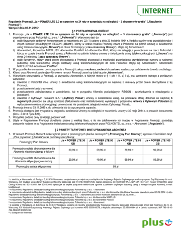 Regulamin Promocji „Ja + POWER LTE 2.0 ze sprzętem na 24 raty w sprzedaży na odległość – 3 abonamenty gratis” („Regulamin Promocji”) Wersja z dnia 03.11.2015r. § 1 POSTANOWIENIA OGÓLNE 1. Promocja „Ja + POWER LTE 2.0 ze sprzętem na 24 raty w sprzedaży na odległość – 3 abonamenty gratis” („Promocja”) jest organizowana przez Polkomtel sp. z o.o.1) („Polkomtel”) i skierowana jest do: a) osób fizycznych będących konsumentami w rozumieniu art. 22 (1) ustawy z dnia 23 kwietnia 1964 r. Kodeks cywilny oraz przedsiębiorców i innych klientów posiadających REGON („Klient”), którzy w czasie trwania Promocji zawrą z Polkomtel na piśmie umowę o świadczenie usług telekomunikacyjnych („Umowa") na okres 24 miesięcy („czas oznaczony Umowy”), stając się Abonentami2), b) Abonentów3), Abonentów MIXPLUS4), Abonentów PlusMix5) lub Abonentów Mix6), którzy nie zalegają z płatnościami na rzecz Polkomtel i którzy w czasie trwania Promocji zawrą z Polkomtel na piśmie kolejną umowę o świadczenie usług telekomunikacyjnych („Umowa") na okres 24 miesięcy („czas oznaczony Umowy”). c) osób fizycznych, którzy przed dniem skorzystania z Promocji skorzystali z możliwości przeniesienia przydzielonego numeru w ruchomej publicznej sieci telefonicznej innego dostawcy usług telekomunikacyjnych do sieci Polkomtel stając się Abonentami3), Abonentami MIXPLUS4) lub Abonentów PlusMix5) 2. W przypadku konsumentów, do skorzystania z Promocji i zakupu modemu, routera lub zestawu wystarczy przedstawienie dowodu osobistego. 3. Klienci oraz Abonenci zawierający Umowę w ramach Promocji zwani są dalej łącznie „Abonentami”. 4. Warunkiem skorzystania z Promocji, w przypadku Abonentów, o których mowa w § 1 pkt 1 lit. a) i b), jest spełnienie jednego z poniższych warunków: a) zawarcie z Polkomtel innej umowy o świadczenie usług telekomunikacyjnych co najmniej 6 miesięcy przed dniem skorzystania z tej Promocji, b) przedstawienie karty kredytowej, c) przedstawienie zaświadczenia o zatrudnieniu, lub w przypadku Klientów posiadających REGON - zaświadczenia o niezaleganiu z podatkami, d) zawarcie z Cyfrowym Polsatem S.A. 7 („Cyfrowy Polsat”) umowy o świadczenie usług, na podstawie której dokonali co najmniej 6 regularnych płatności za usługi cykliczne (fakturowane oraz niefakturowane) wynikające z podpisanej umowy z Cyfrowym Polsatem (z wykluczeniem okresu promocyjnego umowy) oraz nie posiadanie zaległości wobec Cyfrowego Polsatu. 5. Promocja trwa od 03.11.2015 r. do odwołania lub do wyczerpania zapasów. 6. Promocja dostępna jest wyłącznie w przypadku zawierania Umowy na odległość w rozumieniu ustawy z 30 maja 2014 r. o prawach konsumenta (Dz.U. z 2014 r poz.827). 7. Wszystkie podane ceny zawierają podatek VAT. 8. Użyte w Regulaminie Promocji określenia pisane z wielkiej litery, o ile nie zdefiniowano ich inaczej w Regulaminie Promocji, posiadają znaczenie nadane im w Regulaminie świadczenia usług telekomunikacyjnych przez POLKOMTEL sp. z o.o. – Abonament („Regulamin”). § 2 PAKIETY TARYFOWE I INNE UPRAWNIENIA ABONENTA 1. W ramach Promocji Abonent może wybrać jeden z promocyjnych planów cenowych 8) („Promocyjny Plan Cenowy”) zgodnie z Cennikiem taryf „iPlus prywatnie” („Cennik”) oraz poniższą specyfikacją: Ja + POWER LTE 30 Ja + POWER LTE 50 Ja + POWER LTE 80 Ja + POWER LTE 100 Promocyjny Plan Cenowy GB GB GB GB Promocyjna opłata abonamentowa dla Abonenta nieaktywującego e-faktury 39,99 zł 59,99 zł 79,99 zł 99,99 zł Promocyjna opłata abonamentowa dla Abonenta aktywującego e-fakturę 29,99 zł 49,99 zł 69,99 zł 89,99 zł Promocyjna opłata aktywacyjna 1) z 59 zł siedzibą w Warszawie, ul. Postępu 3, 02-676 Warszawa, zarejestrowaną w rejestrze przedsiębiorców Krajowego Rejestru Sądowego prowadzonym przez Sąd Rejonowy dla m.st. Warszawy, XIII Wydział Gospodarczy Krajowego Rejestru Sądowego pod nr KRS 0000419430, kapitał zakładowy 3.510.300.000 PLN, NIP 527-10-37-727, Regon 011307968, Dział Obsługi Klienta tel. 601102601, fax 601102602 (opłaty jak za zwykłe połączenie telefoniczne zgodnie z pakietem taryfowym dostawcy usług, z którego korzysta Abonent), e-mail: [email protected]. 2) w rozumieniu Regulaminu świadczenia usług telekomunikacyjnych przez Polkomtel sp. z o.o. – Abonament 3 w rozumieniu odpowiednio Regulaminu świadczenia usług telekomunikacyjnych przez Polkomtel sp. z o.o. dla Abonentów (dla Umów/ Aneksów zawartych przed 25.12.2014 r.) albo Regulaminu świadczenia usług telekomunikacyjnych przez Polkomtel sp. z o.o. – Abonament (dla Umów/ Aneksów zawartych od 25.12.2014 r.). 4) w rozumieniu Regulaminu świadczenia usług telekomunikacyjnych przez Polkomtel sp. z o.o. dla Abonentów MIXPLUS 5) w rozumieniu Regulaminu świadczenia usług telekomunikacyjnych przez Polkomtel sp. z o.o. dla Abonentów PlusMix 6) w rozumieniu Regulaminu świadczenia usług telekomunikacyjnych przez Polkomtel sp. z o.o. - Abonament 7 z siedzibą w Warszawie, ul. Łubinowa 4a, 03-878 Warszawa, wpisana do rejestru przedsiębiorców Krajowego Rejestru Sądowego prowadzonego przez Sąd Rejonowy dla m. st. Warszawy, XIII Wydział Gospodarczy Krajowego Rejestru Sądowego pod numerem KRS 0000010078, o kapitale zakładowym: 25.581.840,64 zł, w całości opłaconym, NIP 796-18-10732, REGON 670925160 8) z dostępem do internetu Limit wysłanych i odebranych danych w jednym okresie rozliczeniowym („podstawowy limit transmisji danych”) Limit wysłanych i odebranych danych w jednym okresie rozliczeniowym, tylko w technologii LTE w ramach jednej z usług „Internet LTE bez limitu danych” lub „Internet LTE bez limitu danych za 0 zł” („limit transmisji danych LTE”), po przekroczeniu „podstawowego limitu transmisji danych” Maksymalna prędkość pobierania danych w ramach usługi „Internet LTE bez limitu danych” po przekroczeniu podstawowego limitu transm