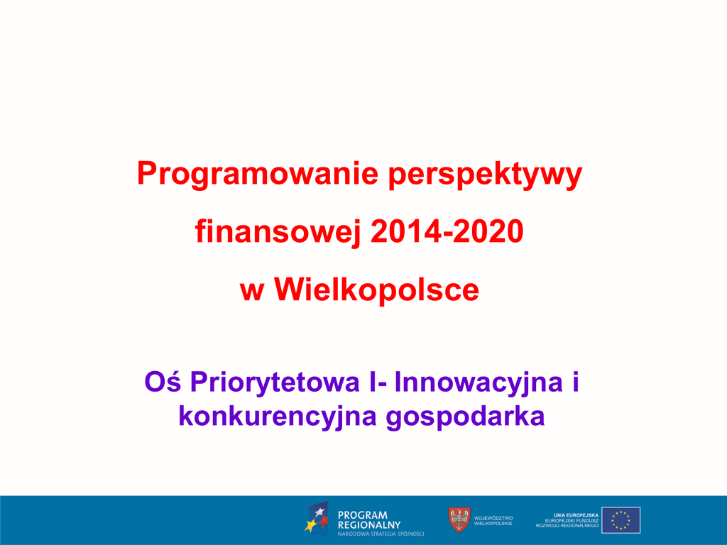 1 Programowanie perspektywy finansowej 2014-2020 w Wielkopolsce Oś Priorytetowa I- Innowacyjna i konkurencyjna gospodarka 2 Alokacja środków na WRPO 2014+ WRPO 2014+ 2 450,2 mln euro (EFRR – 1 760,9 mln euro; EFS – 689,2 mln euro) Dla porównania: WRPO 2007-2013 – 1 332,6 mln euro (EFRR) komponent regionalny PO KL – 536,1 mln euro (EFS) RAZEM: 1 868,7 mln euro 3 Cel główny WRPO 2014+ POPRAWA KONKURENCYJNOŚCI I SPÓJNOŚCI WOJEWÓDZTWA 4 Alokacja wg Priorytetów WRPO 2014+ Osie priorytetowe Wsparcie UE mln euro Udział w alokacji na Program (%) Fundusz 1. Innowacyjna i konkurencyjna gospodarka 467,9 19,1% EFRR 2. Społeczeństwo informacyjne 60,0 2,4% EFRR 3. Energia 353,5 14,4% EFRR 4. Środowisko 204,0 8,3% EFRR 5. Transport 414,0 16,9% EFRR 265 10,8% EFS 7. Włączenie społeczne 197,3 8,1% EFS 8. Edukacja 156,3 6,4% EFS 9. Infrastruktura dla kapitału ludzkiego 261,6 10,7% EFRR 10. Pomoc techniczna 70,7 2,9% EFS Razem WRPO 2014+ 2 450,2 100,0% - 6. Rynek pracy 5 Działanie 1.1 Wsparcie infrastruktury B+R w sektorze nauki (alokacja 25 mln €) Typy projektów Wsparcie infrastruktury badawczej w jednostkach naukowych w obszarach zidentyfikowanych w procesie przedsiębiorczego odkrywania jako regionalne inteligentne specjalizacje polegające na: • • budowie, rozbudowie i/lub adaptacji obiektów pod infrastrukturę B+R zakupie i/lub modernizacji infrastruktury badawczej zgodnie z definicją infrastruktury badawczej” z Rozporządzenia Komisji (UE) nr 651/2014 z dnia 17.06.2014. Beneficjenci: • • • jednostki naukowe i ich konsorcja uczelnie wyższe konsorcja naukowo-przemysłowe (rolę lidera pełni jednostka naukowa) Poziom dofinansowania: • • • 45% kosztów kwalifikowanych projektu dla mikro, małych przedsiębiorstw; 35% kosztów kwalifikowanych projektu dla średnich przedsiębiorstw; 25% kosztów kwalifikowanych projektu dla dużych przedsiębiorstw. Warunki dodatkowe: • • wsparcie możliwe wyłącznie dla inwestycji w infrastrukturę B+R wynegocjowanych w ramach prac nad Kontraktem Terytorialnym, w tym projektów ujętych w Polskiej Mapie Drogowej Infrastruktury Badawczej, ocenionych przez przedstawicieli ministra właściwego ds. rozwoju regionalnego, ministra właściwego ds. nauki oraz Naukowego Centrum Badań i Rozwoju. wsparcie mogą otrzymać wyłącznie projekty wpisujące się w regionalne inteligentne specjalizacje 8 Inteligentne specjalizacje Inteligentną specjalizację można określić, jako oddolny proces identyfikacji obszarów nauki i technologii, z których może korzystać wybrany region. Obszarów, które wsparte nauką i posiadających potencjał biznesowy, mogą generować produkty i usługi, mające szansę na rywalizację na rynkach międzynarodowych. Działanie 1.2 Wzmocnienie potencjału innowacyjnego przedsiębiorstw Wielkopolski (alokacja 101,9 mln €) Typy projektów: • • • wsparcie infrastruktury B+R poprzez stworzenie lub rozwój istniejącego zaplecza badawczo-rozwojowego w postaci działów B+R w przedsiębiorstwach (w tym laboratoriów) oraz tworzenie centrów badawczorozwojowych. prowadzenie badań w przedsiębiorstwach, w tym badań przemysłowych i/lub eksperymentalnych prac rozwojowych po stworzenie linii demonstracyjnej. zakup i wdrożenie wyników prac B+R oraz praw do własności intelektualnej. Typy projektów można łączyć. Beneficjenci: • • • przedsiębiorstwa lub ich grupy konsorcja przedsiębiorstw i jednostek naukowych, uczelni (w tym spółek celowych uczelni) lub organizacji pozarządowych (wiodącą rolę pełni przedsiębiorstwo) podmioty wdrażające instrumenty finansowe Poziom dofinansowania: • • • 45% kosztów kwalifikowanych projektu dla mikro, małych przedsiębiorstw; 35% kosztów kwalifikowanych projektu dla średnich przedsiębiorstw; 25% kosztów kwalifikowanych projektu dla dużych przedsiębiorstw. Warunki dodatkowe: • • • • wsparciem nie zostaną objęte projekty dotyczące wyłącznie fazy tzw. pierwszej produkcji. Zakres projektu musi obejmować także poprzednie fazy tj. eksperymentalne prace rozwojowe/fazę demonstracji i fazę walidacji wsparcie mogą otrzymać wyłącznie projekty wpisujące się w regionalne inteligentne specjalizacje warunkiem wsparcia tworzenia i rozwoju infrastruktury B+R, inwestycji w aparaturę, sprzęt i inne niezbędne wyposażenie służące powstawaniu działów B+R i laboratoriów w przedsiębiorstwach jest przedstawienie planu w zakresie prac B+R. wdrożenie zakupionych wyników B+R możliwe jest wyłącznie w przypadku konieczności przeprowadzenia prac rozwojowych, uzupełniających/dostosowujących technologie do specyfiki przedsiębiorstwa. Działanie 1.3 Wsparcie przedsiębiorczości i infrastruktury na rzecz rozwoju gospodarczego (alokacja 43,5 mln €) Typy projektów: • • • 1.3.1 zapewnienie przedsiębiorstwom w początkowej fazie działalności usług potrzebnych do funkcjonowania przedsiębiorstwa (w tym np.: udostępnienie infrastruktury, usługi prawne i księgowe, doradztwo) oraz wsparcie inwestycyjne na zakup środków trwałych i wartości niematerialnych i praw 1.3.2 rozwój potencjału i poprawa jakości usług oraz infrastruktury instytucji otoczenia biznesu na rzecz inkubacji przedsiębiorstw, w tym dla regionalnych inteligentnych specjalizacji. 1.3.3 kompleksowe tworzenie nowej i rozwój istniejącej infrastruktury na rzecz rozwoju gospodarczego (w tym dla regionalnych specjalizacji) w szczególności na nieużytkach, zlokalizowanych w pobliżu inwestycji transportowych (autostrady, drogi szybkiego ruchu, linii kolejowe), terenach zdegradowanych, wymagających rewitalizacji Beneficjenci: • Instytucje Otoczenia Biznesu (IOB) • Jednostki Samorządu Terytorialnego Poziom dofinansowania: • do 85% kosztów kwalifikowanych projektu w ramach pomocy de minimis • dla projektów inwestycyjnych IOB: 45% kosztów kwalifikowanych projektu dla mikro i małych przedsiębiorstw; 35% kosztów kwalifikowanyc