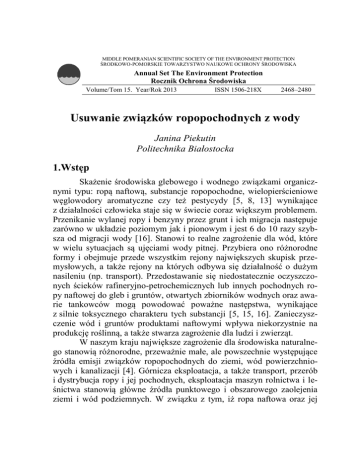 MIDDLE POMERANIAN SCIENTIFIC SOCIETY OF THE ENVIRONMENT PROTECTION ŚRODKOWO-POMORSKIE TOWARZYSTWO NAUKOWE OCHRONY ŚRODOWISKA Annual Set The Environment Protection Rocznik Ochrona Środowiska Volume/Tom 15. Year/Rok 2013 ISSN 1506-218X 2468–2480 Usuwanie związków ropopochodnych z wody Janina Piekutin Politechnika Białostocka 1.Wstęp Skażenie środowiska glebowego i wodnego związkami organicznymi typu: ropą naftową, substancje ropopochodne, wielopierścieniowe węglowodory aromatyczne czy też pestycydy [5, 8, 13] wynikające z działalności człowieka staje się w świecie coraz większym problemem. Przenikanie wylanej ropy i benzyny przez grunt i ich migracja następuje zarówno w układzie poziomym jak i pionowym i jest 6 do 10 razy szybsza od migracji wody [16]. Stanowi to realne zagrożenie dla wód, które w wielu sytuacjach są ujęciami wody pitnej. Przybiera ono różnorodne formy i obejmuje przede wszystkim rejony największych skupisk przemysłowych, a także rejony na których odbywa się działalność o dużym nasileniu (np. transport). Przedostawanie się niedostatecznie oczyszczonych ścieków rafineryjno-petrochemicznych lub innych pochodnych ropy naftowej do gleb i gruntów, otwartych zbiorników wodnych oraz awarie tankowców mogą powodować poważne następstwa, wynikające z silnie toksycznego charakteru tych substancji [5, 15, 16]. Zanieczyszczenie wód i gruntów produktami naftowymi wpływa niekorzystnie na produkcję roślinną, a także stwarza zagrożenie dla ludzi i zwierząt. W naszym kraju największe zagrożenie dla środowiska naturalnego stanowią różnorodne, przeważnie małe, ale powszechnie występujące źródła emisji związków ropopochodnych do ziemi, wód powierzchniowych i kanalizacji [4]. Górnicza eksploatacja, a także transport, przerób i dystrybucja ropy i jej pochodnych, eksploatacja maszyn rolnictwa i leśnictwa stanowią główne źródła punktowego i obszarowego zaolejenia ziemi i wód podziemnych. W związku z tym, iż ropa naftowa oraz jej Usuwanie związków ropopochodnych z wody 2469 produkty wykazują toksyczność wobec organizmów żywych należy nieustannie monitorować stan środowiska pod względem występowania tych zanieczyszczeń jak i podejmować wszelakie działania mające na celu minimalizację występowania wypadków i awarii związanych z ropą naftową i jej pochodnymi [15]. W przypadku zanieczyszczenia wód gruntowych związkami ropopochodnymi wysoka toksyczność tych substancji w połączeniu z faktem, iż wody te często wykorzystywane są jako źródło wody pitnej, powoduje konieczność podejmowania zdecydowanych działań [8, 12]. Są one związane z eliminacją zagrożenia, jakie niesie za sobą zanieczyszczenie wód gruntowych węglowodorami ropopochodnymi. Mimo podjętych działań substancje ropopochodne pozostają w wodzie powierzchniowej i infiltrują do wody podziemnej. Zawartość węglowodorów ropopochodnych w wodzie do picia w Polsce nie jest badana, natomiast przy ocenie klas wody podziemnej i powierzchniowej stężenie tych zanieczyszczeń jest monitorowane. Świadomość przedstawionych pokrótce zagrożeń dla wód powierzchniowych i podziemnych skłania do poszukiwania efektywnych metod oczyszczania wody celem ochrony zdrowia konsumentów i zasobów wód naturalnych. Dobór metody oczyszczania zależny jest od ilości i jakości substancji ropopochodnych występujących w wodzie, przy czym należy wybrać metodę za pomocą której można osiągnąć wysoki stopień oczyszczania [8, 3, 6]. Z przeprowadzonych analiz ekonomicznych [3, 14] wynika, że stripping gazowy, w porównaniu z adsorpcją zanieczyszczeń z fazy ciekłej na granulowanym węglu aktywnym, jest tańszym rozwiązaniem, gdyż nie jest konieczne oczyszczanie gazów odlotowych. W literaturze [3, 9] dotyczącej strippingu gazowego można znaleźć kilka przykładów wykorzystania tego procesu w uzdatnianiu wody: usuwanie z wody do picia niepożądanych produktów ubocznych dezynfekcji, oczyszczanie wód podziemnych z zanieczyszczeń organicznych – węglowodorów (dotyczy terenów skażonych przez zakłady przemysłowe), stacje paliw. Celem prezentowanej pracy była ocena zastosowanej wieży strippingowej do usuwania z wody substancji ropopochodnych od C7 do C35 oraz określenie efektywności usunięcia substancji ropopochodnych. Za- 2470 Janina Piekutin gadnieniem wymagającym rozwiązania na drodze doświadczalnej jest uzyskanie informacji o wpływie warunków pracy układu badawczego (parametrów technologicznych prowadzenia procesu uzdatniania wody) oraz wartości stężeń substancji ropopochodnych w wodzie. Zaprezentowane wyniki w pracy stanowią syntezę badań własnych autorki zrealizowanych w ramach badań własnych. 2. Materiały i metody badań W prowadzonych badaniach proces usuwania węglowodorów ropopochodnych prowadzono w wieży strippingowej. Zanieczyszczoną wodę wprowadzano od góry, która przepływając przez złoże w kolumnie desorpcyjnej poddawano napowietrzaniu. Kolumna zawiera dyszę rozpylającą na szczycie, przez która zanieczyszczona woda była wtryskiwana do wnętrza kolumny, wentylatory wywoływały ruch powietrza w kierunku przeciwnym do przepływu wody i osadnik w dnie, w którym zbiera się oczyszczona woda. Badania technologiczne prowadzono przy różnym stężeniu, stałej intensywności napowietrzania i obciążeniu hydraulicznym 1 [m3/m2·h]. Wypełnienie wieży stanowiły pierścienie Raschiga w celu zwiększenia efektywności procesów prowadzonych w kolumnie poprzez rozwinięcie powierzchni międzyfazowej obu stykających się mediów [3,9]. W procesie przepływu przez wypełnienie doprowadza się do ciągłego rozbijania kropli wody, co zapewnia znaczne zmniejszenie napięcia powierzchniowego, które jest najmniejsze w czasie ponownego formowania się kropli. Badania przeprowadzono w czterech seriach. Wodę modelową stanowiła mieszanina wody destylowanej i mieszanki b
