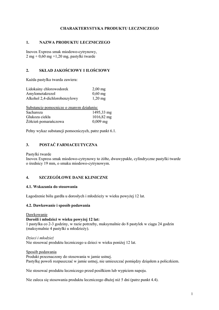 CHARAKTERYSTYKA PRODUKTU LECZNICZEGO 1. NAZWA PRODUKTU LECZNICZEGO Inovox Express smak miodowo-cytrynowy, 2 mg + 0,60 mg +1,20 mg, pastylki twarde 2. SKŁAD JAKOŚCIOWY I ILOŚCIOWY Każda pastylka twarda zawiera: Lidokainy chlorowodorek Amylometakrezol Alkohol 2,4-dichlorobenzylowy 2,00 mg 0,60 mg 1,20 mg Substancje pomocnicze o znanym działaniu: Sacharoza 1495,33 mg Glukoza ciekła 1016,82 mg Żółcień pomarańczowa 0,009 mg Pełny wykaz substancji pomocniczych, patrz punkt 6.1. 3. POSTAĆ FARMACEUTYCZNA Pastylki twarde Inovox Express smak miodowo-cytrynowy to żółte, dwuwypukłe, cylindryczne pastylki twarde o średnicy 19 mm, o smaku miodowo-cytrynowym. 4. SZCZEGÓŁOWE DANE KLINICZNE 4.1. Wskazania do stosowania Łagodzenie bólu gardła u dorosłych i młodzieży w wieku powyżej 12 lat. 4.2. Dawkowanie i sposób podawania Dawkowanie Dorośli i młodzież w wieku powyżej 12 lat: 1 pastylka co 2-3 godziny, w razie potrzeby, maksymalnie do 8 pastylek w ciągu 24 godzin (maksymalnie 4 pastylki u młodzieży). Dzieci i młodzież Nie stosować produktu leczniczego u dzieci w wieku poniżej 12 lat. Sposób podawania Produkt przeznaczony do stosowania w jamie ustnej. Pastylkę powoli rozpuszczać w jamie ustnej, nie umieszczać pomiędzy dziąsłem a policzkiem. Nie stosować produktu leczniczego przed posiłkiem lub wypiciem napoju. Nie zaleca się stosowania produktu leczniczego dłużej niż 5 dni (patrz punkt 4.4). 1 Osoby w podeszłym wieku: Dostosowanie dawki nie jest konieczne. Pacjenci z zaburzeniami czynności nerek i (lub) wątroby: Nie ma dostępnych danych dotyczących stosowania produktu Inovox Express smak miodowocytrynowy u pacjentów z zaburzeniami czynności wątroby lub nerek. 4.3. Przeciwwskazania Nadwrażliwość na substancje czynne lub na którąkolwiek substancję pomocniczą wymienioną w punkcie 6.1. Ze względu na zawartość lidokainy produkt jest przeciwwskazany do stosowania u dzieci w wieku poniżej 12 lat. 4.4. Specjalne ostrzeżenia i środki ostrożności dotyczące stosowania Należy przestrzegać wskazanego dawkowania: przyjmowanie produktu w dużych dawkach lub zbyt często może wpływać na układ nerwowy w wyniku przenikania leku do krwi, co może wywoływać drgawki lub zaburzenia pracy serca. Nie zaleca się stosowania produktu dłużej niż 5 dni, ponieważ może on zmieniać naturalną florę bakteryjną w gardle. Jeśli objawy utrzymują się dłużej niż 2 dni, nasilą się lub wystąpią inne objawy, takie jak wysoka gorączka, ból głowy, nudności lub wymioty i wysypka na skórze, należy ocenić stan kliniczny w celu wykrycia zakażeń bakteryjnych (angina, zapalenie migdałków). Należy zachować ostrożność podczas stosowania produktu u ciężko chorych lub osłabionych osób w podeszłym wieku, ponieważ osoby takie są bardziej wrażliwe na działania niepożądane tego produktu leczniczego. Produktu nie należy stosować, jeśli w jamie ustnej i gardle występują większe niezagojone rany. Znieczulenie gardła spowodowane tym produktem leczniczym może doprowadzić do zachłyśnięcia (kaszel podczas jedzenia sugerujący, że pacjent się zadławił). W związku z tym nie należy stosować produktu przed posiłkiem lub wypiciem napoju. Pacjenci z astmą powinni stosować ten produkt leczniczy pod kontrolą lekarza. Inovox Express smak miodowo-cytrynowy zawiera 1,016 g glukozy w jednej pastylce, co należy wziąć pod uwagę podczas leczenia pacjentów z zespołem złego wchłaniania glukozy-galaktozy oraz u pacjentów z cukrzycą. Inovox Express smak miodowo-cytrynowy zawiera sacharozę. Nie należy stosować tego produktu leczniczego u pacjentów z rzadkimi dziedzicznymi zaburzeniami związanymi z nietolerancją fruktozy, zespołem złego wchłaniania glukozy-galaktozy lub niedoborem sacharazy-izomaltazy. Inovox Express smak miodowo-cytrynowy zawiera 1,495 g sacharozy w jednej pastylce, co należy wziąć pod uwagę podczas leczenia pacjentów z zespołem złego wchłaniania glukozy-galaktozy oraz u pacjentów z cukrzycą. Inovox Express smak miodowo-cytrynowy może powodować drętwienie języka i zwiększać ryzyko ugryzienia się. Dlatego należy zachować ostrożność podczas jedzenia i picia gorących pokarmów i napojów. Pacjenta należy poinformować, że miejscowe znieczulenie może zaburzać połykanie, a tym 2 samym zwiększyć ryzyko zachłyśnięcia. Z tego powodu nie należy jeść bezpośrednio po zastosowaniu środków miejscowo znieczulających w obrębie jamy ustnej i gardła. Pacjentów uczulonych na amidowe środki miejscowo znieczulające należy poinformować o nadwrażliwości krzyżowej na leki amidowe, takie jak lidokaina (patrz punkt 4.5). Barwnik żółcień pomarańczowa może powodować reakcje alergiczne. 4.5. Interakcje z innymi produktami leczniczymi i inne rodzaje interakcji Nie zaleca się stosowania innych środków antyseptycznych jednocześnie lub jeden po drugim ze względu na możliwość interakcji (działanie przeciwstawne, dezaktywacja). Mimo że dawka lidokainy jest niewielka, ze względu na jej zawartość w produkcie, należy wziąć pod uwagę następujące fakty: – Leki blokujące receptory beta-adrenergiczne zmniejszają przepływ krwi przez wątrobę, a zatem także szybkość metabolizmu lidokainy, powodując zwiększone ryzyko działań toksycznych. – Cymetydyna może hamować metabolizm wątrobowy lidokainy, powodując zwiększone ryzyko działań toksycznych. – Może to powodować nadwrażliwość krzyżową na inne amidowe środki miejscowo znieczulające. – Leki przeciwarytmiczne klasy III, takie jak meksyletyna i prokainamid, mogą wywoływać interakcje farmakokinetyczne lub farmakodynamiczne. – Izoenzymy CYP1A2 i CYP3A4 cytochromu P450 biorą udział w powstawaniu MEGX, farmakologicznie aktywnego metabolitu lidokainy, dlatego inne leki, takie jak fluwoksamina, erytromycyna i itrakonazol, mogą zwiększać stężenie lidokainy w osoczu krwi. 4.6. Wpływ n