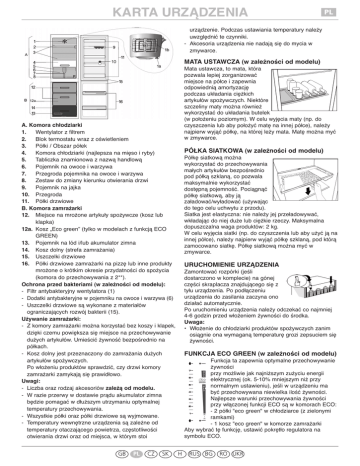 KARTA URZĄDZENIA PL urządzenie. Podczas ustawiania temperatury należy uwzględnić te czynniki. - Akcesoria urządzenia nie nadają się do mycia w zmywarce. MATA USTAWCZA (w zależności od modelu) Mata ustawcza, to mata, która pozwala lepiej zorganizować miejsce na półce i zapewnia odpowiednią amortyzację podczas układania ciężkich artykułów spożywczych. Niektóre szczeliny maty można również wykorzystać do układania butelek (w położeniu poziomym). W celu wyjęcia maty (np. do czyszczenia lub aby położyć matę na innej półce), należy najpierw wyjąć półkę, na której leży mata. Matę można myć w zmywarce. A. Komora chłodziarki 1. Wentylator z filtrem 2. Blok termostatu wraz z oświetleniem 3. Półki / Obszar półek 4. Komora chłodziarki (najlepsza na mięso i ryby) 5. Tabliczka znamionowa z nazwą handlową 6. Pojemnik na owoce i warzywa 7. Przegroda pojemnika na owoce i warzywa 8. Zestaw do zmiany kierunku otwierania drzwi 9. Pojemnik na jajka 10. Przegroda 11. Półki drzwiowe B. Komora zamrażarki 12. Miejsce na mrożone artykuły spożywcze (kosz lub klapka) 12a. Kosz „Eco green” (tylko w modelach z funkcją ECO GREEN) 13. Pojemnik na lód i/lub akumulator zimna 14. Kosz dolny (strefa zamrażania) 15. Uszczelki drzwiowe 16. Półki drzwiowe zamrażarki na pizzę lub inne produkty mrożone o krótkim okresie przydatności do spożycia (komora do przechowywania z 2**). Ochrona przed bakteriami (w zależności od modelu): - Filtr antybakteryjny wentylatora (1) - Dodatki antybakteryjne w pojemniku na owoce i warzywa (6) - Uszczelki drzwiowe są wykonane z materiałów ograniczających rozwój bakterii (15). Używanie zamrażarki: - Z komory zamrażarki można korzystać bez koszy i klapek, dzięki czemu powiększa się miejsce na przechowywanie dużych artykułów. Umieścić żywność bezpośrednio na półkach. - Kosz dolny jest przeznaczony do zamrażania dużych artykułów spożywczych. Po włożeniu produktów sprawdzić, czy drzwi komory zamrażarki zamykają się prawidłowo. Uwagi: - Liczba oraz rodzaj akcesoriów zależą od modelu. - W razie przerwy w dostawie prądu akumulator zimna będzie pomagać w dłuższym utrzymaniu optymalnej temperatury przechowywania. - Wszystkie półki oraz półki drzwiowe są wyjmowane. - Temperatury wewnętrzne urządzenia są zależne od temperatury otaczającego powietrza, częstotliwości otwierania drzwi oraz od miejsca, w którym stoi GB PL CZ SK PÓŁKA SIATKOWA (w zależności od modelu) Półkę siatkową można wykorzystać do przechowywania małych artykułów bezpośrednio pod półką szklaną, co pozwala maksymalnie wykorzystać dostępną pojemność. Pociągnąć półkę siatkową, aby ją załadować/wyładować (używając do tego celu uchwytu z przodu). Siatka jest elastyczna: nie należy jej przeładowywać, wkładając do niej duże lub ciężkie rzeczy. Maksymalna dopuszczalna waga produktów: 2 kg. W celu wyjęcia siatki (np. do czyszczenia lub aby użyć ją na innej półce), należy najpierw wyjąć półkę szklaną, pod którą zamocowano siatkę. Półkę siatkową można myć w zmywarce. URUCHOMIENIE URZĄDZENIA Zamontować rozpórki (jeśli dostarczono w komplecie) na gónej części skraplacza znajdującego się z tyłu urządzenia. Po podłączeniu urządzenia do zasilania zaczyna ono działać automatycznie. Po uruchomieniu urządzenia należy odczekać co najmniej 4-6 godzin przed włożeniem żywności do środka. Uwaga: • Włożenie do chłodziarki produktów spożywczych zanim osiągnie ona wymaganą temperaturę grozi zepsuciem się żywności. FUNKCJA ECO GREEN (w zależności od modelu) Funkcja ta zapewnia optymalne przechowywanie żywności przy możliwie jak najniższym zużyciu energii elektrycznej (ok. 5-10% mniejszym niż przy normalnym ustawieniu), jeśli w urządzeniu ma być przechowywana niewielka ilość żywności. Najlepsze warunki przechowywania żywności przy włączonej funkcji ECO są w komorach ECO: - 2 półki "eco green" w chłodziarce (z zielonymi ramkami) - 1 kosz "eco green" w komorze zamrażarki Aby wybrać tę funkcję, ustawić pokrętło regulatora na symbolu ECO. H RUS BG RO UKR KARTA URZĄDZENIA WENTYLATOR (w zależności od modelu) Wentylator zapewnia korzystniejszy rozkład temperatur w komorze chłodziarki, a w efekcie lepsze przechowywanie artykułów spożywczych. Uwaga: Nie zasłaniać strefy wlotu powietrza produktami spożywczymi. Wentylator obraca się JEDYNIE wtedy, gdy pracuje sprężarka. PL ZAMRAŻANIE ŚWIEŻEJ ŻYWNOŚCI Włożyć świeże artykuły spożywcze przeznaczone do zamrożenia do dolnego kosza. Nie dopuszczać do bezpośredniego kontaktu z artykułami już zamrożonymi. Aby zamrozić ilość żywności podanej na tabliczce znamionowej, tuż przed włożenie produktów ustawić pokrętło termostatu na temperaturę nieco wyższą (np. w przypadku oznaczeń numerycznych, jeśli ustawiona wartość wynosi 4, przełączyć z powrotem na 3,5). Po 24 godzinach artykuły będą zamrożone. Ustawić pokrętło termostatu z powrotem na poprzedniej pozycji. Wentylator z przyciskiem Aby włączyć lub wyłączyć wentylator, należy nacisnąć przycisk (1a). Zaleca się włączenie wentylatora, gdy temperatura otoczenia przekroczy 27 ÷ 28°C, w przypadku zauważenia kropel wody na szklanych półkach lub w przypadku dużej wilgotności powietrza. Włączony wentylator poprawia warunki chłodzenia. Aby utrzymać żądane ustawienie urządzenia przy włączonym wentylatorze, konieczne może być wyregulowanie termostatu. Jeśli w chłodziarce jest zbyt zimno, wentylator można wyłączyć. Uwaga: Wentylator należy wyłączyć, jeśli temperatura powietrza otoczenia jest niższa niż podano powyżej. WYMIANA ŻARÓWKI Przed przystąpieniem do wymiany żarówki należy odłączyć urządzenie od sieci elektrycznej. Wykręcić żarówkę obracając ją w kierunku przeciwnym do ruchu wskazówek zegara, tak jak na rysu
