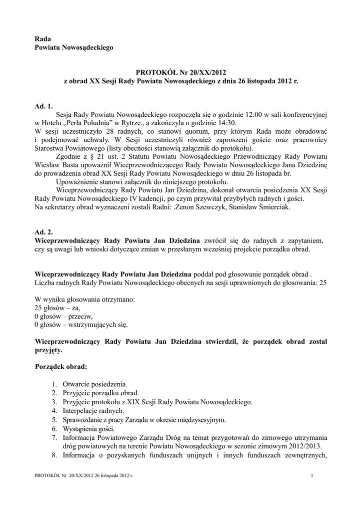 Rada Powiatu Nowosądeckiego PROTOKÓŁ Nr 20/XX/2012 z obrad XX Sesji Rady Powiatu Nowosądeckiego z dnia 26 listopada 2012 r. Ad. 1. Sesja Rady Powiatu Nowosądeckiego rozpoczęła się o godzinie 12:00 w sali konferencyjnej w Hotelu „Perła Południa” w Rytrze., a zakończyła o godzinie 14:30. W sesji uczestniczyło 28 radnych, co stanowi quorum, przy którym Rada może obradować i podejmować uchwały. W Sesji uczestniczyli również zaproszeni goście oraz pracownicy Starostwa Powiatowego (listy obecności stanowią załącznik do protokołu). Zgodnie z § 21 ust. 2 Statutu Powiatu Nowosądeckiego Przewodniczący Rady Powiatu Wiesław Basta upoważnił Wiceprzewodniczącego Rady Powiatu Nowosądeckiego Jana Dziedzinę do prowadzenia obrad XX Sesji Rady Powiatu Nowosądeckiego w dniu 26 listopada br. Upoważnienie stanowi załącznik do niniejszego protokołu. Wiceprzewodniczący Rady Powiatu Jan Dziedzina, dokonał otwarcia posiedzenia XX Sesji Rady Powiatu Nowosądeckiego IV kadencji, po czym przywitał przybyłych radnych i gości. Na sekretarzy obrad wyznaczeni zostali Radni: .Zenon Szewczyk, Stanisław Śmierciak. Ad. 2. Wiceprzewodniczący Rady Powiatu Jan Dziedzina zwrócił się do radnych z zapytaniem, czy są uwagi lub wnioski dotyczące zmian w przesłanym wcześniej projekcie porządku obrad. Wiceprzewodniczący Rady Powiatu Jan Dziedzina poddał pod głosowanie porządek obrad . Liczba radnych Rady Powiatu Nowosądeckiego obecnych na sesji uprawnionych do głosowania: 25 W wyniku głosowania otrzymano: 25 głosów – za, 0 głosów – przeciw, 0 głosów – wstrzymujących się. Wiceprzewodniczący Rady Powiatu Jan Dziedzina stwierdził, że porządek obrad został przyjęty. Porządek obrad: 1. 2. 3. 4. 5. 6. 7. Otwarcie posiedzenia. Przyjęcie porządku obrad. Przyjęcie protokołu z XIX Sesji Rady Powiatu Nowosądeckiego. Interpelacje radnych. Sprawozdanie z pracy Zarządu w okresie międzysesyjnym. Wystąpienia gości. Informacja Powiatowego Zarządu Dróg na temat przygotowań do zimowego utrzymania dróg powiatowych na terenie Powiatu Nowosądeckiego w sezonie zimowym 2012/2013. 8. Informacja o pozyskanych funduszach unijnych i innych funduszach zewnętrznych, PROTOKÓŁ Nr 20/XX/2012 26 listopada 2012 r. 1 złożonych wnioskach i efektach realizacji w II półroczu 2012 r. 9. Podjęcie uchwały Rady Powiatu Nowosądeckiego w sprawie wyboru biegłego rewidenta do przeprowadzenia badania sprawozdania finansowego Powiatu Nowosądeckiego za rok 2012. 10. Podjęcie uchwały Rady Powiatu Nowosądeckiego w sprawie Programu Współpracy Powiatu Nowosądeckiego z Organizacjami Pozarządowymi na rok 2013. 11. Podjęcie uchwały Rady Powiatu Nowosądeckiego w sprawie ustalenia rozkładu godzin pracy aptek ogólnodostępnych na terenie Powiatu Nowosądeckiego oraz dyżurów aptek ogólnodostępnych w porze nocnej, w niedzielę, święta i dni wolne od pracy na terenie Krynicy Zdroju, w 2013 roku. 12. Podjęcie uchwały Rady Powiatu Nowosądeckiego w sprawie ustalenia opłat za usuwanie pojazdów z dróg na terenie Powiatu Nowosądeckiego na koszt właściciela i przechowywania tych pojazdów na wyznaczonych parkingach strzeżonych. 13. Podjęcie uchwały Rady Powiatu Nowosądeckiego w sprawie skargi złożonej przez Ewę Klimczak i Jana Klimczaka. 14. Sprawy bieżące i wolne wnioski. 15. Zamknięcie obrad. Ad. 3. Przyjęcie protokołu z XIX Sesji Rady Powiatu Nowosądeckiego. Wiceprzewodniczący Rady Powiatu Jan Dziedzina poinformował radnych, iż zgodnie z § 34 ust. 4 i 5 Statutu Powiatu Nowosądeckiego protokół z ostatniej sesji Rady Powiatu został wyłożony do wiadomości na 7 dni przed terminem dzisiejszej sesji. Do chwili obecnej nie zostały zgłoszone poprawki ani uzupełnienia. W związku z brakiem poprawek i uzupełnień Wiceprzewodniczący Rady Powiatu Jan Dziedzina zaproponował przystąpienie do głosowania nad przyjęciem protokołu. Liczba radnych Rady Powiatu Nowosądeckiego obecnych na sesji uprawnionych do głosowania: 26 W wyniku głosowania otrzymano: 26 głosów – za, 0 głosów – przeciw, 0 głosów – wstrzymujących się. W wyniku głosowania protokół z XIX Sesji Rady Powiatu Nowosądeckiego został przyjęty. Ad. 4. Interpelacje Radnych. Radny Powiatu Nowosądeckiego Franciszek Kantor złożył interpelację dot. − ponowna prośba o dokonanie wyrównania zagłębień pobocza drogi Nowy Sącz – Wilczyska, − modernizacji drogi Korzenna Pogwizdów – Krużlowa Niżna, − modernizacji odcinka drogi w miejscowości Nowy Sącz-Naściszowa przedłużenie ul. Barskiej PROTOKÓŁ Nr 20/XX/2012 26 listopada 2012 r. 2 Radni Powiatu Nowosądeckiego: Agata Król-Mirek, Andrzej Gancarz,Włodzimierz Oleksy, Adam Mazur, Marian Ryba złożyli wspólną interpelację dot. -wystąpienie z wnioskiem do Generalnej Dyrekcji Dróg Krajowych o wykonanie drugiego pasa drogowego na odcinku drogi Roztoka – Krzyżówka -Krynica Zdrój. Radny Powiatu Nowosądeckiego Zbigniew Miłkowski złożył interpelację dot.: - wniosku w sprawie poszerzenia drogi na odcinku Miłkowa (kamieniołom) – prośba o uzyskanie informacji. Radny Powiatu Nowosądeckiego Stanisław Mrzygłód złożył interpelacje dot.: - pomocy przy opracowaniu koncepcji przeprowadzenia nitki gazowej na lewą stronę Dunajca, celem gazyfikacji miejscowości Gminy Chełmiec. Radny Powiatu Nowosądeckiego Włodzimierz Oleksy złożył interpelacje dot.: - prośba o zestawienie plusów i minusów reorganizacji Powiatowych Poradni PsychologicznoPedagogicznych. - skąd wynika tak duża wielkość środków przeznaczonych na podnoszenie kwalifikacji nauczycieli, - czy taki przywilej mają pozostali pracownicy Starostwa czy innych jednostek, - prośba o podanie kwot współfinansowania budowy hali widowiskowo-sportowej w Łącku. Radny Powiatu Nowosądeckiego Wiesław Pióro złożył interpelację dot.: - dot. drogi krajowej nr 75 (most w miejscowości Frycowa), Radny Powiatu Nowosądecki